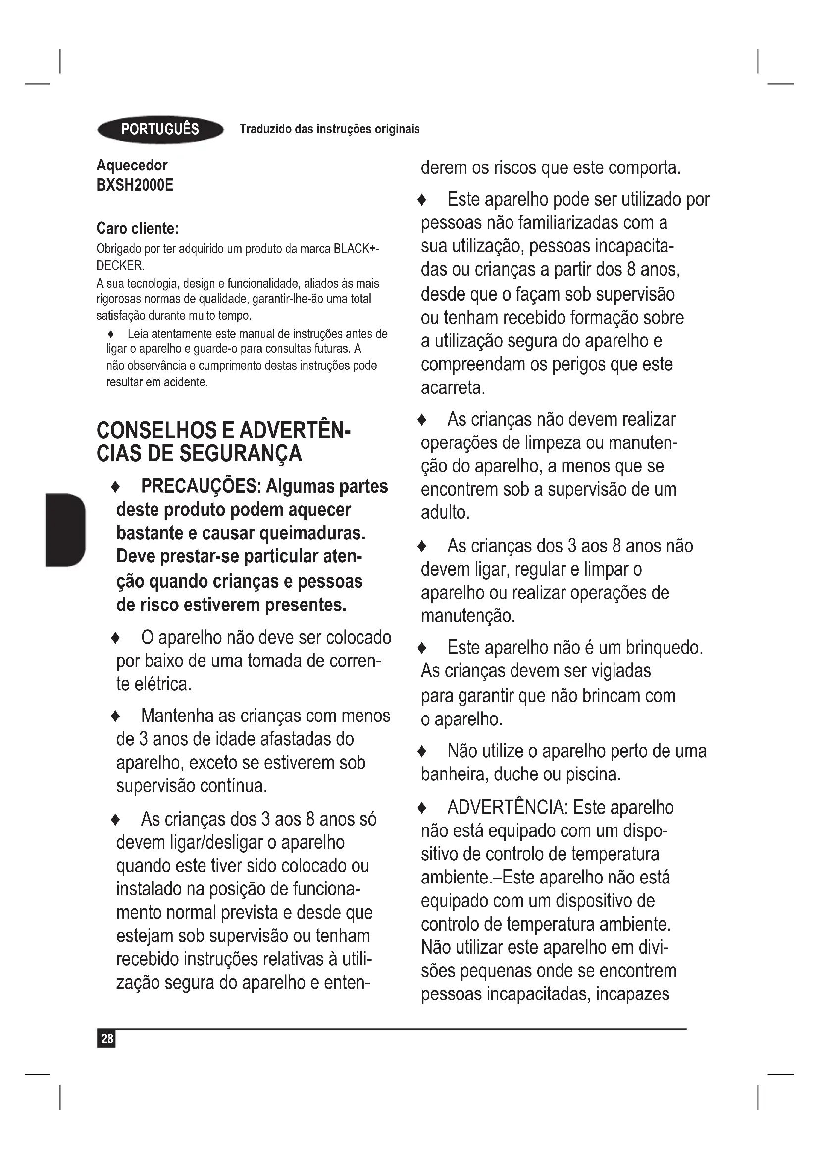 Aquecedor BXSH2000E Caro cliente: Obrigado por ter adquirido um produto da marca BLACK+- DECKER. A sua tecnologia, design e funcionalidade, aliados às mais rigorosas normas de qualidade, garantir-lhe-ão uma total satisfação durante muito tempo. ♦ Leia atentamente este manual de instruções antes de ligar o aparelho e guarde-o para consultas futuras. A não observância e cumprimento destas instruções pode resultar em acidente.