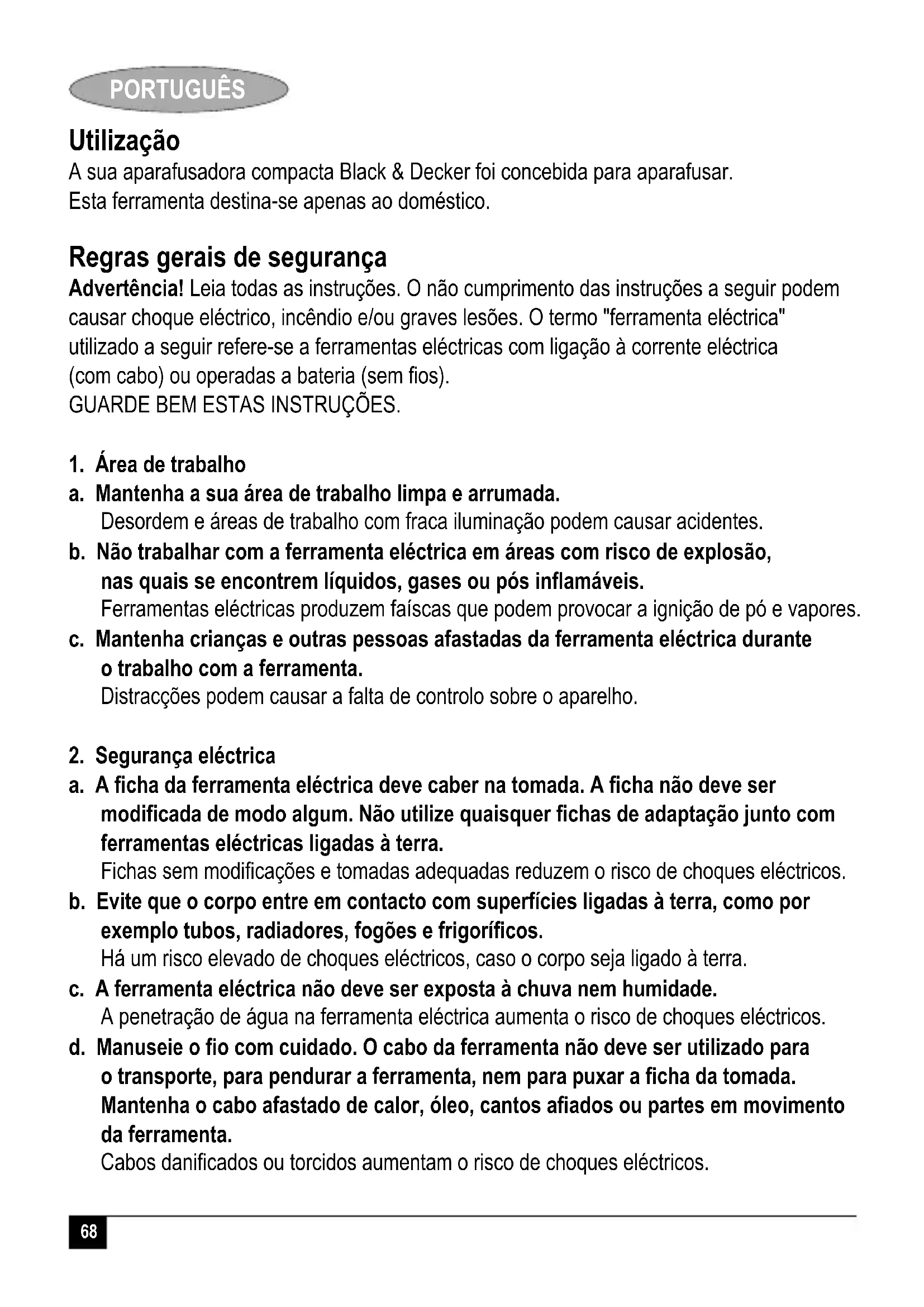 (imprecisão da potência acústica) 3 dB(A) Kevin Hewitt Director de Engenharia do Consumo Spennymoor, County Durham DL16 6JG, Reino Unido 1-12-2006 Garantia A Black & Decker confia na qualidade de seus produtos e oferece um programa de garantia excelente. Esta declaração de garantia soma-se aos seus direitos legais e não os prejudica em nenhum aspecto. A garantia será válida nos territórios dos Estados Membros da União Europeia e na Área de Livre Comércio da Europa. Caso algum produto da Black & Decker apresente avarias devido a defeitos de material, mão-de-obra ou ausência de conformidade no prazo de 24 meses a partir da data de compra, a Black & Decker garantirá a substituição das peças defeituosas, a reparação dos produtos que foram submetidos a uso adequado e remoção ou substituição dos mesmos para assegurar o mínimo de inconvenientes ao cliente a menos que: O produto tenha sido utilizado para fins comerciais, profissionais ou aluguer; O produto tenha sido submetido a uso incorrecto ou descuido; O produto tenha sofrido danos causados por objectos estranhos, substâncias ou acidentes; Tenha um histórico de reparacões efectuadas por terceiros que não sejam os agentes autorizados ou profissionais de manutenção da Black & Decker.78 PORTUGUÊS Para activar a garantia, será necessário enviar a prova de compra ao revendedor ou agente de reparação autorizado. Para verificar a localização do agente de reparação mais próximo de si contacte o escritório local da Black & Decker no endereço indicado neste manual. Se preferir, consulte a lista de agentes autorizados da Black & Decker e os dados completos de nossos serviços de atendimento pós-venda na Internet no endereço: www.2helpU.com Visite o nosso website www.blackanddecker.eu para registar o seu novo produto Black & Decker e para se manter actualizado sobre novos produtos e ofertas especiais. Estão disponíveis mais informações sobre a Black & Decker e sobre a nossa gama de produtos em www.blackanddecker.eu79 SVENSKA Användningsområde Din Black & Decker kompakta skruvdragare är avsedd för skruvdragning. Verktyget är endast avsett som konsumentverktyg. Allmänna säkerhetsregler Varning! Samtliga anvisningar ska läsas. Fel som uppstår till följd av att anvisningarna nedan inte följts kan orsaka elchock, brand och/eller allvarliga kroppsskador. Nedan använt begrepp "Elverktyg" hänför sig till nätdrivna elverktyg (med nätsladd) och till batteridrivna elverktyg (sladdlösa). TA VÄL VARA PÅ SÄKERHETSANVISNINGARNA.