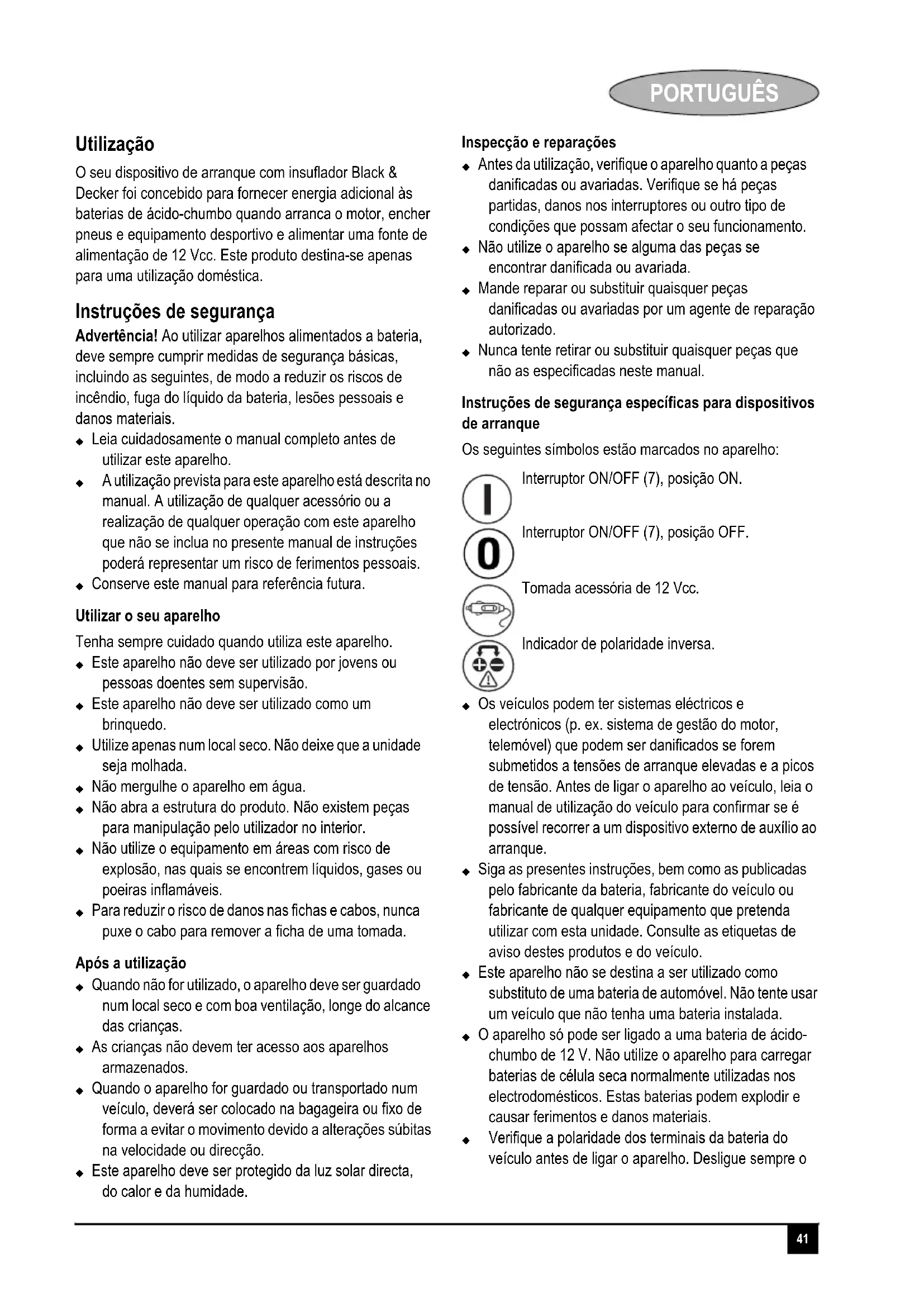 UTILIZAÇÃO Carregar a unidade (fig. A) Esta unidade é fornecida num estado de carga parcial. X Carregue a unidade antes de a utilizar pela primeira vez, usando o adaptador de carregamento da rede eléctrica (11) durante 48 horas. As baterias de ácido-chumbo requerem uma manutenção de rotina para garantir uma carga completa e uma vida útil longa. Todas as baterias perdem energia por auto-descarga ao longo do tempo e com maior rapidez se a temperatura for elevada. Quando a unidade não estiver a ser utilizada, a Black & Decker recomenda o seu carregamento a intervalos mínimos de 60 dias. X Verifique o nível de carga da bateria carregando no botão do estado da bateria (4). O indicador LED do estado de carga (6) indica o nível de carga da bateria. Quando estiver acesa apenas uma luz LED vermelha, carregue a unidade. Nota: O carregamento da bateria após cada utilização prolonga a vida da bateria; as descargas fortes frequentes entre as cargas e/ou o carregamento excessivo diminuem a vida da bateria. A bateria pode ser carregada utilizando o adaptador de carregamento da rede eléctrica (11) ou o adaptador de 12 Vcc do veículo (12). Carregar a unidade com o carregador de rede eléctrica (fig. A) Durante o carregamento da unidade, certifique-se de que o interruptor ON/OFF (7) e a luz de área de LED (10) estão desligados. À medida que decorre o carregamento, as LED vermelhas acendem-se uma a uma. X Carregue a unidade até se acenderem as luzes LED verdes. X Continue o carregamento durante uma ou duas horas. Nota: O carregador da rede eléctrica não deve estar ligado por mais de 60 horas. X Quando o carregamento estiver completo, desligue o adaptador de carregamento da rede eléctrica (11) e arrume-o num lugar seguro. Carregar a unidade com o adaptador de 12 Vcc do veículo (fig. A) Durante o carregamento da unidade, certifique-se de que o interruptor ON/OFF (7) e a luz de área de LED (10) estão desligados. O adaptador de 12 Vcc do veículo (12) não dispõe de carga gradual. Advertência! Durante o carregamento com o adaptador de 12 Vcc do veículo (12): X Não deixe a carregar durante mais de 4 horas, no máximo. X Não deixe o aparelho sem vigilância. Para carregar a unidade com o adaptador de 12 Vcc do veículo (12): X Introduza uma extremidade do adaptador de 12 Vcc do veículo (12) numa tomada acessória de 12 Vcc do veículo ou barco. X Introduza a outra extremidade do adaptador de 12 Vcc do veículo (12) na tomada de carga de 12 Vcc (3) na parte da frente da unidade. X Para verificar o estado de carga da bateria durante o carregamento de corrente contínua, desligue o adaptador de 12 Vcc do veículo da tomada acessória e pressione o botão de estado da bateria. Observe os Apenas deverá ser feita uma utilização interior da base de carga. Leia o manual de instruções antes de utilizar o aparelho.44 PORTUGUÊS LEDs do estado da bateria. Não deixe a carregar durante mais de 3 a 4 horas, no máximo. X Quando o carregamento estiver completo, retire o adaptador de 12 Vcc do veículo (12) e arrume-o num lugar seguro. Advertência! Deverá retirar o adaptador de 12 Vcc da tomada acessória do veículo antes de colocar o motor em funcionamento. A não observância deste procedimento poderá provocar, em alguns casos, o funcionamento contínuo do motor, mesmo depois de retirar a chave da ignição, o que poderá provocar lesões pessoais ou danos materiais. Utilizar a unidade como dispositivo de arranque (fig. A e