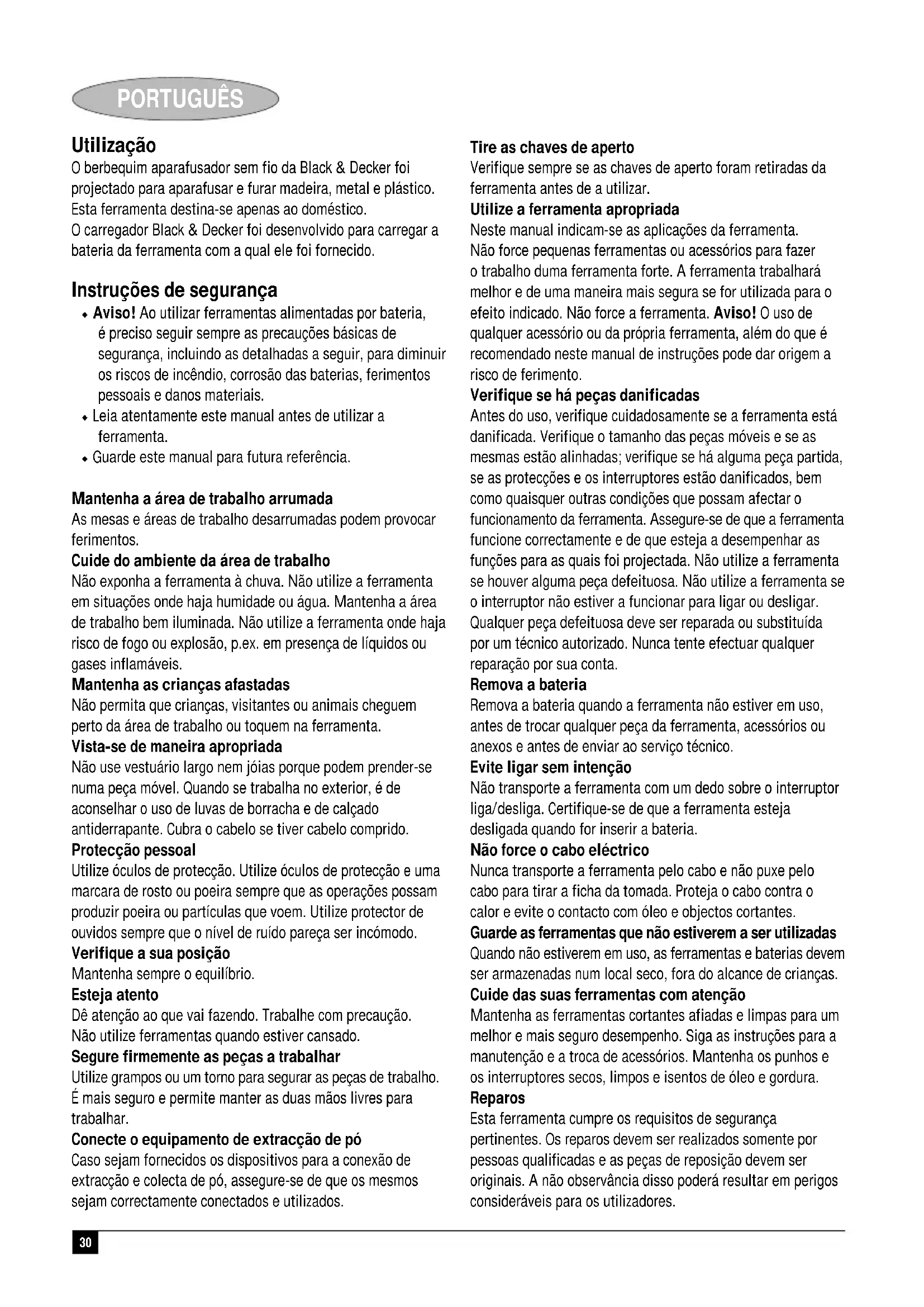 Colin Wills Director of Engineering BDCI, 4/F, 2 Dai Wang Street Tai Po Industrial Estate Tai Po NT, Hong Kong Garantía Black & Decker confía plenamente en la calidad de sus productos y ofrece una garantía extraordinaria. Esta declaración de garantía es una añadido, y en ningún caso un perjuicio para sus derechos estatutarios. La garantía es válida dentro de los territorios de los Estados Miembros de la Unión Europea y de los de la Zona Europea de Libre Comercio. Si un producto Black & Decker resultará defectuoso debido a materiales o mano de obra defectuosos o a la falta de conformidad, Black & Decker garantiza, dentro de los 24 meses de la fecha de compra, la sustitución de las piezas defectuosas, la reparación de los productos sujetos a un desgaste y rotura razonables o la sustitución de tales productos para garantizar al cliente el mínimo de inconvenientes, a menos que: ◆ El producto haya sido utilizado con propósitos comerciales, profesionales o de alquiler; ◆ El producto haya sido sometido a un uso inadecuado o negligente; ◆ El producto haya sufrido daños causados por objetos o sustancias extrañas o accidentes;29 ESPAÑOL ◆ Se hayan realizado reparaciones por parte de personas que no sean los servicios de reparación autorizados o personal de servicios de Black & Decker; Para reclamar en garantía, será necesario que presente la prueba de compra al vendedor o al servicio técnico de reparaciones autorizado. Pueden consultar la dirección de su servicio técnico más cercano poniéndose en contacto con la oficina local de Black & Decker en la dirección que se indica en este manual. Como alternativa, se puede consultar en Internet, en la dirección siguiente, la lista de servicios técnicos autorizados e información completa de nuestros servicios de postventa y contactos: www.2helpU.com.30 PORTUGUÊS Utilização O berbequim aparafusador sem fio da Black & Decker foi projectado para aparafusar e furar madeira, metal e plástico. Esta ferramenta destina-se apenas ao doméstico. O carregador Black & Decker foi desenvolvido para carregar a bateria da ferramenta com a qual ele foi fornecido. Instruções de segurança ◆ Aviso! Ao utilizar ferramentas alimentadas por bateria, é preciso seguir sempre as precauções básicas de segurança, incluindo as detalhadas a seguir, para diminuir os riscos de incêndio, corrosão das baterias, ferimentos pessoais e danos materiais. ◆ Leia atentamente este manual antes de utilizar a ferramenta. ◆ Guarde este manual para futura referência. Mantenha a área de trabalho arrumada As mesas e áreas de trabalho desarrumadas podem provocar ferimentos. Cuide do ambiente da área de trabalho Não exponha a ferramenta à chuva. Não utilize a ferramenta em situações onde haja humidade ou água. Mantenha a área de trabalho bem iluminada. Não utilize a ferramenta onde haja risco de fogo ou explosão, p.ex. em presença de líquidos ou gases inflamáveis. Mantenha as crianças afastadas Não permita que crianças, visitantes ou animais cheguem perto da área de trabalho ou toquem na ferramenta. Vista-se de maneira apropriada Não use vestuário largo nem jóias porque podem prender-se numa peça móvel. Quando se trabalha no exterior, é de aconselhar o uso de luvas de borracha e de calçado antiderrapante. Cubra o cabelo se tiver cabelo comprido. Protecção pessoal Utilize óculos de protecção. Utilize óculos de protecção e uma marcara de rosto ou poeira sempre que as operações possam produzir poeira ou partículas que voem. Utilize protector de ouvidos sempre que o nível de ruído pareça ser incómodo. Verifique a sua posição Mantenha sempre o equilíbrio. Esteja atento Dê atenção ao que vai fazendo. Trabalhe com precaução. Não utilize ferramentas quando estiver cansado. Segure firmemente as peças a trabalhar Utilize grampos ou um torno para segurar as peças de trabalho. É mais seguro e permite manter as duas mãos livres para trabalhar. Conecte o equipamento de extracção de pó Caso sejam fornecidos os dispositivos para a conexão de extracção e colecta de pó, assegure-se de que os mesmos sejam correctamente conectados e utilizados. Tire as chaves de aperto Verifique sempre se as chaves de aperto foram retiradas da ferramenta antes de a utilizar. Utilize a ferramenta apropriada Neste manual indicam-se as aplicações da ferramenta. Não force pequenas ferramentas ou acessórios para fazer o trabalho duma ferramenta forte. A ferramenta trabalhará melhor e de uma maneira mais segura se for utilizada para o efeito indicado. Não force a ferramenta. Aviso! O uso de qualquer acessório ou da própria ferramenta, além do que é recomendado neste manual de instruções pode dar origem a risco de ferimento. Verifique se há peças danificadas Antes do uso, verifique cuidadosamente se a ferramenta está danificada. Verifique o tamanho das peças móveis e se as mesmas estão alinhadas; verifique se há alguma peça partida, se as protecções e os interruptores estão danificados, bem como quaisquer outras condições que possam afectar o funcionamento da ferramenta. Assegure-se de que a ferramenta funcione correctamente e de que esteja a desempenhar as funções para as quais foi projectada. Não utilize a ferramenta se houver alguma peça defeituosa. Não utilize a ferramenta se o interruptor não estiver a funcionar para ligar ou desligar. Qualquer peça defeituosa deve ser reparada ou substituída por um técnico autorizado. Nunca tente efectuar qualquer reparação por sua conta. Remova a bateria Remova a bateria quando a ferramenta não estiver em uso, antes de trocar qualquer peça da ferramenta, acessórios ou anexos e antes de enviar ao serviço técnico. Evite ligar sem intenção Não transporte a ferramenta com um dedo sobre o interruptor liga/desliga. Certifique-se de que a ferramenta esteja desligada quando for inserir a bateria. Não force o cabo eléctrico Nunca transporte a ferramenta