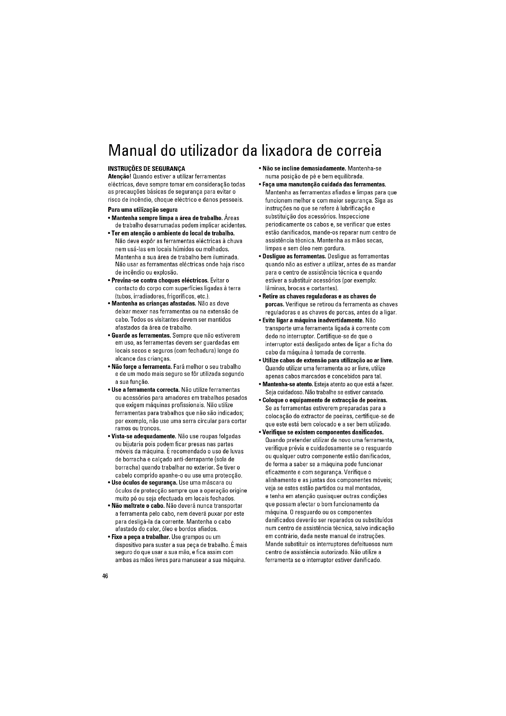 Não exerça uma força excessiva ao utilizar a lixadora. Se o fizer poderá causar o sobreaquecimento da mesma, e danificar o motor ou a peça de trabalho. Se a lixadora aquecer demasiado, faça-a funcionar sem carga durante 2 minutos. Mantenha sempre as entradas de ar desobtruídas. Para limpar a lixadora, proceda da seguinte forma: Desligue a ficha da tomada de corrente. Utilize um pincel seco e limpo para limpar os orifícios de ventilação e as condutas. Limpe o exterior50 PORTUGUÊS utilizando um tecido limpo e húmido (não use solventes, petróleo ou terebintina). Para limpar a correia de lixar encoste uma escova de arame à correia, e mantenha a lixadora a funcionar durante alguns instantes.