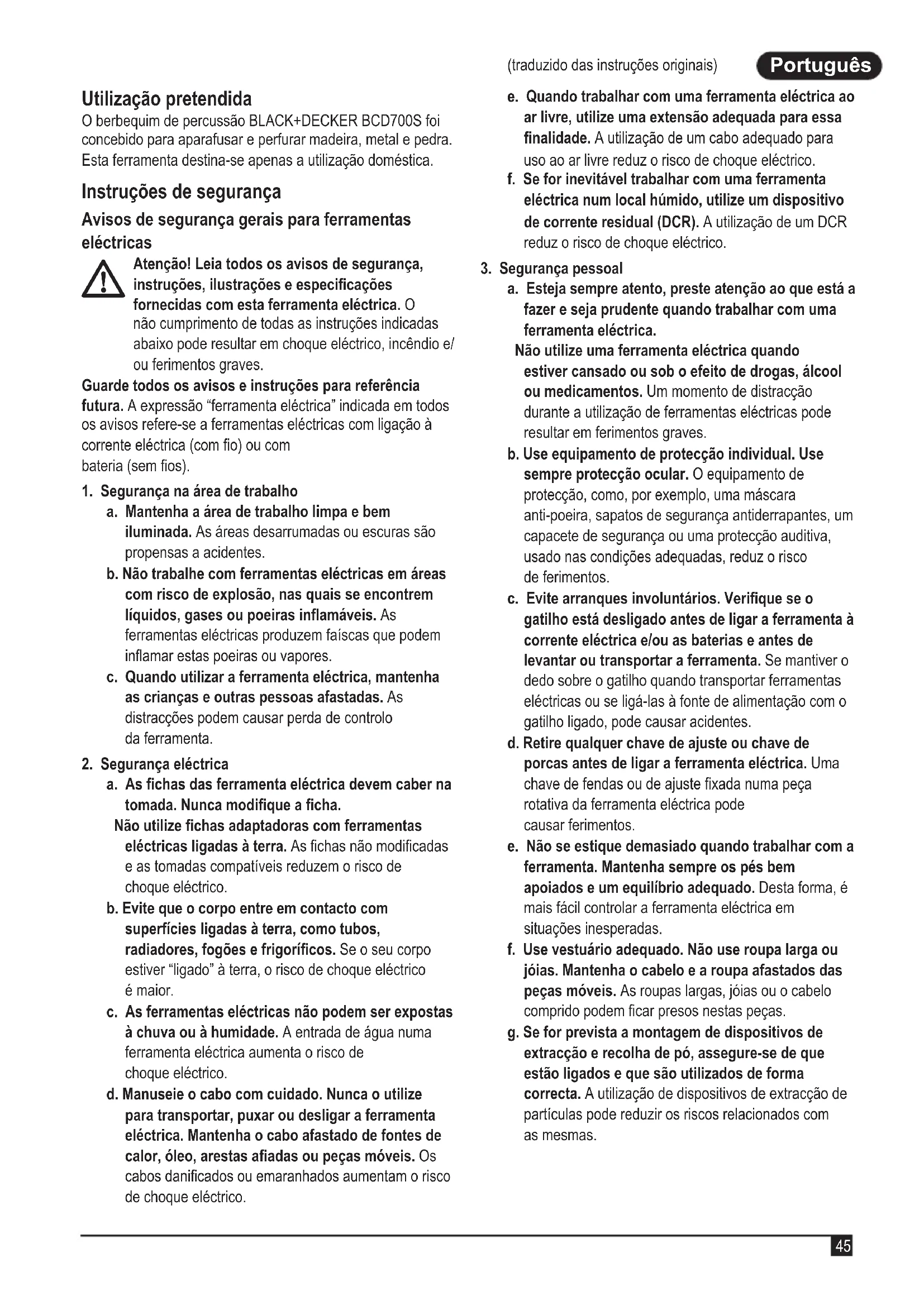 (traduzido das instruções originais) Português (traduzido das instruções originais) Utilização pretendida O berbequim de percussão BLACK+DECKER BCD700S foi concebido para aparafusar e perfurar madeira, metal e pedra. Esta ferramenta destina-se apenas a utilização doméstica. Instruções de segurança Avisos de segurança gerais para ferramentas eléctricas