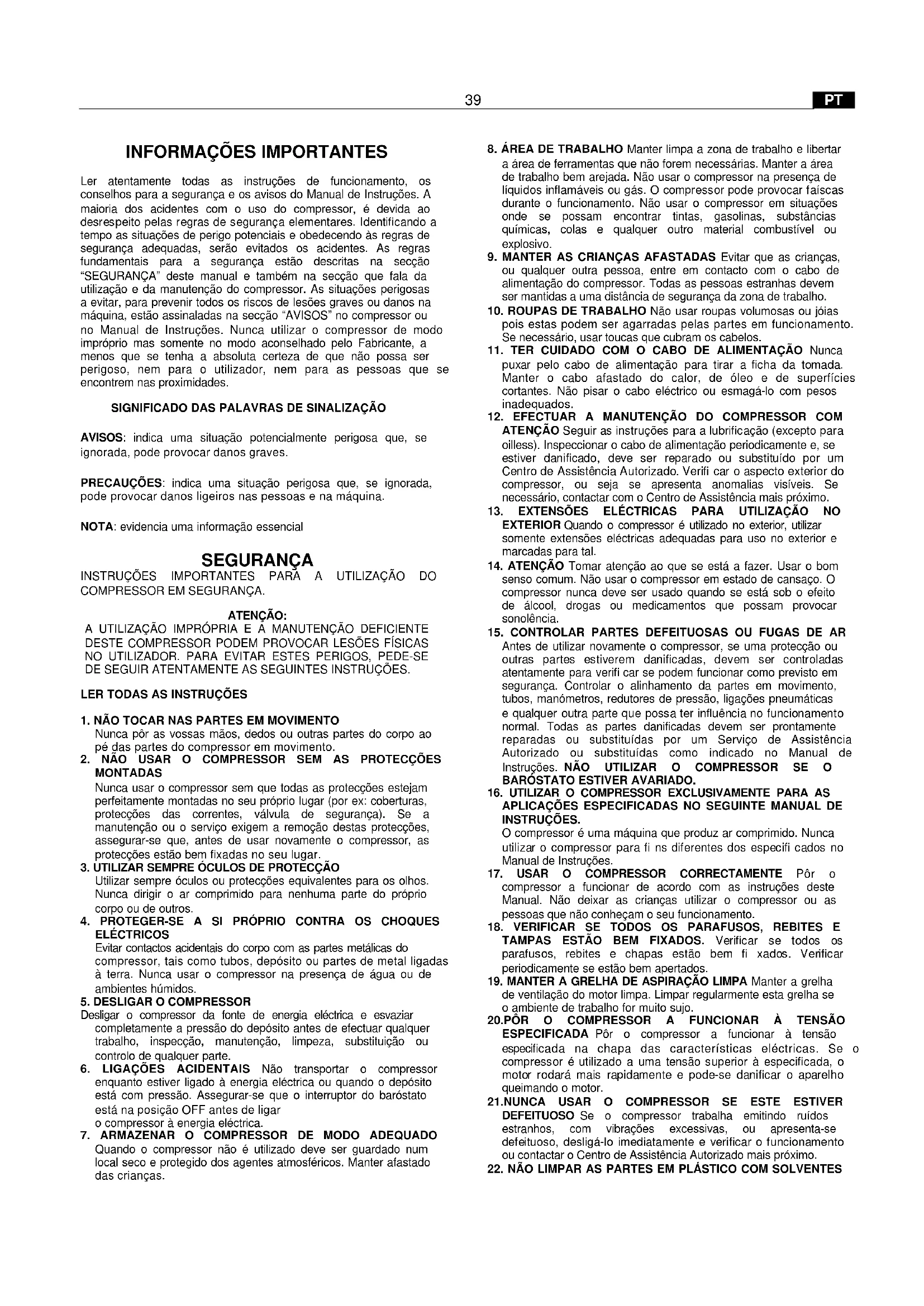 Ler atentamente todas as instruções de funcionamento, os conselhos para a segurança e os avisos do Manual de Instruções. A maioria dos acidentes com o uso do compressor, é devida ao desrespeito pelas regras de segurança elementares. Identificando a tempo as situações de perigo potenciais e obedecendo às regras de segurança adequadas, serão evitados os acidentes. As regras fundamentais para a segurança estão descritas na secção “SEGURANÇA” deste manual e também na secção que fala da utilização e da manutenção do compressor. As situações perigosas a evitar, para prevenir todos os riscos de lesões graves ou danos na máquina, estão assinaladas na secção “AVISOS” no compressor ou no Manual de Instruções. Nunca utilizar o compressor de modo impróprio mas somente no modo aconselhado pelo Fabricante, a menos que se tenha a absoluta certeza de que não possa ser perigoso, nem para o utilizador, nem para as pessoas que se encontrem nas proximidades.