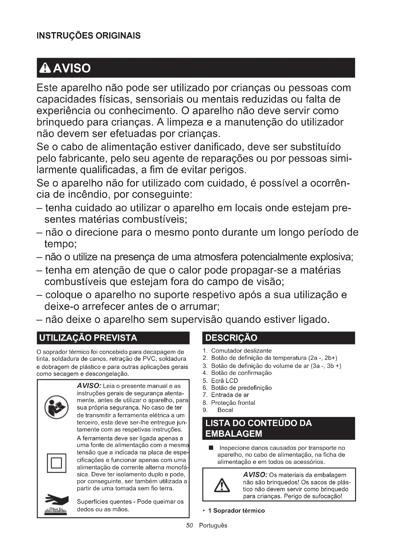 O soprador térmico foi concebido para decapagem de tinta, soldadura de canos, retração de PVC, soldadura e dobragem de plástico e para outras aplicações gerais como secagem e descongelação. AVISO: Leia o presente manual e as instruções gerais de segurança atenta- mente, antes de utilizar o aparelho, para sua própria segurança. No caso de ter de transmitir a ferramenta elétrica a um terceiro, esta deve ser-lhe entregue jun- tamente com as respetivas instruções. A ferramenta deve ser ligada apenas a uma fonte de alimentação com a mesma tensão que a indicada na placa de espe- cicações e funcionar apenas com uma alimentação de corrente alterna monofá- sica. Deve ter isolamento duplo e pode, por conseguinte, ser também utilizada a partir de uma tomada sem o terra. Superfícies quentes - Pode queimar os dedos ou as mãos. DESCRIÇÃO