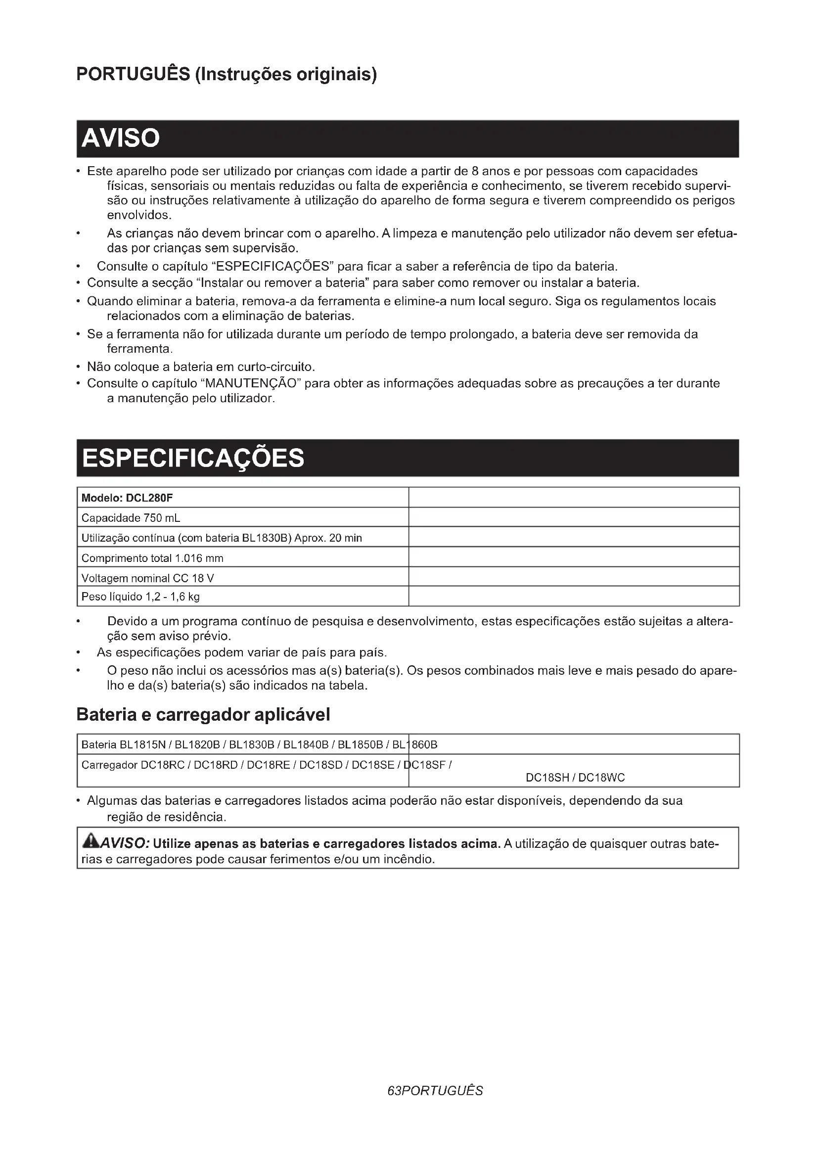 - Consulte o capítulo “MANUTENÇÃO” para obter as informações adequadas sobre as precauções a ter durante a manutenção pelo utilizador. ESPECIFICAÇÕES Modelo: DCL280F Capacidade 750 mL Utilização contínua (com bateria BL1830B) Aprox. 20 min Comprimento total 1.016 mm Voltagem nominal CC 18 V Peso líquido 1,2 - 1,6 kg