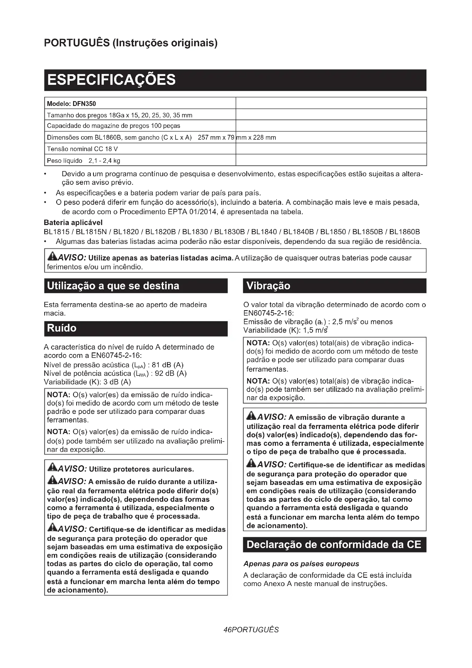 NOTA:O(s)valor(es)total(ais)devibraçãoindica- do(s) foi medido de acordo com um método de teste padrão e pode ser utilizado para comparar duas ferramentas. NOTA:O(s)valor(es)total(ais)devibraçãoindica- do(s)podetambémserutilizadonaavaliaçãoprelimi- nar da exposição. AVISO: A emissão de vibração durante a utilização real da ferramenta elétrica pode diferir do(s) valor(es) indicado(s), dependendo das for- mas como a ferramenta é utilizada, especialmente o tipo de peça de trabalho que é processada. AVISO: Certique-se de identicar as medidas de segurança para proteção do operador que sejam baseadas em uma estimativa de exposição em condições reais de utilização (considerando todas as partes do ciclo de operação, tal como quando a ferramenta está desligada e quando está a funcionar em marcha lenta além do tempo de acionamento). Declaração de conformidade da CE Apenas para os países europeus AdeclaraçãodeconformidadedaCEestáincluída comoAnexoAnestemanualdeinstruções.47 PORTUGUÊS