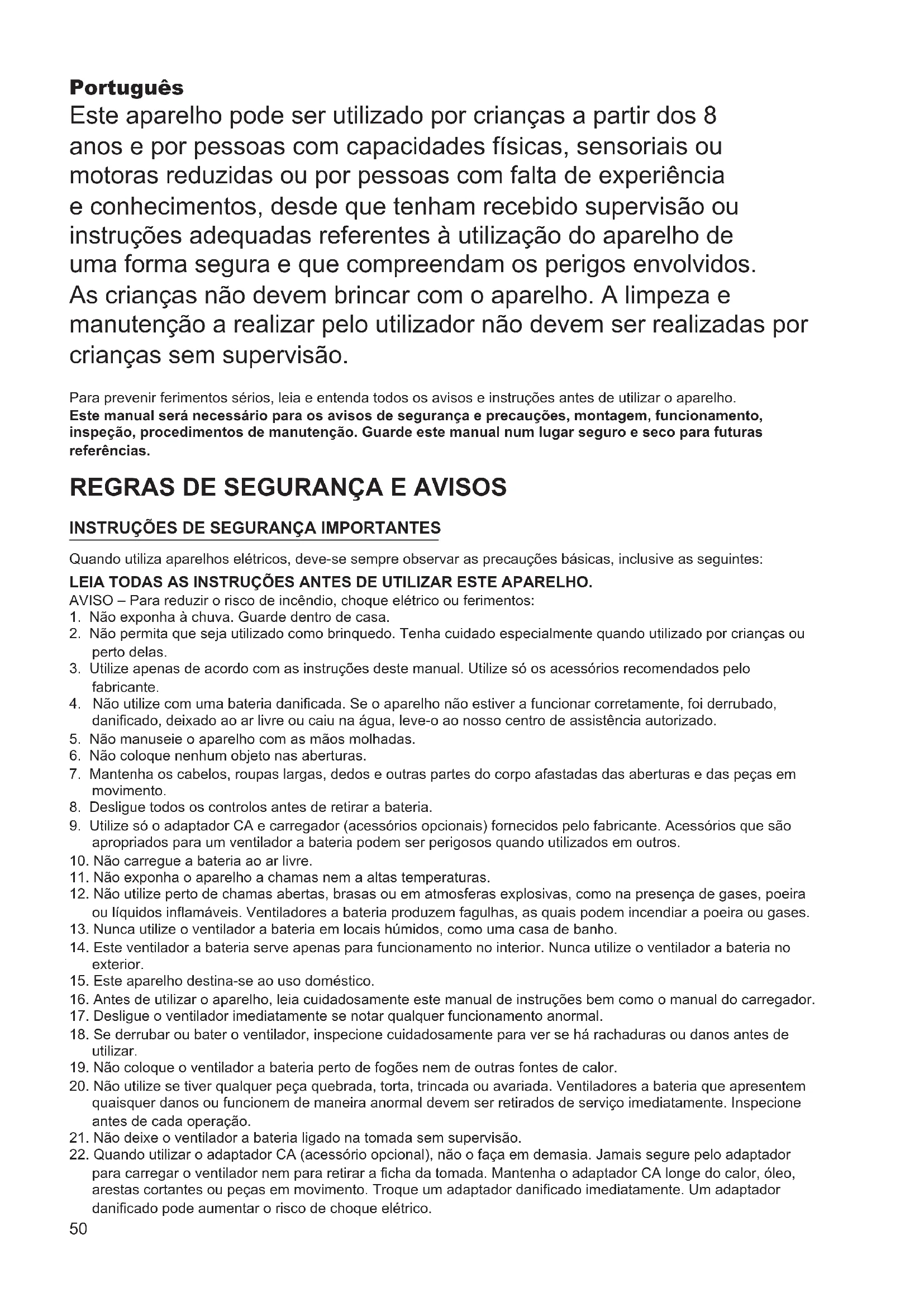 21. Não deixe o ventilador a bateria ligado na tomada sem supervisão.