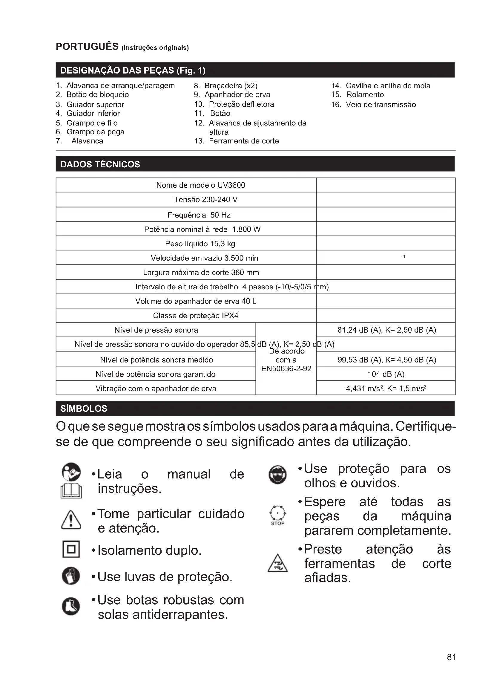 Largura máxima de corte 360 mm Intervalo de altura de trabalho 4 passos (-10/-5/0/5 mm) Volume do apanhador de erva 40 L Classe de proteção IPX4 Nível de pressão sonora De acordo com a EN50636-2-92 81,24 dB (A), K= 2,50 dB (A) Nível de pressão sonora no ouvido do operador 85,5 dB (A), K= 2,50 dB (A) Nível de potência sonora medido 99,53 dB (A), K= 4,50 dB (A) Nível de potência sonora garantido 104 dB (A) Vibração com o apanhador de erva 4,431 m/s