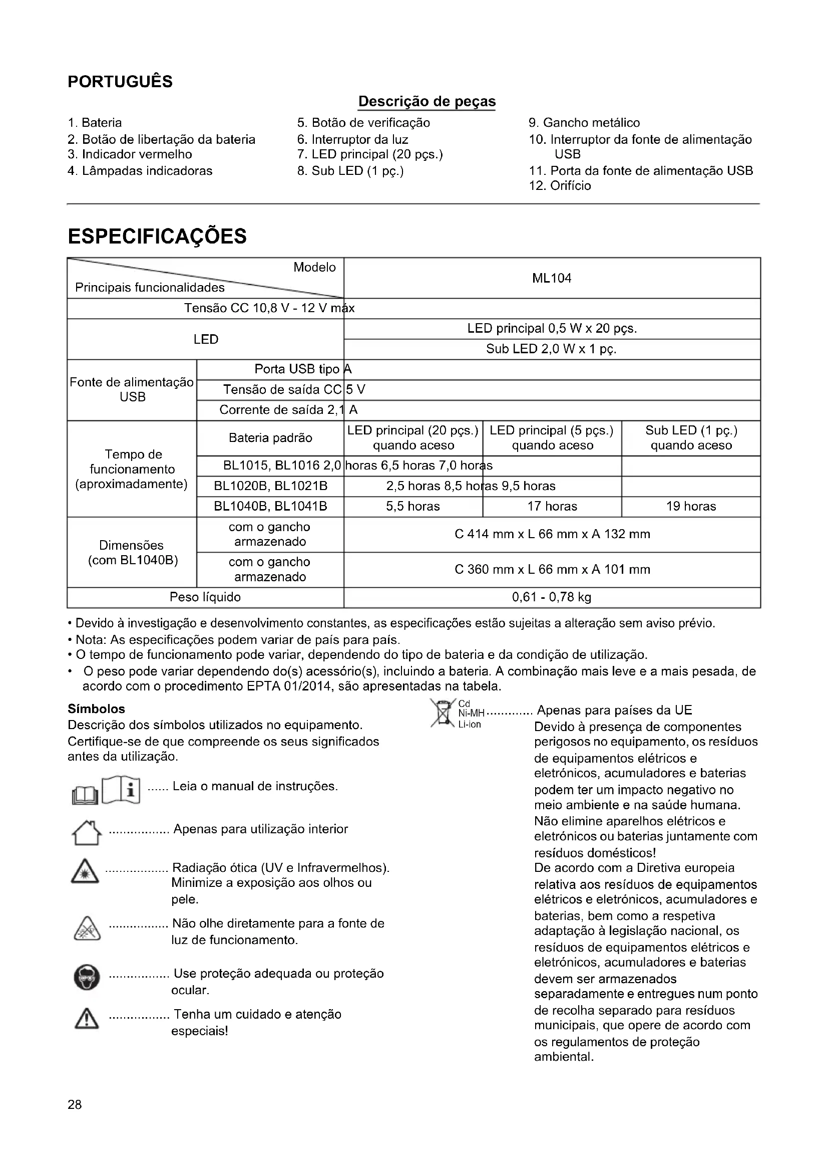Modelo ML104 Principais funcionalidades Tensão CC 10,8 V - 12 V máx LED LED principal 0,5 W x 20 pçs. Sub LED 2,0 W x 1 pç. Fonte de alimentação USB Porta USB tipo A Tensão de saída CC 5 V Corrente de saída 2,1 A Tempo de funcionamento (aproximadamente) Bateria padrão LED principal (20 pçs.) quando aceso LED principal (5 pçs.) quando aceso Sub LED (1 pç.) quando aceso BL1015, BL1016 2,0 horas 6,5 horas 7,0 horas BL1020B, BL1021B 2,5 horas 8,5 horas 9,5 horas BL1040B, BL1041B 5,5 horas 17 horas 19 horas Dimensões (com BL1040B) com o gancho armazenado C 414 mm x L 66 mm x A 132 mm com o gancho armazenado C 360 mm x L 66 mm x A 101 mm Peso líquido 0,61 - 0,78 kg
