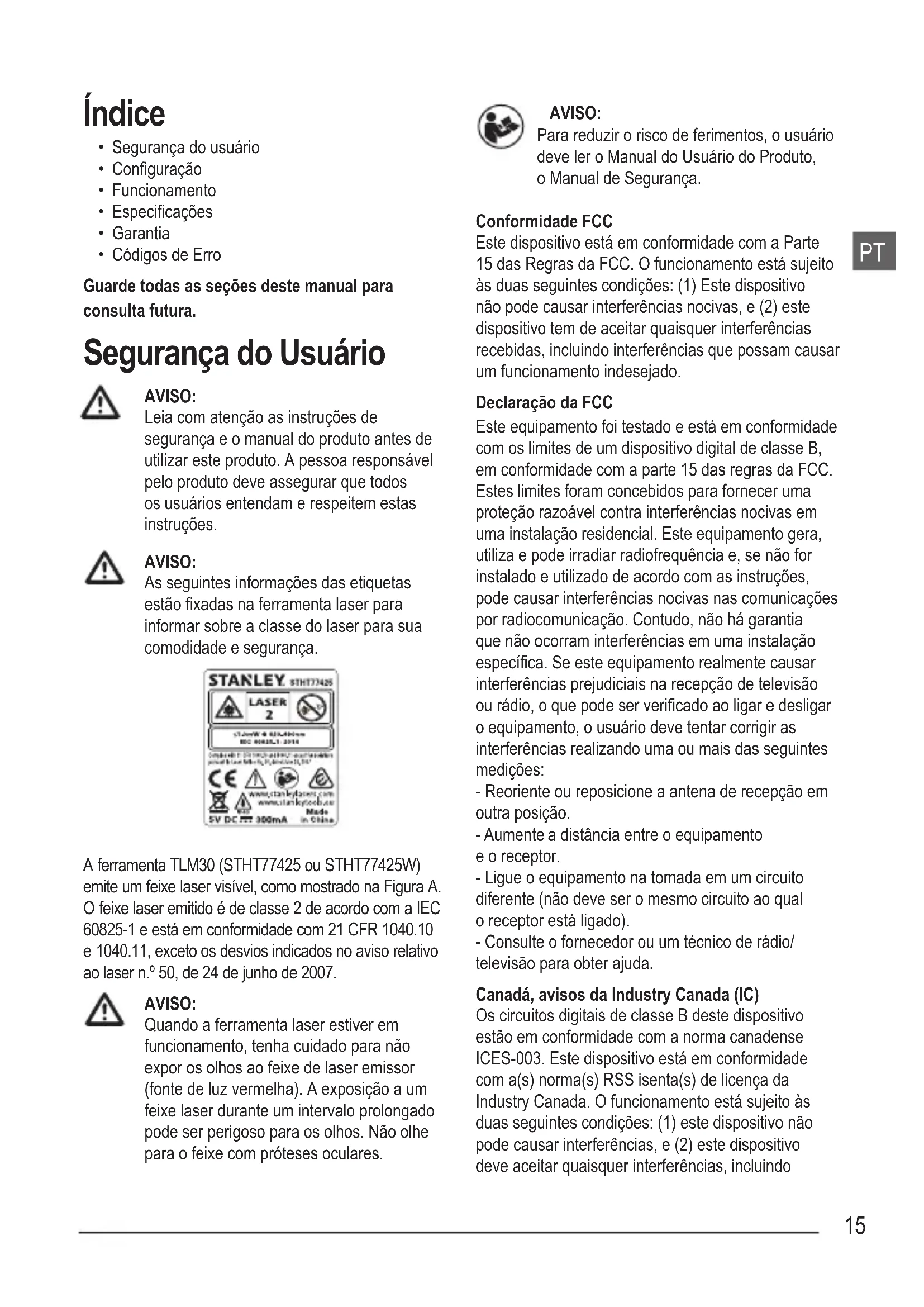 - Códigos de Erro Guarde todas as seções deste manual para consulta futura. Segurança do Usuário AVISO: Leia com atenção as instruções de segurança e o manual do produto antes de utilizar este produto. A pessoa responsável pelo produto deve assegurar que todos os usuários entendam e respeitem estas instruções. AVISO: As seguintes informações das etiquetas estão xadas na ferramenta laser para informar sobre a classe do laser para sua comodidade e segurança. A ferramenta TLM30 (STHT77425 ou STHT77425W) emite um feixe laser visível, como mostrado na Figura A. O feixe laser emitido é de classe 2 de acordo com a IEC 60825-1 e está em conformidade com 21 CFR 1040.10 e 1040.11, exceto os desvios indicados no aviso relativo ao laser n.º 50, de 24 de junho de 2007. AVISO: Quando a ferramenta laser estiver em funcionamento, tenha cuidado para não expor os olhos ao feixe de laser emissor (fonte de luz vermelha). A exposição a um feixe laser durante um intervalo prolongado pode ser perigoso para os olhos. Não olhe para o feixe com próteses oculares. AVISO: Para reduzir o risco de ferimentos, o usuário deve ler o Manual do Usuário do Produto, o Manual de Segurança. Conformidade FCC Este dispositivo está em conformidade com a Parte 15 das Regras da FCC. O funcionamento está sujeito às duas seguintes condições: (1) Este dispositivo não pode causar interferências nocivas, e (2) este dispositivo tem de aceitar quaisquer interferências recebidas, incluindo interferências que possam causar um funcionamento indesejado. Declaração da FCC Este equipamento foi testado e está em conformidade com os limites de um dispositivo digital de classe B, em conformidade com a parte 15 das regras da FCC. Estes limites foram concebidos para fornecer uma proteção razoável contra interferências nocivas em uma instalação residencial. Este equipamento gera, utiliza e pode irradiar radiofrequência e, se não for instalado e utilizado de acordo com as instruções, pode causar interferências nocivas nas comunicações por radiocomunicação. Contudo, não há garantia que não ocorram interferências em uma instalação especíca. Se este equipamento realmente causar interferências prejudiciais na recepção de televisão ou rádio, o que pode ser vericado ao ligar e desligar o equipamento, o usuário deve tentar corrigir as interferências realizando uma ou mais das seguintes medições: - Reoriente ou reposicione a antena de recepção em outra posição. - Aumente a distância entre o equipamento e o receptor. - Ligue o equipamento na tomada em um circuito diferente (não deve ser o mesmo circuito ao qual o receptor está ligado). - Consulte o fornecedor ou um técnico de rádio/ televisão para obter ajuda. Canadá, avisos da Industry Canada (IC) Os circuitos digitais de classe B deste dispositivo estão em conformidade com a norma canadense ICES-003. Este dispositivo está em conformidade com a(s) norma(s) RSS isenta(s) de licença da Industry Canada. O funcionamento está sujeito às duas seguintes condições: (1) este dispositivo não pode causar interferências, e (2) este dispositivo deve aceitar quaisquer interferências, incluindoPT