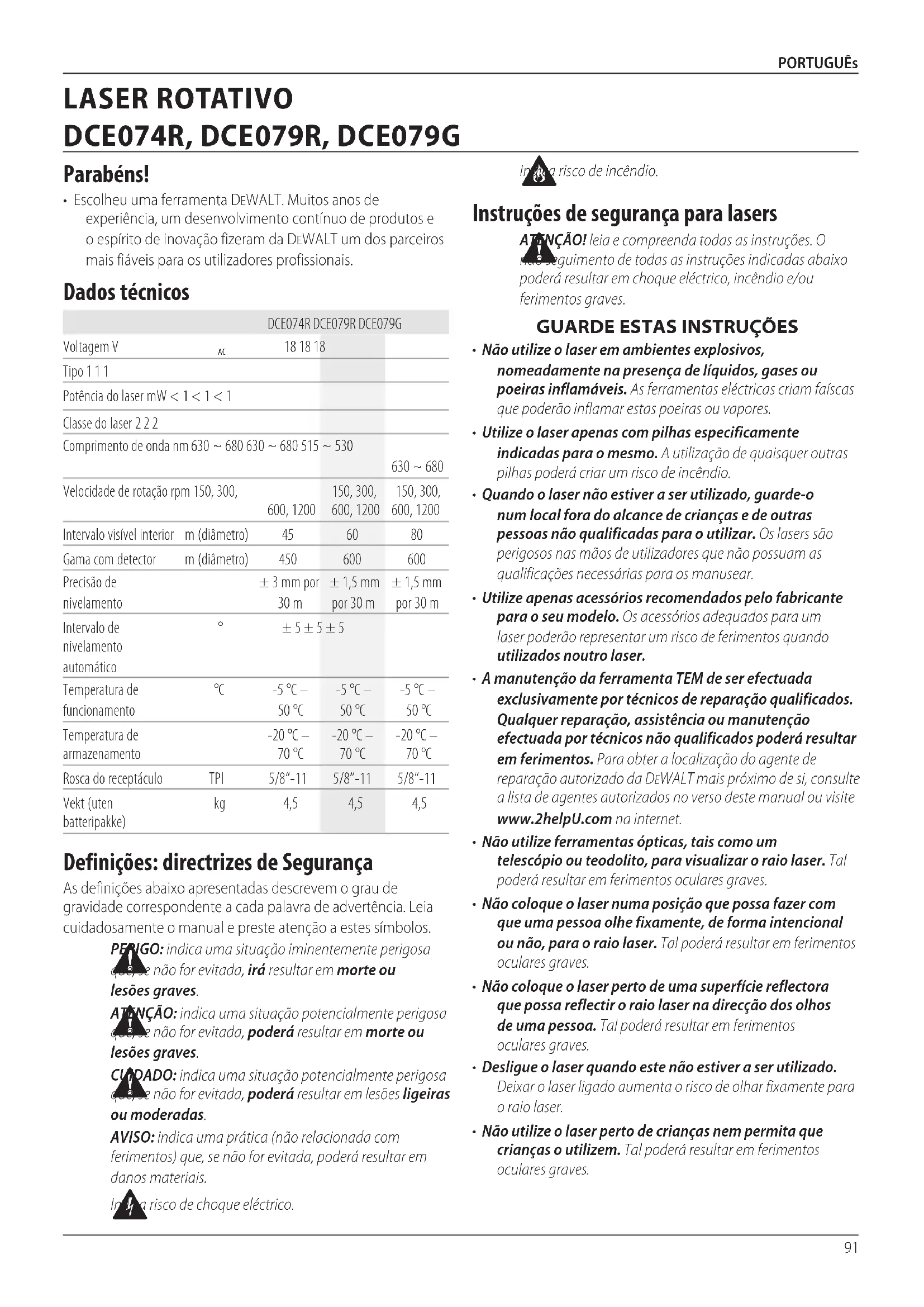Botão para baixo/direita94 PORTUGUês Utilização adequada O laser rotativo DCE074R/DCE079R/DCE079G foi concebido para projectar linhas laser de orientação para aplicações profissionais. A ferramenta pode ser utilizada tanto em interiores como em exteriores para alinhamento (nivelamento) horizontal e vertical. A ferramenta também pode produzir um ponto laser fixo que pode ser direccionado manualmente para estabelecer ou transferir uma marca. As aplicações abrangem a instalação de tectos falsos, o traçado de paredes, o nivelamento de alicerces e a construção de pisos. nÃO utilize a ferramenta em ambientes húmidos ou na presença de gases ou líquidosinflamáveis. Este laser é uma ferramenta profissional. nÃO permita que crianças entrem em contacto com as mesmas. É necessária supervisão quando estas ferramentas forem manuseadas por utilizadores inexperientes.