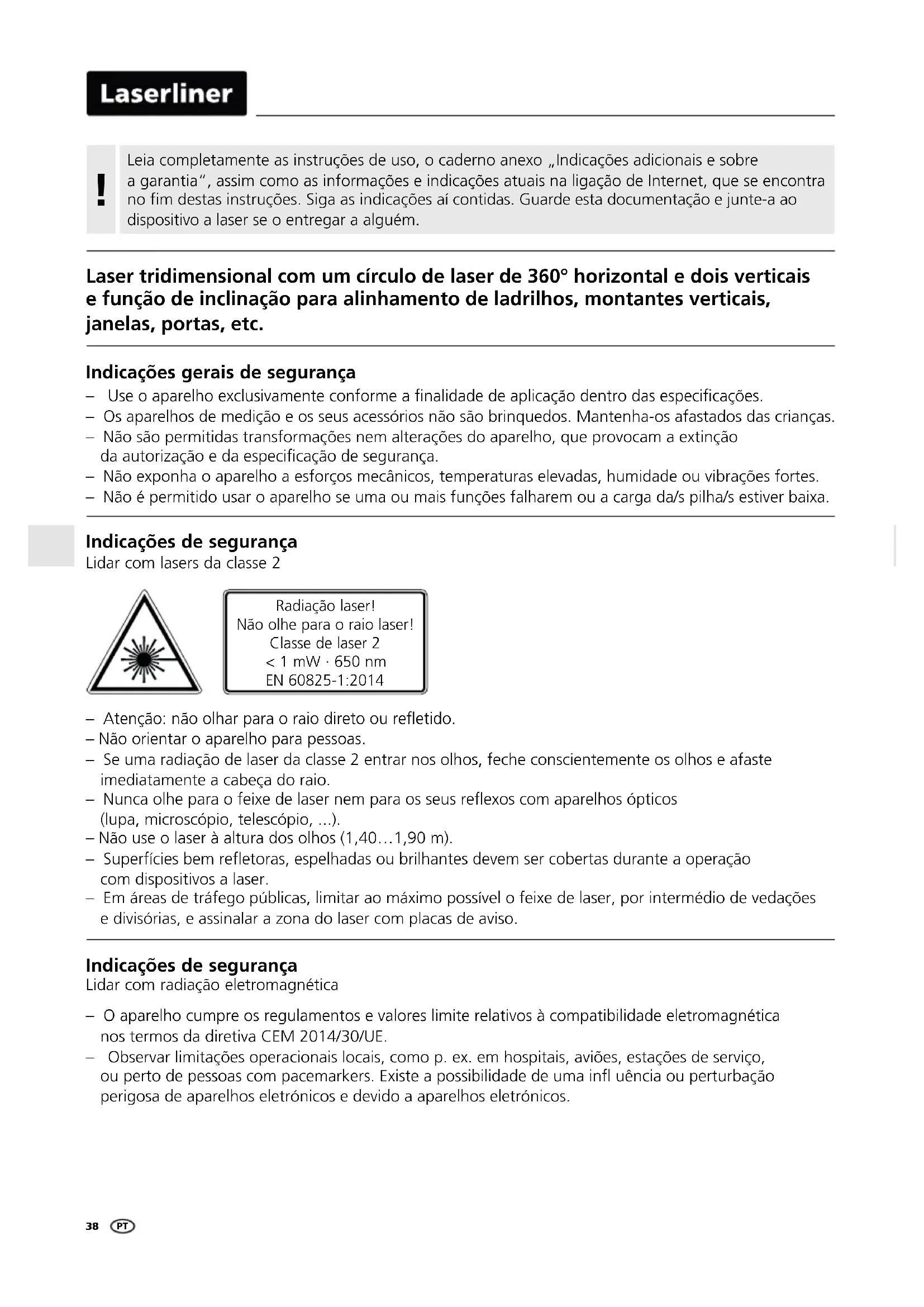 FI38 Indicações de segurança Lidar com radiação eletromagnética – O aparelho cumpre os regulamentos e valores limite relativos à compatibilidade eletromagnética nos termos da diretiva CEM 2014/30/UE. – Observar limitações operacionais locais, como p. ex. em hospitais, aviões, estações de serviço, NTODQSNCDODRRN@RBNLO@BDL@QJDQR$WHRSD@ONRRHAHKHC@CDCDTL@HM×T±MBH@NTODQSTQA@®ªN perigosa de aparelhos eletrónicos e devido a aparelhos eletrónicos. m SDM®ªNMªNNKG@QO@Q@NQ@HNCHQDSNNTQD×DSHCN – Não orientar o aparelho para pessoas. – Se uma radiação de laser da classe 2 entrar nos olhos, feche conscientemente os olhos e afaste imediatamente a cabeça do raio. m-TMB@NKGDO@Q@NEDHWDCDK@RDQMDLO@Q@NRRDTRQD×DWNRBNL@O@QDKGNR¹OSHBNR (lupa, microscópio, telescópio, ...). – Não use o laser à altura dos olhos (1,40…1,90 m). m2TODQE´BHDRADLQD×DSNQ@RDRODKG@C@RNTAQHKG@MSDRCDUDLRDQBNADQS@RCTQ@MSD@NODQ@®ªN com dispositivos a laser. – Em áreas de tráfego públicas, limitar ao máximo possível o feixe de laser, por intermédio de vedações e divisórias, e assinalar a zona do laser com placas de aviso. Radiação laser! Não olhe para o raio laser! Classe de laser 2 < 1 mW · 650 nm EN 60825-1:2014 Indicações de segurança Lidar com lasers da classe 2 Indicações gerais de segurança m4RDN@O@QDKGNDWBKTRHU@LDMSDBNMENQLD@ÖM@KHC@CDCD@OKHB@®ªNCDMSQNC@RDRODBHÖB@®»DR – Os aparelhos de medição e os seus acessórios não são brinquedos. Mantenha-os afastados das crianças. – Não são permitidas transformações nem alterações do aparelho, que provocam a extinção C@@TSNQHY@®ªNDC@DRODBHÖB@®ªNCDRDFTQ@M®@ – Não exponha o aparelho a esforços mecânicos, temperaturas elevadas, humidade ou vibrações fortes. – Não é permitido usar o aparelho se uma ou mais funções falharem ou a carga da/s pilha/s estiver baixa. Laser tridimensional com um círculo de laser de 360° horizontal e dois verticais e função de inclinação para alinhamento de ladrilhos, montantes verticais, janelas, portas, etc. Leia completamente as instruções de uso, o caderno anexo „Indicações adicionais e sobre a garantia“, assim como as informações e indicações atuais na ligação de Internet, que se encontra no fim destas instruções. Siga as indicações aí contidas. Guarde esta documentação e junte-a ao dispositivo a laser se o entregar a alguém.