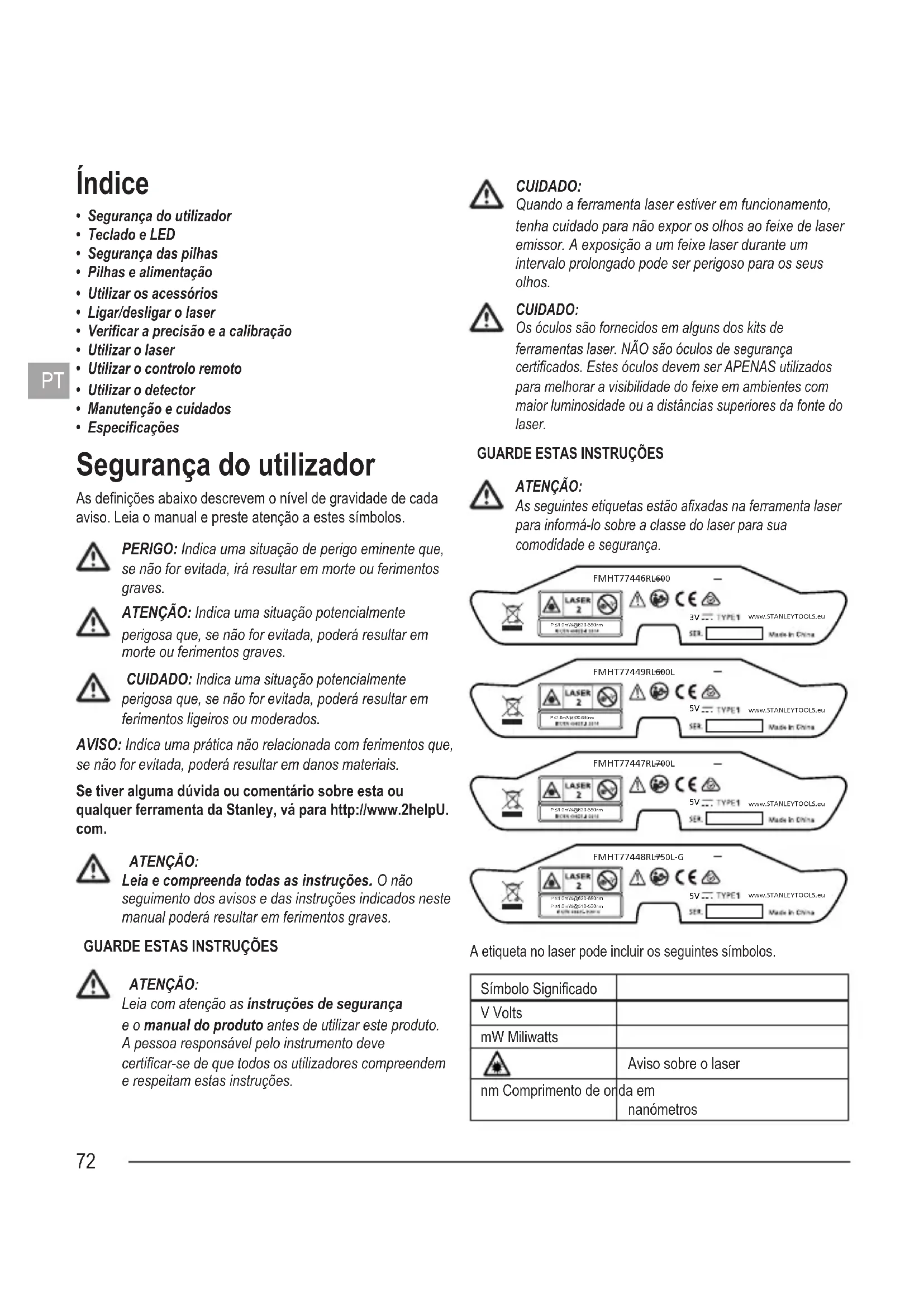 www.STANLEYTOOLS.euP ≤1.0mW@630-680nmP ≤1.0mW@510-530nm A etiqueta no laser pode incluir os seguintes símbolos. Símbolo Signicado V Volts mW Miliwatts Aviso sobre o laser nm Comprimento de onda em nanómetros73