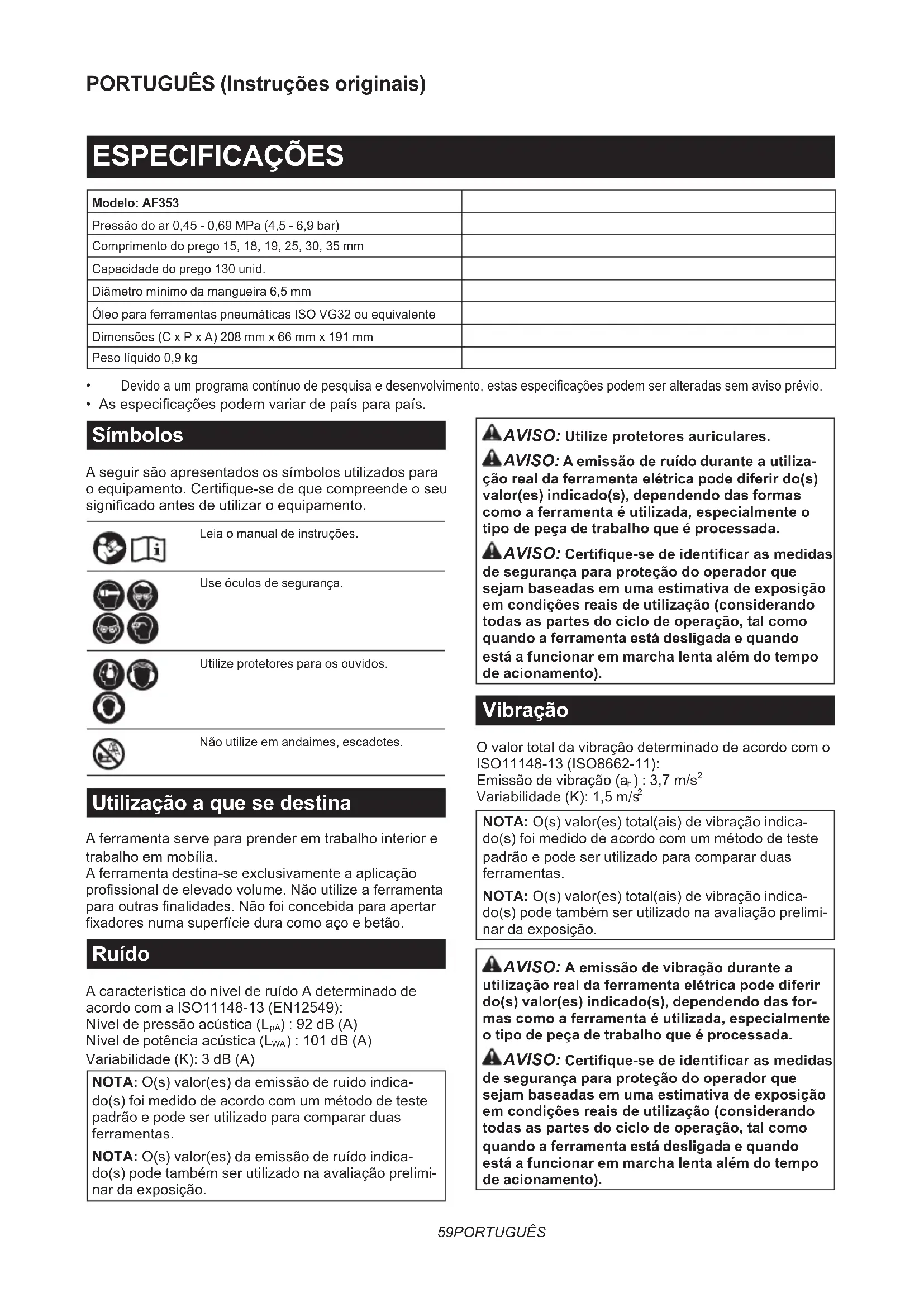 - As especicações podem variar de país para país. Símbolos A seguir são apresentados os símbolos utilizados para o equipamento. Certique-se de que compreende o seu signicado antes de utilizar o equipamento. Leia o manual de instruções. Use óculos de segurança. Utilize protetores para os ouvidos. Não utilize em andaimes, escadotes. Utilização a que se destina A ferramenta serve para prender em trabalho interior e trabalho em mobília. A ferramenta destina-se exclusivamente a aplicação prossional de elevado volume. Não utilize a ferramenta para outras nalidades. Não foi concebida para apertar xadores numa superfície dura como aço e betão. Ruído A característica do nível de ruído A determinado de acordo com a ISO11148-13 (EN12549): Nível de pressão acústica (L