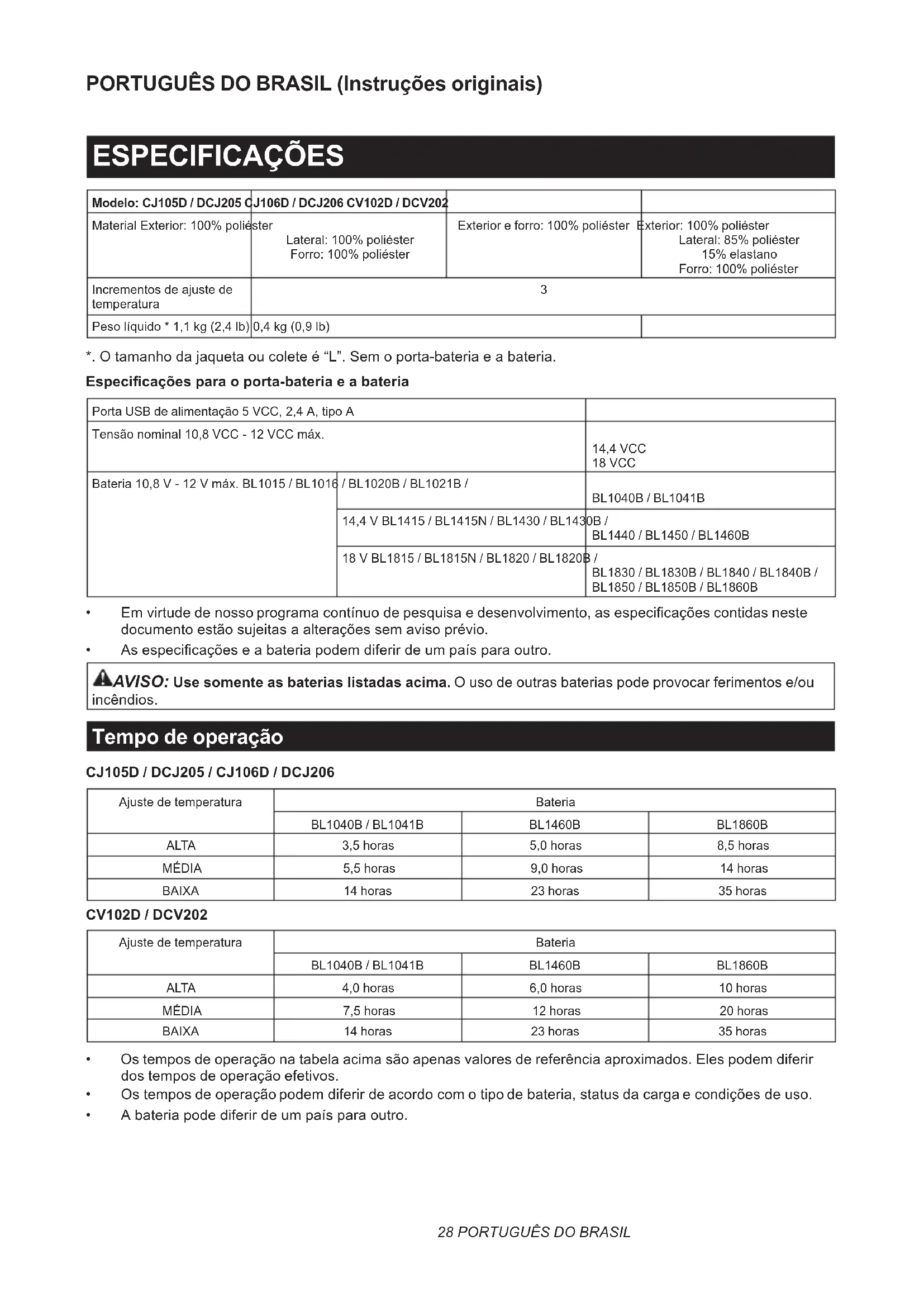 - Use a jaqueta de acordo com estas instruções, levando em conta as condições de trabalho e o trabalho a ser realizado. O uso da jaqueta para operações diferentes daquelas às quais se destina pode resultar em situações perigosas.
