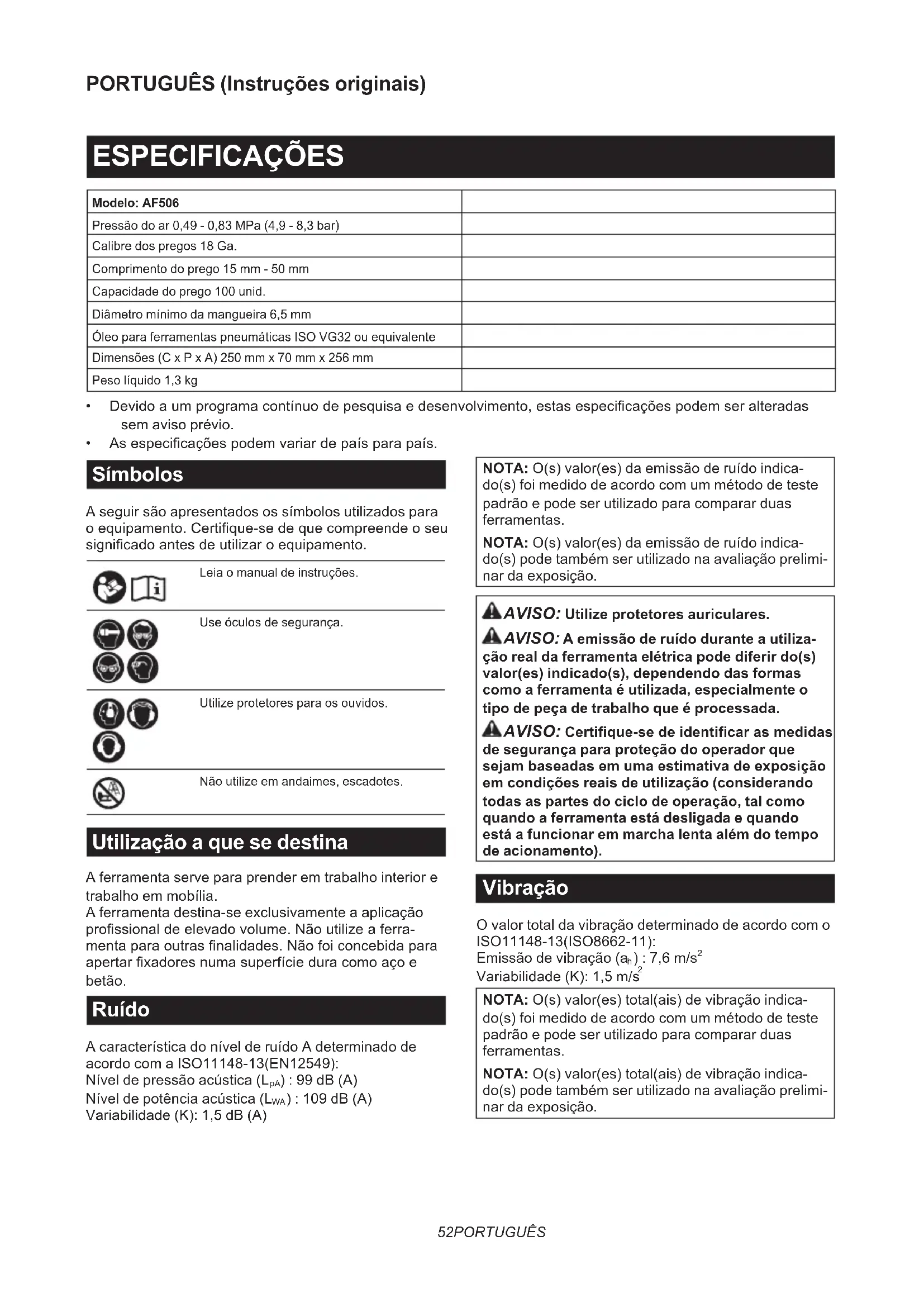 ) : 109 dB (A) Variabilidade (K): 1,5 dB (A) NOTA: O(s) valor(es) da emissão de ruído indica- do(s) foi medido de acordo com um método de teste padrão e pode ser utilizado para comparar duas ferramentas. NOTA: O(s) valor(es) da emissão de ruído indica- do(s) pode também ser utilizado na avaliação prelimi- nar da exposição. AVISO: Utilize protetores auriculares. AVISO: A emissão de ruído durante a utiliza- ção real da ferramenta elétrica pode diferir do(s) valor(es) indicado(s), dependendo das formas como a ferramenta é utilizada, especialmente o tipo de peça de trabalho que é processada. AVISO: Certique-se de identicar as medidas de segurança para proteção do operador que sejam baseadas em uma estimativa de exposição em condições reais de utilização (considerando todas as partes do ciclo de operação, tal como quando a ferramenta está desligada e quando está a funcionar em marcha lenta além do tempo de acionamento). Vibração O valor total da vibração determinado de acordo com o ISO11148-13(ISO8662-11): Emissão de vibração (a