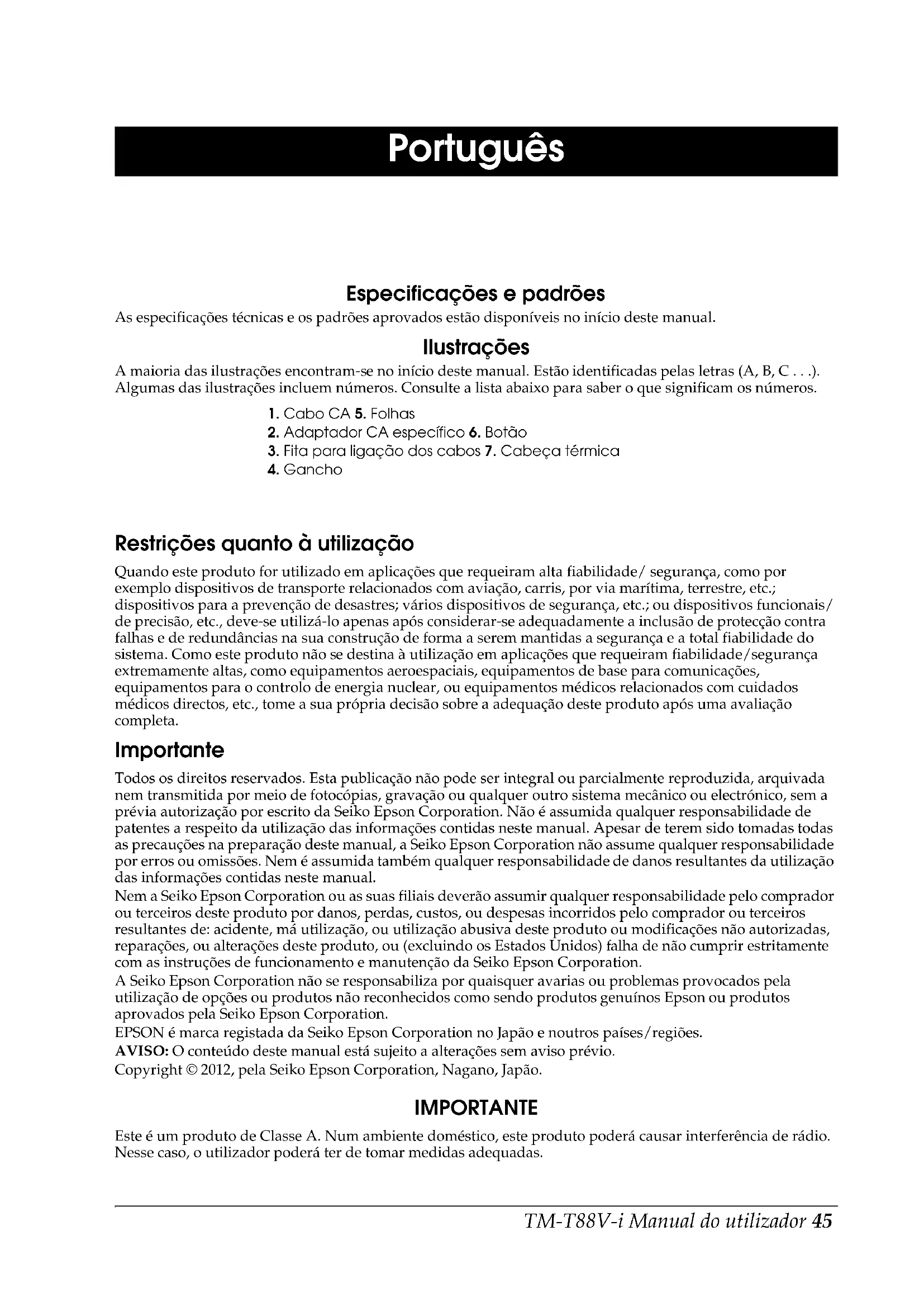 - Pour les parties soulignées dans l'adresse ci-dessus, saisissez l'adresse IP de chaque imprimante.TM-T88V-i Manual do utilizador 45 Português Português Especificações e padrões As especificações técnicas e os padrões aprovados estão disponíveis no início deste manual. Ilustrações A maioria das ilustrações encontram-se no início deste manual. Estão identificadas pelas letras (A, B, C . . .). Algumas das ilustrações incluem números. Consulte a lista abaixo para saber o que significam os números. Restrições quanto à utilização Quando este produto for utilizado em aplicações que requeiram alta fiabilidade/ segurança, como por exemplo dispositivos de transporte relacionados com aviação, carris, por via marítima, terrestre, etc.; dispositivos para a prevenção de desastres; vários dispositivos de segurança, etc.; ou dispositivos funcionais/ de precisão, etc., deve-se utilizá-lo apenas após considerar-se adequadamente a inclusão de protecção contra falhas e de redundâncias na sua construção de forma a serem mantidas a segurança e a total fiabilidade do sistema. Como este produto não se destina à utilização em aplicações que requeiram fiabilidade/segurança extremamente altas, como equipamentos aeroespaciais, equipamentos de base para comunicações, equipamentos para o controlo de energia nuclear, ou equipamentos médicos relacionados com cuidados médicos directos, etc., tome a sua própria decisão sobre a adequação deste produto após uma avaliação completa. Importante Todos os direitos reservados. Esta publicação não pode ser integral ou parcialmente reproduzida, arquivada nem transmitida por meio de fotocópias, gravação ou qualquer outro sistema mecânico ou electrónico, sem a prévia autorização por escrito da Seiko Epson Corporation. Não é assumida qualquer responsabilidade de patentes a respeito da utilização das informações contidas neste manual. Apesar de terem sido tomadas todas as precauções na preparação deste manual, a Seiko Epson Corporation não assume qualquer responsabilidade por erros ou omissões. Nem é assumida também qualquer responsabilidade de danos resultantes da utilização das informações contidas neste manual. Nem a Seiko Epson Corporation ou as suas filiais deverão assumir qualquer responsabilidade pelo comprador ou terceiros deste produto por danos, perdas, custos, ou despesas incorridos pelo comprador ou terceiros resultantes de: acidente, má utilização, ou utilização abusiva deste produto ou modificações não autorizadas, reparações, ou alterações deste produto, ou (excluindo os Estados Unidos) falha de não cumprir estritamente com as instruções de funcionamento e manutenção da Seiko Epson Corporation. A Seiko Epson Corporation não se responsabiliza por quaisquer avarias ou problemas provocados pela utilização de opções ou produtos não reconhecidos como sendo produtos genuínos Epson ou produtos aprovados pela Seiko Epson Corporation. EPSON é marca registada da Seiko Epson Corporation no Japão e noutros países/regiões. AVISO: O conteúdo deste manual está sujeito a alterações sem aviso prévio. Copyright © 2012, pela Seiko Epson Corporation, Nagano, Japão. IMPORTANTE Este é um produto de Classe A. Num ambiente doméstico, este produto poderá causar interferência de rádio. Nesse caso, o utilizador poderá ter de tomar medidas adequadas.