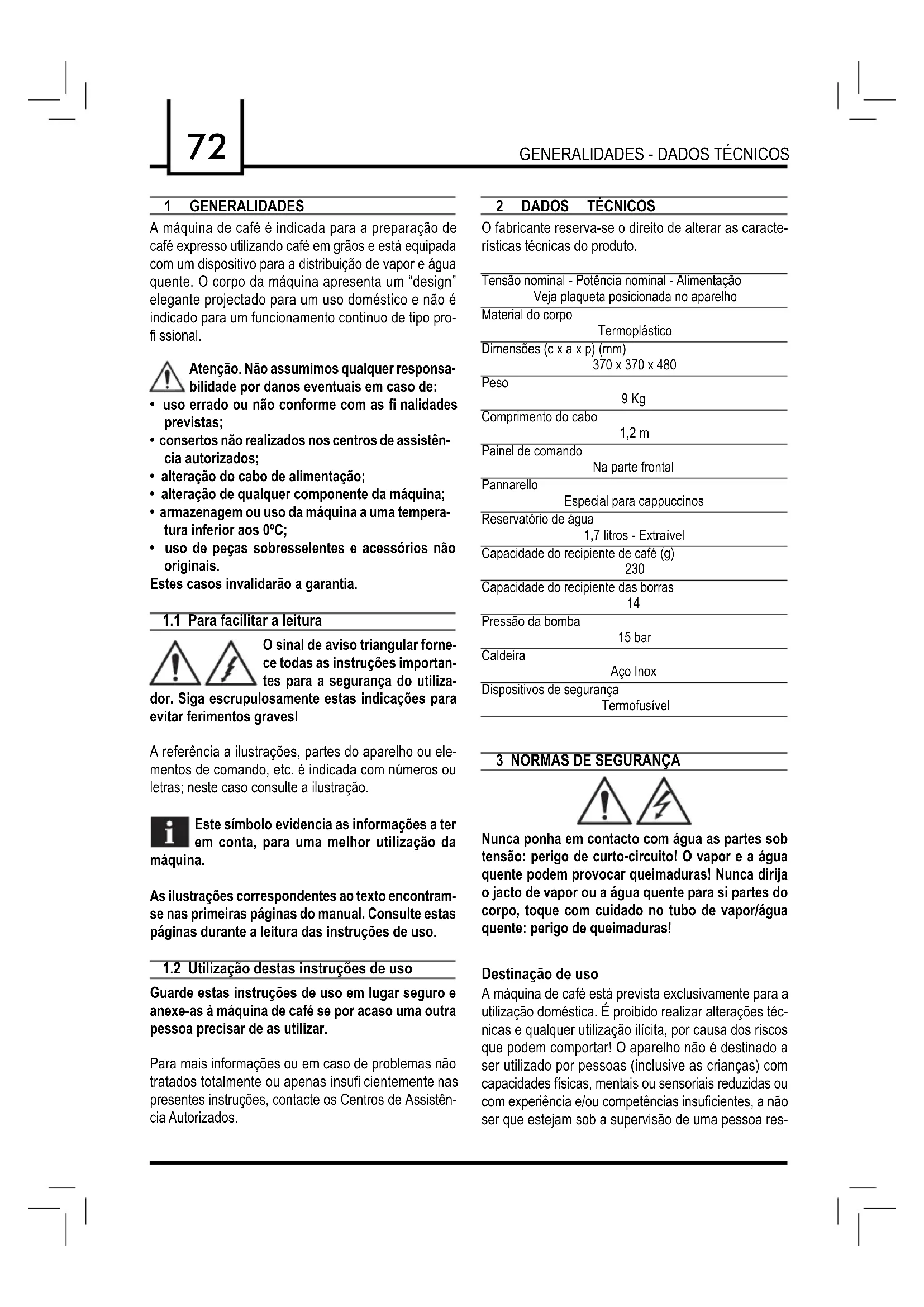 1 GENERALIDADES A máquina de café é indicada para a preparação de café expresso utilizando café em grãos e está equipada com um dispositivo para a distribuição de vapor e água quente. O corpo da máquina apresenta um “design” elegante projectado para um uso doméstico e não é indicado para um funcionamento contínuo de tipo pro- fi ssional. Atenção. Não assumimos qualquer responsa- bilidade por danos eventuais em caso de: