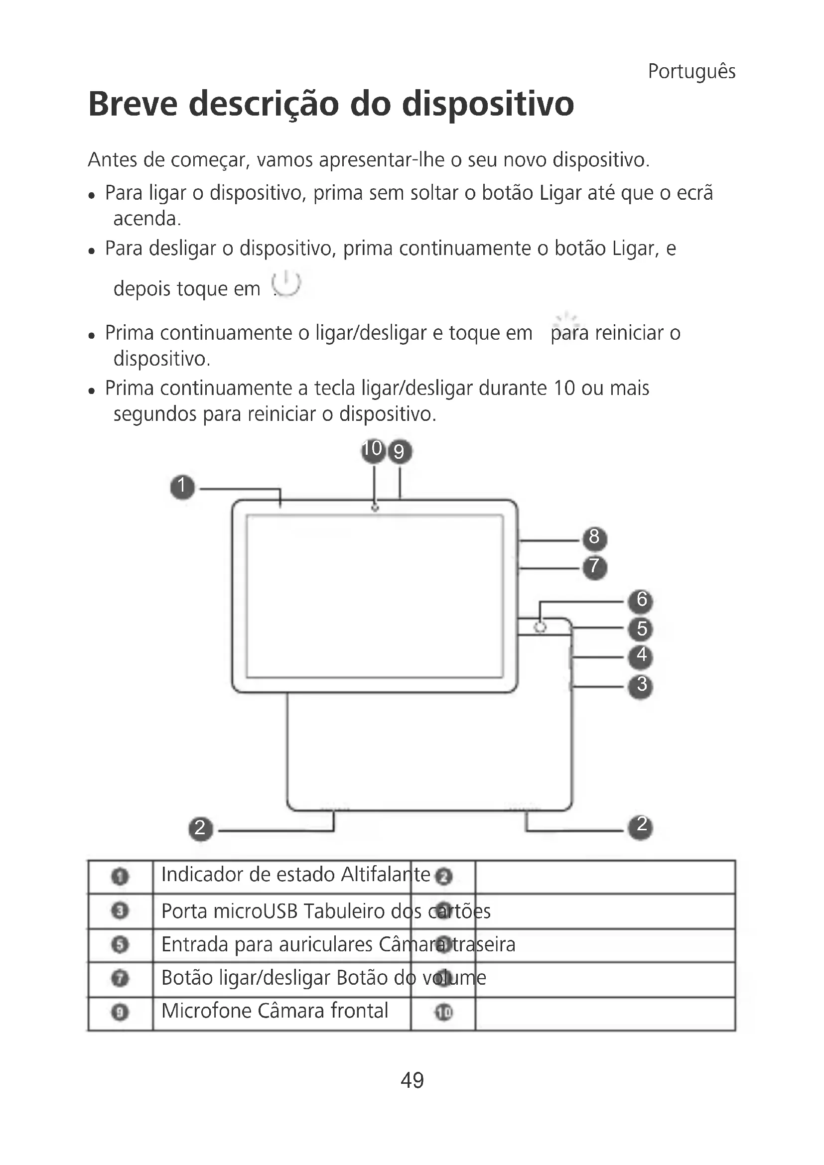 , visite el sitio web www.energystar.gov. Política de privacidad Para comprender cómo protegemos su información personal, consulte la política de privacidad en http://consumer.huawei.com/privacy-policy. Copyright © Huawei Technologies Co., Ltd. 2018. Reservados todos los derechos. ESTE DOCUMENTO ES MERAMENTE INFORMATIVO Y NO CONSTITUYE NINGÚN TIPO DE GARANTÍA. 48Breve descrição do dispositivo Antes de começar, vamos apresentar-lhe o seu novo dispositivo. l Para ligar o dispositivo, prima sem soltar o botão Ligar até que o ecrã acenda. l Para desligar o dispositivo, prima continuamente o botão Ligar, e depois toque em . l Prima continuamente o ligar/desligar e toque em para reiniciar o dispositivo. l Prima continuamente a tecla ligar/desligar durante 10 ou mais segundos para reiniciar o dispositivo.