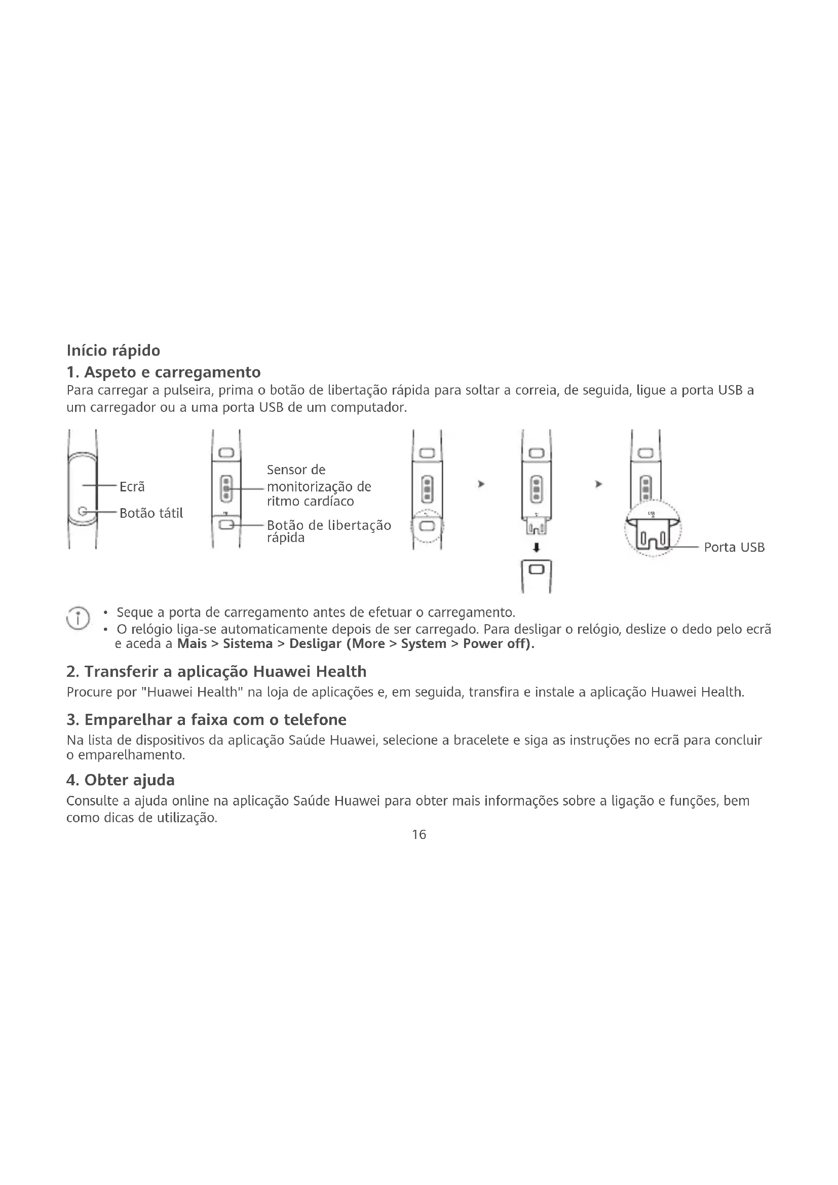 Na lista de dispositivos da aplicação Saúde Huawei, selecione a bracelete e siga as instruções no ecrã para concluir o emparelhamento. Consulte a ajuda online na aplicação Saúde Huawei para obter mais informações sobre a ligação e funções, bem como dicas de utilização. Sensor de monitorização de ritmo cardíaco Botão tátil Ecrã Porta USB USB USB Botão de libertação rápida USB USB USB USB16 17 Copyright © Huawei Technologies Co., Ltd. 2019. Todos os direitos reservados. ESTE DOCUMENTO DESTINA-SE EXCLUSIVAMENTE A FINS INFORMATIVOS E NÃO CONSTITUI QUALQUER TIPO DE GARANTIA. Marcas e Permissões