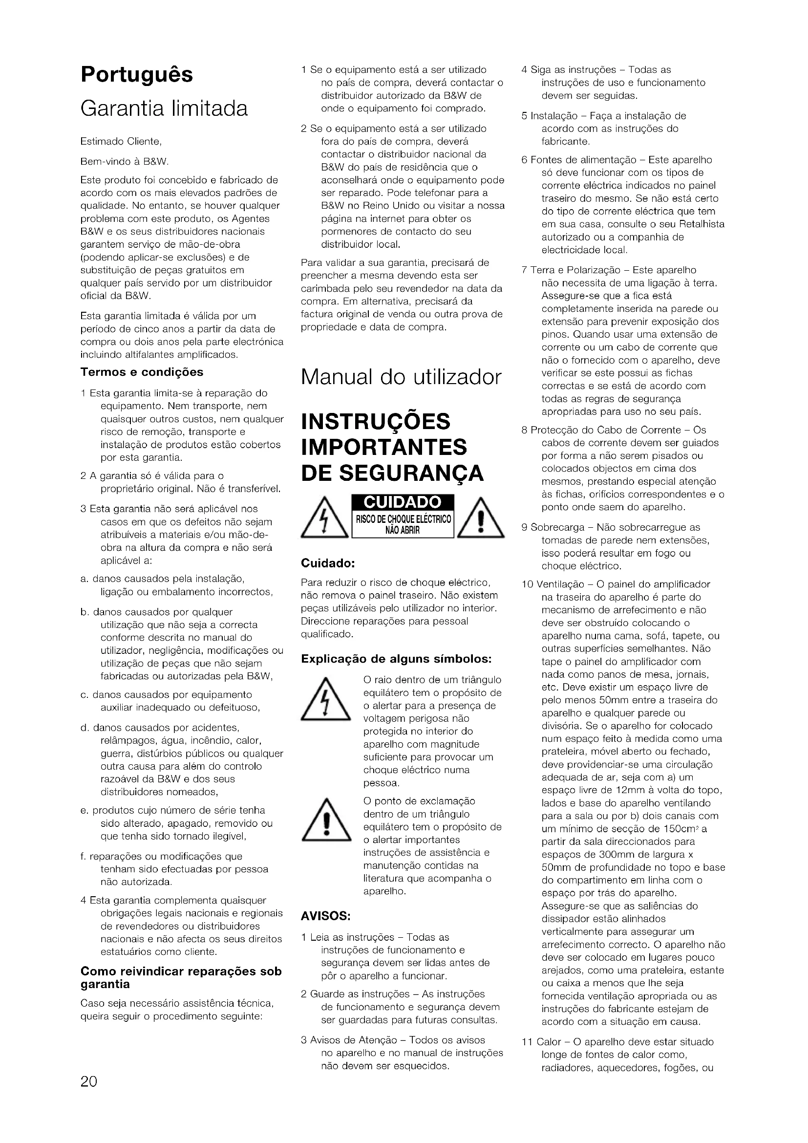 - Coloque o comutador de FASE inicialmente em 0°. Veja também a secção “Ajuste fino do sistema”. Ajuste fino do sistema Há duas definições para o interruptor EQ. A posição B é optimizada para permitir o subwoofer para dar os mais altos níveis de audição, enquanto que a posição A dá uma maior extensão de graves juntamente com um som mais compacto. 2 canais audio Ajuste do selector de FASE e do controlo de FREQUÊNCIAS GRAVES estão inter- relacionados e também dependentes da frequência de corte das colunas satélite e das posições em que são colocadas todas as colunas do sistema. Instale o sistema na posição preferida faça uma audição de uma faixa que contenha um grave controlado. A melhor configuração para as FREQUÊNCIA BAIXAS depende de diferentes variáveis; o desempenho de graves e a potência recomendada das colunas satélite, o número de subwoofers usados e a sua posição relativamente às colunas satélite. O intervalo 80 – 90 Hz é um bom ponto de começo para as FREQUÊNCIAS BAIXAS. A menos que dois subwoofers estejam a ser usados para preservar a separação de informação dos canais esquerdo e direito e estejam situados perto das colunas satélite correspondentes, usando uma frequência de corte mais alta pode comprometer a imagem stereo e apenas deve ser considerada se o desempenho de graves das colunas satélite é particularmente limitado. Para cada ajuste da frequência de corte, escute o som com o comutador de fase em ambas as posições. A posição correcta é aquela que fornece mais baixos e que depende do desempenho de baixos das colunas satélite e da distância relativa do(s) subwoofer(s) e colunas satélite ao ouvinte. Quando utilizar mais de um subwoofer, assegure-se que cada um possui os mesmos ajustes de fase e frequência de corte. Ajuste o ganho do subwoofer em relação aos satélites de acordo com o seu gosto. Utilize uma grande variedade de músicas para poder obter um ajuste médio, pois um som que pode impressionar em determinada peça pode exceder o limite numa outra. Faça o seu ajuste com os níveis de som habituais pois a percepção de equilíbrio varia com o nível de som. Cinema em Casa A situação com Cinema em Casa é em algo diferente de simples utilização Estéreo. O sinal do subwoofer (LFE) é um canal separado em vez de uma extensão do sinal das colunas. O filtro de GRAVES é desligado, porque o descodificador faz toda a filtragem para qualquer coluna definida como “small”. No entanto, a posição do selector de fase deve ainda assim ser fixado. Normalmente a fase será fixada em 0°, mas se o subwoofer está posicionado a uma distância significativamente diferente das outras colunas, ou que aconteça o amplificador de potência que está a alimentar as outras colunas inverter o sinal, a posição 180° pode ser a melhor. Ouça com o selector em ambas as posições e escolha a que lhe dá o som mais completo. Se houver uma pequena diferença, deixe o selector a 0°. Os Descodificadores têm habitualmente um sinal de ruído calibrado que pode ser usado para configurar os níveis de todas as colunas, tornando esta tarefa muito mais avançada do que para utilizações Estéreo. No entanto, não tenha medo de alterar as definições para as suas preferências. É também muito fácil deixar-se levar com as capacidades do subwoofer, especialmente com alguns efeitos de frequências baixas. Frequentemente consegue-se um desempenho mais real e a longo prazo mais satisfatório regulando o subwoofer a um nível abaixo do nível normal da calibragem. Para todas as aplicações Se tiver problemas de desequilíbrio na reprodução de baixos – com algumas notas baixas exageradas em relação a outras – isto quer dizer que terá provavelmente um problema de interacção com a própria sala de audição, que poderá em princípio ser resolvido alterando a posição do subwoofer. Aquilo que poderá parecer uma pequena alteração de posição – cerca de 15cm – poderá produzir um profundo efeito no som. Experimente levantar o subwoofer do chão assim como a deslocação lateral do mesmo. A utilização de vários subwoofers pode suavizar o efeito das ressonâncias da sala uma vez que cada subwoofer tem tendência para excitar ressonâncias a frequências diferentes. Se alterar de forma apreciável as distâncias relativas do(s) subwoofer(s) e colunas satélite ao ouvinte, controle novamente a posição do comutador de fase. Deverá também verificar o ajuste de nível do subwoofer 23(utilizando tanto o controlo de nível desaída do descodificador ou o controlo devolume do amplificador do subwoofer), masapenas após escolher a posição correctado comutador de fase. Cuidados com o subwoofer A caixa do subwoofer pode ser limpaapenas com um pano seco. Se preferirutilizar um produto de polimento em spray,deverá pulverizar sobre o pano e depoisaplicar (nunca pulverizar directamentesobre o equipamento). Removacuidadosamente a grelha afastando-a dacaixa e limpe-a com uma escova macia.Não utilize o subwoofer como mesa. Osobjectos colocados sobre ele chocalham edeterioram a qualidade de som. Os líquidossão particularmente perigosos (porexemplo bebidas ou vasos de flores), devepois conservá-los o mais possívelafastados do eqipamento.Se o seu sistema não for utilizado por umlongo período de tempo, desligue osubwoofer da alimentação.Nota: O Subwoofer desligar-se-áautomaticamente se receber umasobrecarga. Se isso acontecer, reconfigureo subwoofer desligando-o e voltando aligar, usando o interruptor Power on/off nopainel do amplificador. Italiano Garanzia limitata Egregio clienteUn benvenuto da parte della B&W.Questo prodotto è stato progettato efabbricato secondo i più alti standardqualitativi. Tuttavia, nell’improbabile caso diun guasto o malfunzionamento, B&WLoudspeakers e i suoi distributori nazionaligarantiscono parti sostitutive e manod’opera gratuite (alcune eccezioni sonopossibili) nei paesi i