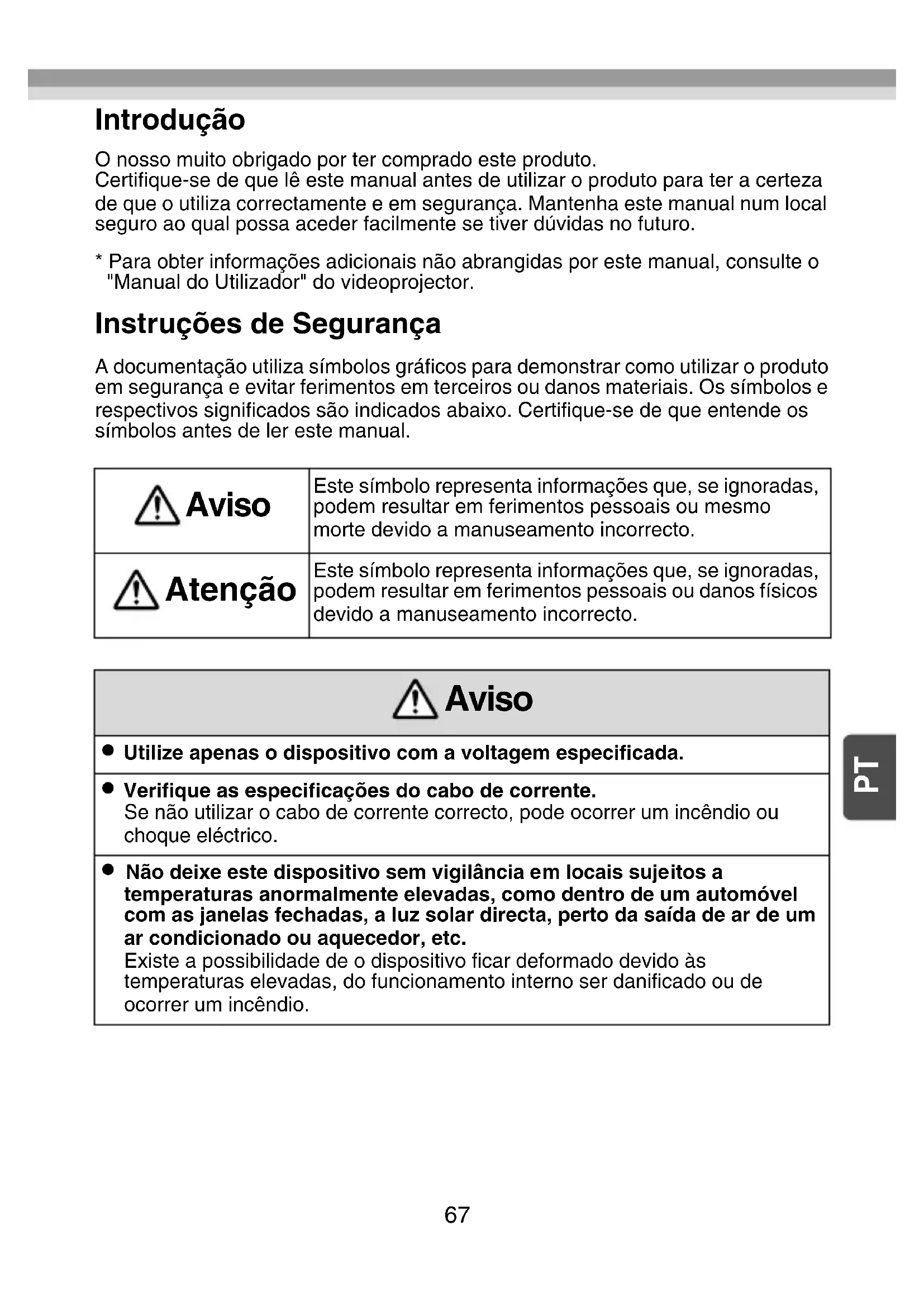 Introdução O nosso muito obrigado por ter comprado este produto.Certifique-se de que lê este manual antes de utilizar o produto para ter a certeza de que o utiliza correctamente e em segurança. Mantenha este manual num local seguro ao qual possa aceder facilmente se tiver dúvidas no futuro.* Para obter informações adicionais não abrangidas por este manual, consulte o "Manual do Utilizador" do videoprojector. Instruções de Segurança A documentação utiliza símbolos gráficos para demonstrar como utilizar o produto em segurança e evitar ferimentos em terceiros ou danos materiais. Os símbolos e respectivos significados são indicados abaixo. Certifique-se de que entende os símbolos antes de ler este manual. Aviso Este símbolo representa informações que, se ignoradas, podem resultar em ferimentos pessoais ou mesmo morte devido a manuseamento incorrecto. Atenção Este símbolo representa informações que, se ignoradas, podem resultar em ferimentos pessoais ou danos físicos devido a manuseamento incorrecto. Aviso