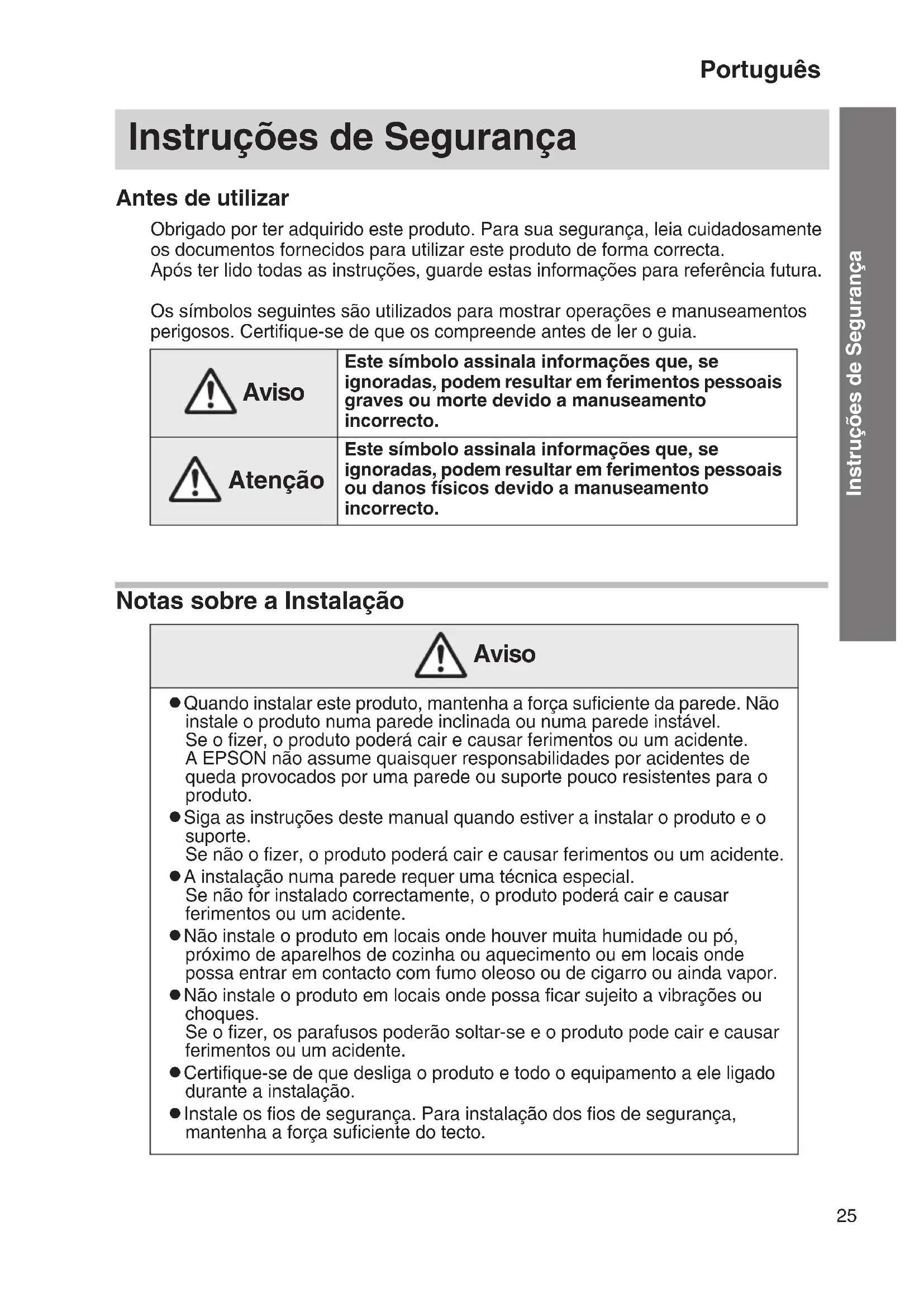 - No tire del cable de alimentación al desconectar el enchufe. Tire siempre del enchufe al desconectarlo. v No utilice un cable de alimentación dañado. Si lo hace, podría dar lugar a incendios o descargas eléctricas. Si el cable de alimentación resulta dañado (se ve el hilo conductor, presenta roturas, etc.), póngase en contacto con su distribuidor o llame al servicio de atención al cliente de Epson. v No permanezca demasiado tiempo escuchando un pitido ensordecedor. Puede perjudicar su capacidad auditiva.24 Notas sobre el almacenamiento y el transporte Precaución v No ajuste el volumen demasiado alto al iniciar. Si lo hace, es posible que suene un pitido ensordecedor que perjudique su capacidad auditiva. Baje siempre el volumen antes de enviar el audio desde el dispositivo que esté conectado y vaya subiéndolo poco a poco. v No use los altavoces a un volumen demasiado alto durante un tiempo prolongado. Si lo hace, pueden deteriorarse o su tiempo de vida útil puede reducirse considerablemente. v Limpie periódicamente el producto. Si pasa mucho tiempo sin que se limpie puede acumularse el polvo, provocando incendios o descargas eléctricas. v Antes de limpiar el producto, desconecte todos los cables del mismo. v Al limpiar el producto, no utilice paños húmedos ni solventes como alcohol, disolventes o benceno. v Los altavoces no poseen blindaje antimagnético. Advertencia v No deje el producto en lugares que puedan alcanzar temperaturas muy elevadas, como un vehículo con las ventanas cerradas, lugares expuestos a la luz solar directa o cerca del conducto de escape de un aparato de aire acondicionado. Precaución v Antes de mover el producto, apáguelo, desenchúfelo de la toma de corriente y compruebe que todos los cables están desconectados.25 Português Instruções de Segurança Antes de utilizar Obrigado por ter adquirido este produto. Para sua segurança, leia cuidadosamente os documentos fornecidos para utilizar este produto de forma correcta. Após ter lido todas as instruções, guarde estas informações para referência futura. Os símbolos seguintes são utilizados para mostrar operações e manuseamentos perigosos. Certifique-se de que os compreende antes de ler o guia. Notas sobre a Instalação Instruções de Segurança Aviso Este símbolo assinala informações que, se ignoradas, podem resultar em ferimentos pessoais graves ou morte devido a manuseamento incorrecto. Atenção Este símbolo assinala informações que, se ignoradas, podem resultar em ferimentos pessoais ou danos físicos devido a manuseamento incorrecto. Aviso v Quando instalar este produto, mantenha a força suficiente da parede. Não instale o produto numa parede inclinada ou numa parede instável. Se o fizer, o produto poderá cair e causar ferimentos ou um acidente. A EPSON não assume quaisquer responsabilidades por acidentes de queda provocados por uma parede ou suporte pouco resistentes para o produto. v Siga as instruções deste manual quando estiver a instalar o produto e o suporte. Se não o fizer, o produto poderá cair e causar ferimentos ou um acidente. v A instalação numa parede requer uma técnica especial. Se não for instalado correctamente, o produto poderá cair e causar ferimentos ou um acidente. v Não instale o produto em locais onde houver muita humidade ou pó, próximo de aparelhos de cozinha ou aquecimento ou em locais onde possa entrar em contacto com fumo oleoso ou de cigarro ou ainda vapor. v Não instale o produto em locais onde possa ficar sujeito a vibrações ou choques. Se o fizer, os parafusos poderão soltar-se e o produto pode cair e causar ferimentos ou um acidente. v Certifique-se de que desliga o produto e todo o equipamento a ele ligado durante a instalação. v Instale os fios de segurança. Para instalação dos fios de segurança, mantenha a força suficiente do tecto.26 Notas sobre a Utilização Aviso v Aperte totalmente os parafusos. Volte a apertá-los para confirmar se estão bem apertados. Se os parafusos não estiverem bem apertados, o produto pode cair e causar ferimentos ou um acidente. v Não aplique vedador de rosca, lubrificante nem óleo na área de fixação do produto. Se o fizer, a caixa externa ou a área de fixação poderá quebrar e o produto pode ter problemas de funcionamento. O produto poderá também cair e causar ferimentos ou um acidente. Atenção v Fixe o produto à parede sem deixar qualquer espaço entre ambos. Certifique-se de que os parafusos não estão encaixados com inclinação. Verifique se os parafusos estão apertados firmemente. Aviso v Não se ponha em cima do produto nem pendure nenhum objecto pesado nele. v Não desaperte os parafusos após a instalação. Verifique o seu estado periodicamente e confirme se algum parafuso está solto. Se estiver, volte a apertá-lo devidamente. v Nunca abra nenhuma das tampas do produto, excepto como explicado especificamente no Guia do Utilizador, e não tente desmontar ou modificar o produto. Se o fizer, poderá provocar incêndio, choque eléctrico ou um acidente pois algumas peças internas utilizam alta tensão. Todas as reparações devem ser efectuadas por pessoal técnico qualificado. v Tenha cuidado para não derramar bebidas tais como chá, café ou sumo, ou ainda insecticida aerossol em spray no produto. Tais substâncias poderão causar um mau funcionamento, incêndio ou choque eléctrico. Se algum líquido for derramado no produto, desligue imediatamente o produto, desligue-o do transformador de CA e contacte o seu revendedor. Se continuar a utilizar o produto, poderá ocorrer um incêndio ou choque eléctrico.27 Português Instruções de Segurança Aviso v Desligue imediatamente o produto, desligue-o da corrente, desligue todos os cabos e, em seguida, contacte o seu revendedor ou o serviço de assistência técnica da EPSON nas seguintes situações: