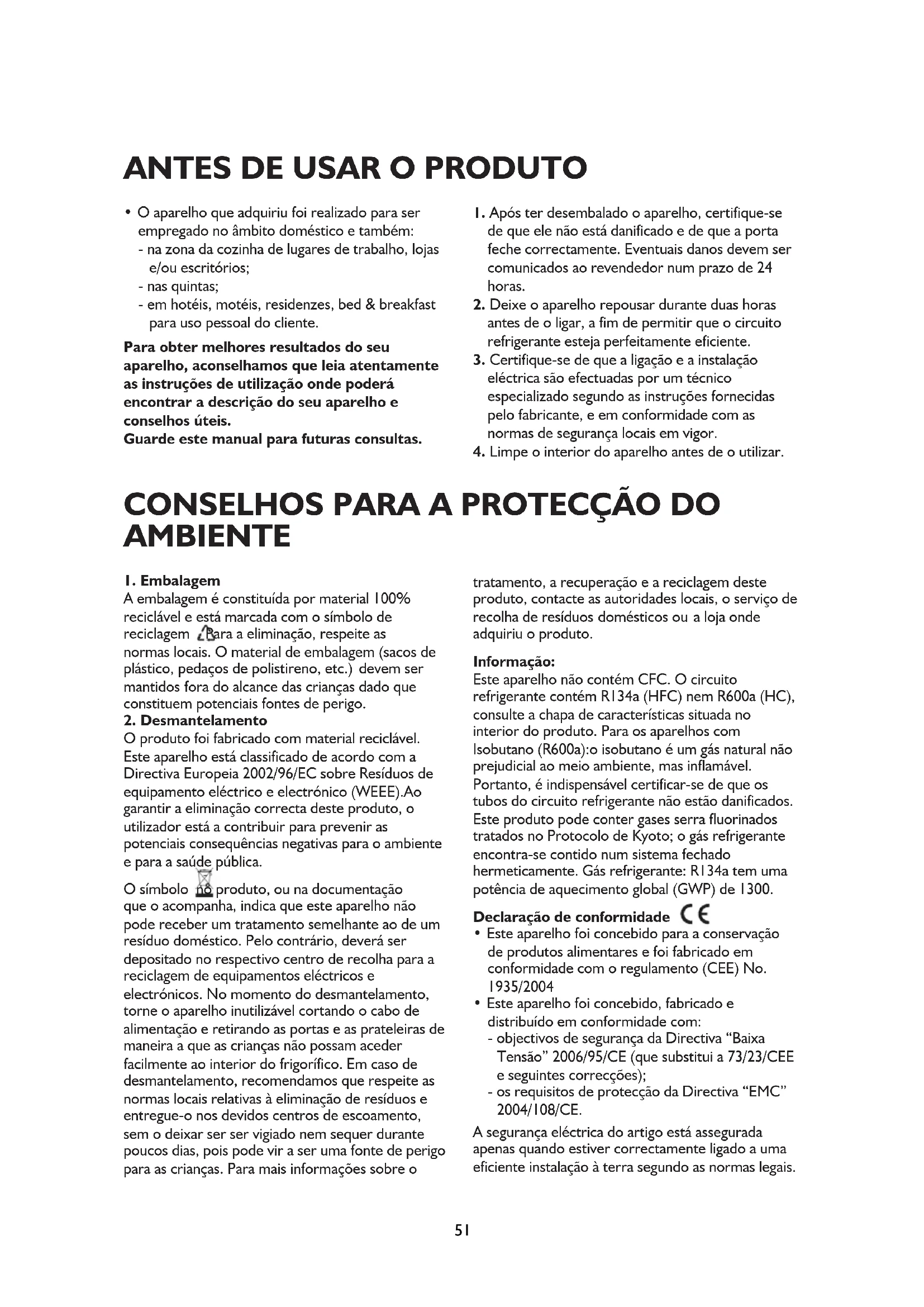 O produto foi fabricado com material reciclável. Este aparelho está classificado de acordo com a Directiva Europeia 2002/96/EC sobre Resíduos de equipamento eléctrico e electrónico (WEEE).Ao garantir a eliminação correcta deste produto, o utilizador está a contribuir para prevenir as potenciais consequências negativas para o ambiente e para a saúde pública. O símbolo no produto, ou na documentação que o acompanha, indica que este aparelho não pode receber um tratamento semelhante ao de um resíduo doméstico. Pelo contrário, deverá ser depositado no respectivo centro de recolha para a reciclagem de equipamentos eléctricos e electrónicos. No momento do desmantelamento, torne o aparelho inutilizável cortando o cabo de alimentação e retirando as portas e as prateleiras de maneira a que as crianças não possam aceder facilmente ao interior do frigorífico. Em caso de desmantelamento, recomendamos que respeite as normas locais relativas à eliminação de resíduos e entregue-o nos devidos centros de escoamento, sem o deixar ser ser vigiado nem sequer durante poucos dias, pois pode vir a ser uma fonte de perigo para as crianças. Para mais informações sobre o tratamento, a recuperação e a reciclagem deste produto, contacte as autoridades locais, o serviço de recolha de resíduos domésticos ou a loja onde adquiriu o produto. Informação: Este aparelho não contém CFC. O circuito refrigerante contém R134a (HFC) nem R600a (HC), consulte a chapa de características situada no interior do produto. Para os aparelhos com Isobutano (R600a):o isobutano é um gás natural não prejudicial ao meio ambiente, mas inflamável. Portanto, é indispensável certificar-se de que os tubos do circuito refrigerante não estão danificados. Este produto pode conter gases serra fluorinados tratados no Protocolo de Kyoto; o gás refrigerante encontra-se contido num sistema fechado hermeticamente. Gás refrigerante: R134a tem uma potência de aquecimento global (GWP) de 1300. Declaração de conformidade
