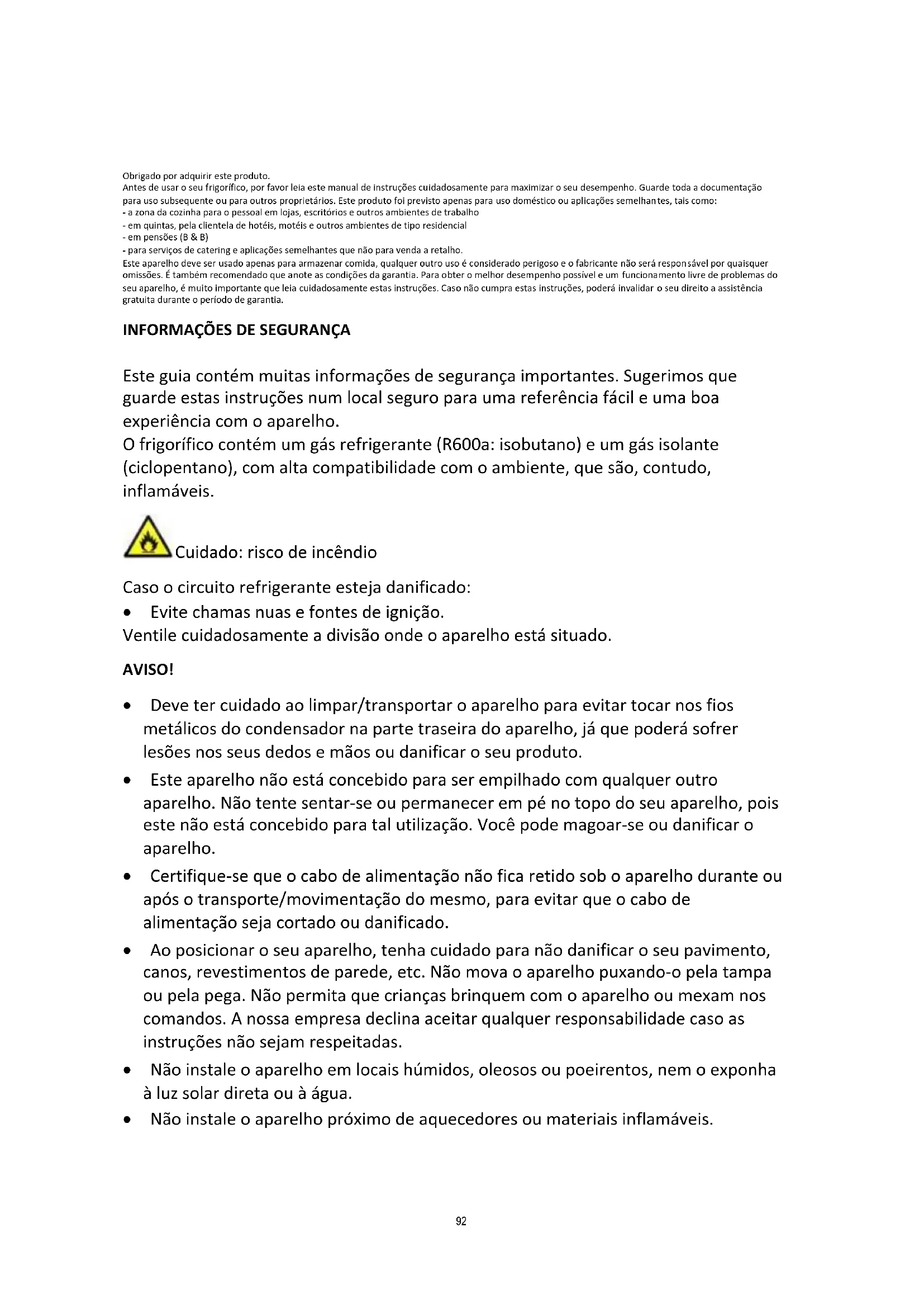 Este guia contém muitas informações de segurança importantes. Sugerimos que guarde estas instruções num local seguro para uma referência fácil e uma boa experiência com o aparelho. O frigorífico contém um gás refrigerante (R600a: isobutano) e um gás isolante (ciclopentano), com alta compatibilidade com o ambiente, que são, contudo, inflamáveis. Cuidado: risco de incêndio Caso o circuito refrigerante esteja danificado: