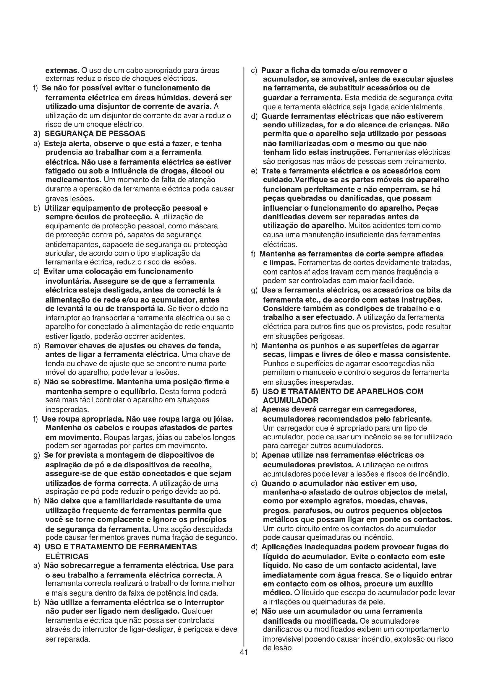 ACUMULADOR a) Apenas deverá carregar em carregadores, acumuladores recomendados pelo fabricante. Um carregador que é apropriado para um tipo de acumulador, pode causar um incêndio se se for utilizado para carregar outros acumuladores. b) Apenas utilize nas ferramentas eléctricas os acumuladores previstos. A utilização de outros acumuladores pode levar a lesões e riscos de incêndio. c) Quando o acumulador não estiver em uso, mantenha-o afastado de outros objectos de metal, como por exemplo agrafos, moedas, chaves, pregos, parafusos, ou outros pequenos objectos metálicos que possam ligar em ponte os contactos. Um curto circuito entre os contactos do acumulador pode causar queimaduras ou incêndio. d) Aplicações inadequadas podem provocar fugas do líquido do acumulador. Evite o contacto com este líquido. No caso de um contacto acidental, lave imediatamente com água fresca. Se o líquido entrar em contacto com os olhos, procure um auxílio médico. O líquido que escapa do acumulador pode levar a irritações ou queimaduras da pele. e) Não use um acumulador ou uma ferramenta danicada ou modicada. Os acumuladores danicados ou modicados exibem um comportamento imprevisível podendo causar incêndio, explosão ou risco de lesão. externas. O uso de um cabo apropriado para áreas externas reduz o risco de choques eléctricos. f) Se não for possível evitar o funcionamento da ferramenta eléctrica em áreas húmidas, deverá ser utilizado uma disjuntor de corrente de avaria. A utilização de um disjuntor de corrente de avaria reduz o risco de um choque eléctrico.