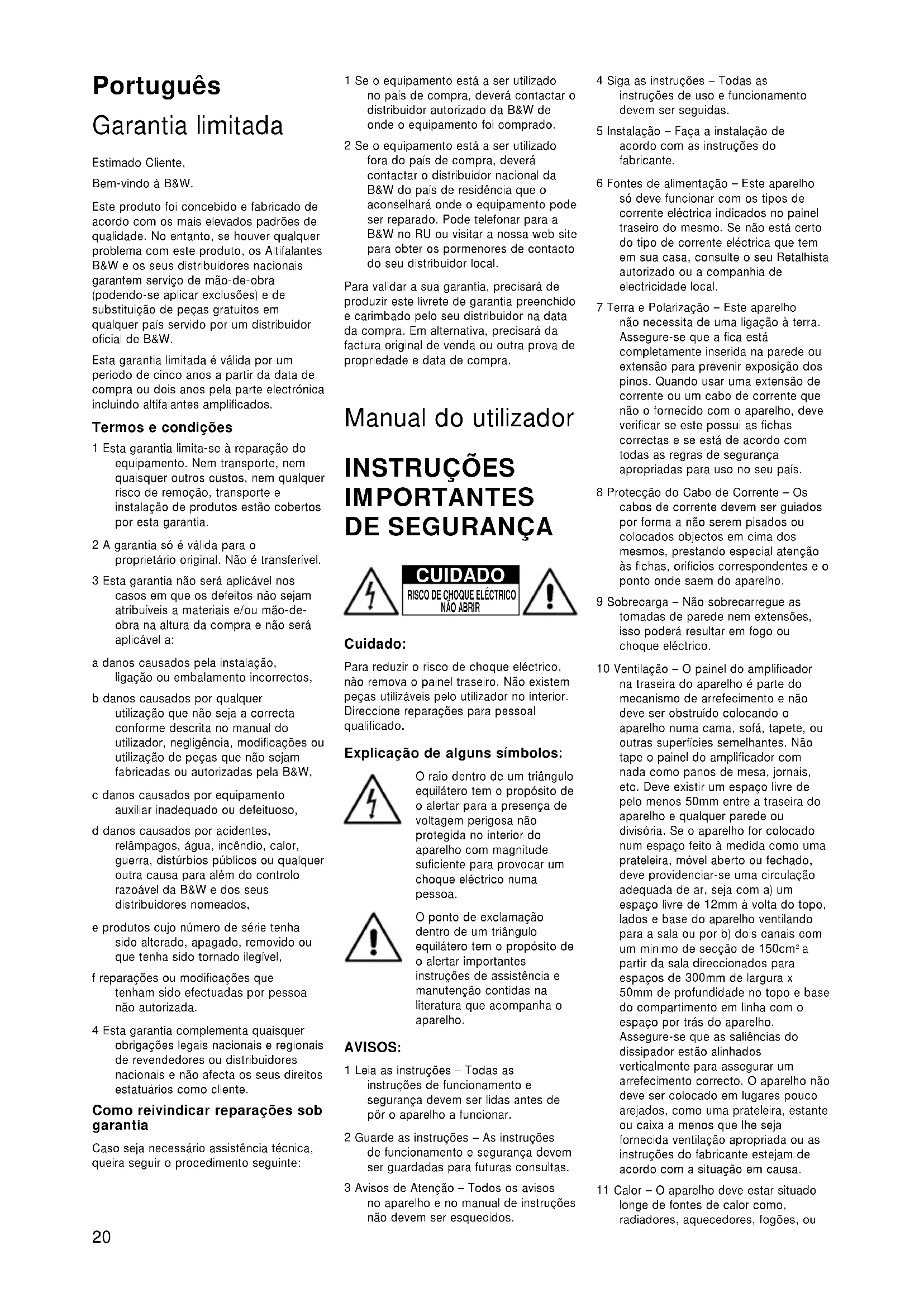 - Coloque o comutador de FASE inicialmente em 0°. Veja também a secção “Ajuste fino do sistema”. Ajuste fino do sistema Há duas definições para o interruptor EQ. A posição B é optimizada para permitir o subwoofer para dar os mais altos níveis de audição, enquanto que a posição A dá uma maior extensão de graves juntamente com um som mais compacto. 2 canais audio Ajuste do selector de FASE e do controlo de FREQUÊNCIAS GRAVES estão inter- relacionados e também dependentes da frequência de corte das colunas satélite e das posições em que são colocadas todas as colunas do sistema. Instale o sistema na posição preferida faça uma audição de uma faixa que contenha um grave controlado. A melhor configuração para as FREQUÊNCIA BAIXAS depende de diferentes variáveis; o desempenho de graves e a potência recomendada das colunas satélite, o número de subwoofers usados e a sua posição relativamente às colunas satélite. O intervalo 80 – 90 Hz é um bom ponto de começo para as FREQUÊNCIAS BAIXAS. A menos que dois subwoofers estejam a ser usados para preservar a separação de informação dos canais esquerdo e direito e estejam situados perto das colunas satélite correspondentes, usando uma frequência de corte mais alta pode comprometer a imagem stereo e apenas deve ser considerada se o desempenho de graves das colunas satélite é particularmente limitado. Para cada ajuste da frequência de corte, escute o som com o comutador de fase em ambas as posições. A posição correcta é aquela que fornece mais baixos e que depende do desempenho de baixos das colunas satélite e da distância relativa do(s) subwoofer(s) e colunas satélite ao ouvinte. Quando utilizar mais de um subwoofer, assegure-se que cada um possui os mesmos ajustes de fase e frequência de corte. Ajuste o ganho do subwoofer em relação aos satélites de acordo com o seu gosto. Utilize uma grande variedade de músicas para poder obter um ajuste médio, pois um som que pode impressionar em determinada peça pode exceder o limite numa outra. Faça o seu ajuste com os níveis de som habituais pois a percepção de equilíbrio varia com o nível de som. Cinema em Casa A situação com Cinema em Casa é em algo diferente de simples utilização Estéreo. O sinal do subwoofer (LFE) é um canal separado em vez de uma extensão do sinal das colunas. O filtro de GRAVES é desligado, porque o descodificador faz toda a filtragem para qualquer coluna definida como “small”. No entanto, a posição do selector de fase deve ainda assim ser fixado. Normalmente a fase será fixada em 0°, mas se o subwoofer está posicionado a uma distância significativamente diferente das outras colunas, ou que aconteça o amplificador de potência que está a alimentar as outras colunas inverter o sinal, a posição 180° pode ser a melhor. Ouça com o selector em ambas as posições e escolha a que lhe dá o som mais completo. Se houver uma pequena diferença, deixe o selector a 0°. Os Descodificadores têm habitualmente um sinal de ruído calibrado que pode ser usado para configurar os níveis de todas as colunas, tornando esta tarefa muito mais avançada do que para utilizações Estéreo. No entanto, não tenha medo de alterar as definições para as suas preferências. É também muito fácil deixar-se levar com as capacidades do subwoofer, especialmente com alguns efeitos de frequências baixas. Frequentemente consegue-se um desempenho mais real e a longo prazo mais satisfatório regulando o subwoofer a um nível abaixo do nível normal da calibragem. Para todas as aplicações Se tiver problemas de desequilíbrio na reprodução de baixos – com algumas notas baixas exageradas em relação a outras – isto quer dizer que terá provavelmente um problema de interacção com a própria sala de audição, que poderá em princípio ser resolvido alterando a posição do subwoofer. Aquilo que poderá parecer uma pequena alteração de posição – cerca de 15cm – poderá produzir um profundo efeito no som. Experimente levantar o subwoofer do chão assim como a deslocação lateral do mesmo. A utilização de vários subwoofers pode suavizar o efeito das ressonâncias da sala uma vez que cada subwoofer tem tendência para excitar ressonâncias a frequências diferentes. Se alterar de forma apreciável as distâncias relativas do(s) subwoofer(s) e colunas satélite ao ouvinte, controle novamente a posição do comutador de fase. Deverá também verificar o ajuste de nível do subwoofer 23(utilizando tanto o controlo de nível desaída do descodificador ou o controlo devolume do amplificador do subwoofer), masapenas após escolher a posição correctado comutador de fase. Cuidados com o subwoofer A caixa do subwoofer pode ser limpaapenas com um pano seco. Se preferirutilizar um produto de polimento em spray,deverá pulverizar sobre o pano e depoisaplicar (nunca pulverizar directamentesobre o equipamento). Removacuidadosamente a grelha afastando-a dacaixa e limpe-a com uma escova macia.Não utilize o subwoofer como mesa. Osobjectos colocados sobre ele chocalham edeterioram a qualidade de som. Os líquidossão particularmente perigosos (porexemplo bebidas ou vasos de flores), devepois conservá-los o mais possívelafastados do eqipamento.Se o seu sistema não for utilizado por umlongo período de tempo, desligue osubwoofer da alimentação.Nota: O Subwoofer desligar-se-áautomaticamente se receber umasobrecarga. Se isso acontecer, reconfigureo subwoofer desligando-o e voltando aligar, usando o interruptor Power on/off nopainel do amplificador. Italiano Garanzia limitata Egregio clienteUn benvenuto da parte della B&W.Questo prodotto è stato progettato efabbricato secondo i più alti standardqualitativi. Tuttavia, nell’improbabile caso diun guasto o malfunzionamento, B&WLoudspeakers e i suoi distributori nazionaligarantiscono parti sostitutive e manod’opera gratuite (alcune eccezioni sonopossibili) nei paesi i