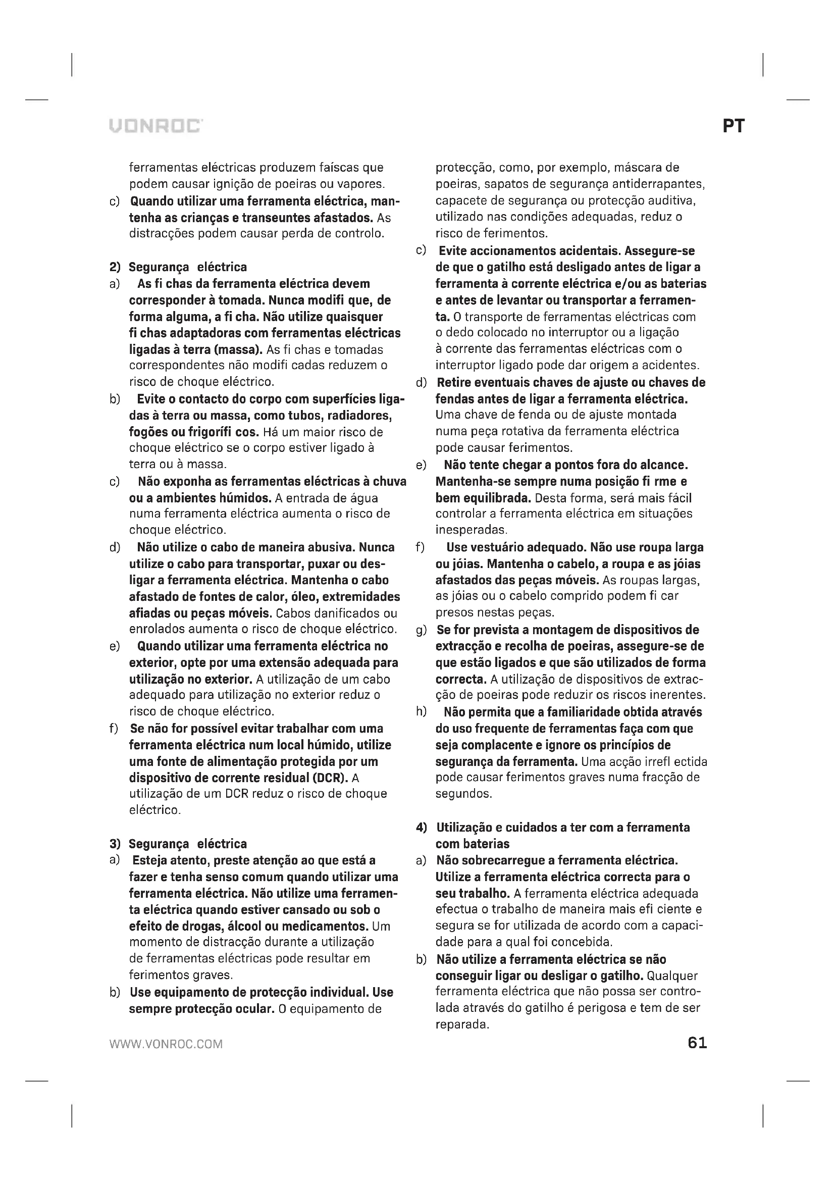 Antes de efectuar a limpeza e a manuten- ção, desligue sempre a máquina e retire a fi cha de alimentação da rede eléctrica. Limpe a carcaça da máquina com regularidade com um pano macio, de preferência após cada uti- lização. Certifi que-se de que as aberturas de ven- tilação não têm pó ou sujidade. Retire a sujidade muito persistente com um pano macio humedecido com água de sabão. Não utilize solventes, como gasolina, álcool, amoníaco, etc. Este tipo de produ- tos químicos danifi cam os componentes sintéticos. AMBIENTE Os equipamentos eléctricos ou electróni- cos defeituosos e/ou eliminados devem ser recolhidos em locais de reciclagem adequados. Apenas para os países da CE Não elimine as ferramentas eléctricas em conjunto com os resíduos domésticos. De acordo com a directiva europeia 2012/19/CE sobre resíduos de equipamentos eléctricos e electrónicos e a res- pectiva implementação na legislação nacional, as ferramentas eléctricas que já não sejam utilizadas devem ser recolhidas em separado e eliminadas de maneira ecológica. GARANTIA Os produtos da VONROC são desenvolvidos de acordo com os padrões de qualidade mais elevados e não apresentam quaisquer defeitos em termos de mate- riais e mão-de-obra em relação ao período estipu- lado por lei, cujo início é a partir da data de compra original. Se o produto apresentar qualquer falha durante este período devido a qualquer defeito no material e/ou de mão-de-obra, contacte a VONROC directamente.66