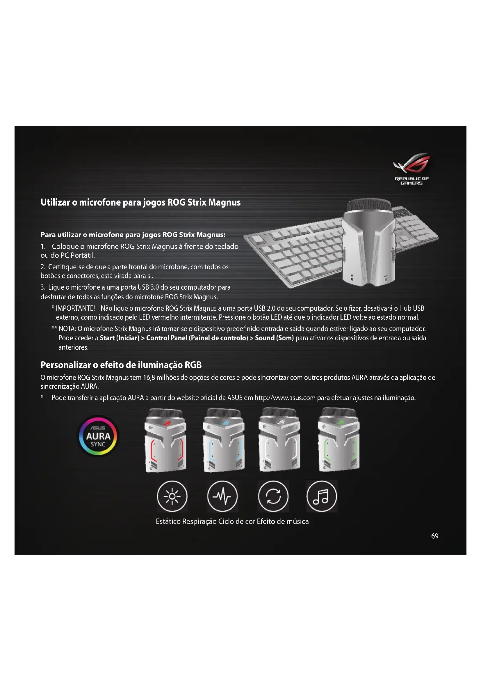 - IMPORTANTE! Não ligue o microfone ROG Strix Magnus a uma porta USB 2.0 do seu computador. Se o fizer, desativará o Hub USB externo, como indicado pelo LED vermelho intermitente. Pressione o botão LED até que o indicador LED volte ao estado normal. ** NOTA: O microfone Strix Magnus irá tornar-se o dispositivo predefinido entrada e saída quando estiver ligado ao seu computador. Pode aceder a Start (Iniciar) > Control Panel (Painel de controlo) > Sound (Som) para ativar os dispositivos de entrada ou saída anteriores. Personalizar o efeito de iluminação RGB O microfone ROG Strix Magnus tem 16,8 milhões de opções de cores e pode sincronizar com outros produtos AURA através da aplicação de sincronização AURA.