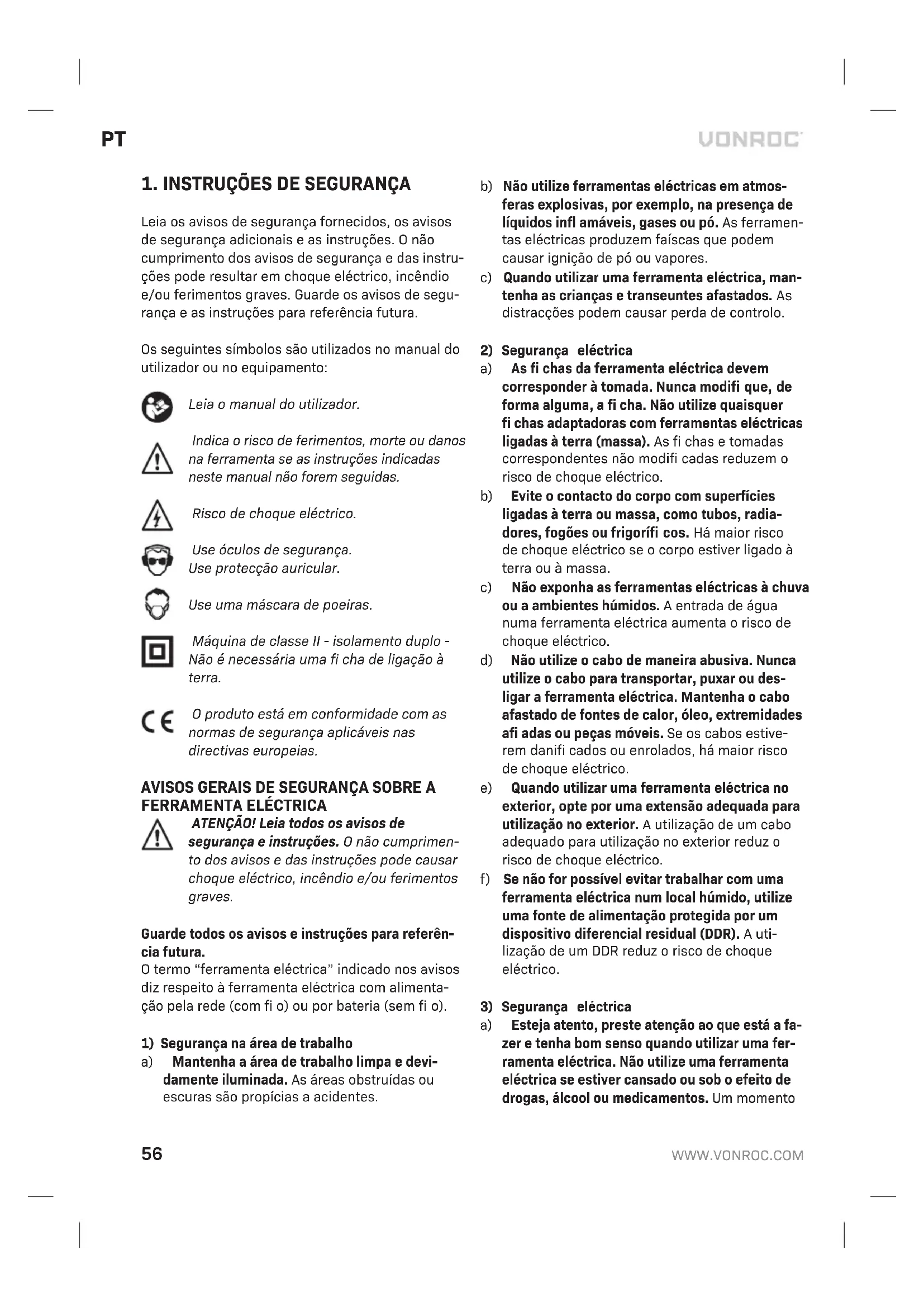 - Se forem utilizadas peças sobresselentes não originais. Isto constitui a única garantia feita pela empresa, de maneira expressa ou implícita. Não existem quaisquer outras garantias expressas ou implí- citas que se prolonguem, incluindo as garantias implícitas de comercialização e adequação para fi ns específi cos. A VONROC não será, em nenhuma circunstância, responsável por danos incidentais ou indirectos. Os fornecedores devem estar limita- dos a reparar ou substituir as unidades ou peças que não estejam em conformidade. O equipamento e o manual do utilizador estão sujeitos a alterações sem aviso prévio. As especi- fi cações podem ser alteradas sem aviso prévio.