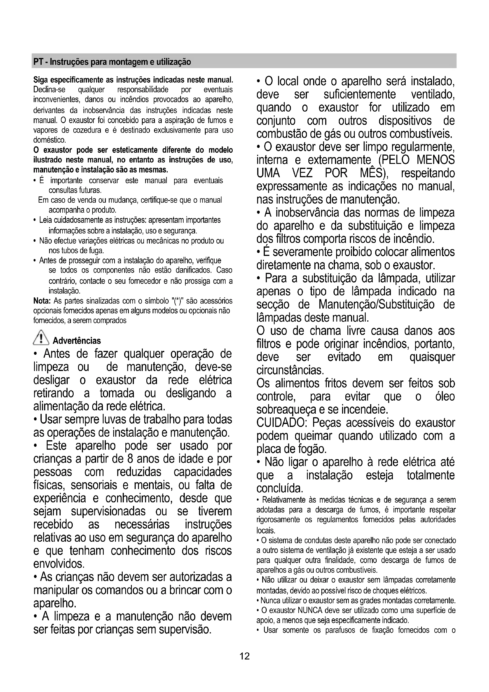 - O exaustor deve ser limpo regularmente, interna e externamente (PELO MENOS UMA VEZ POR MÊS), respeitando expressamente as indicações no manual, nas instruções de manutenção.