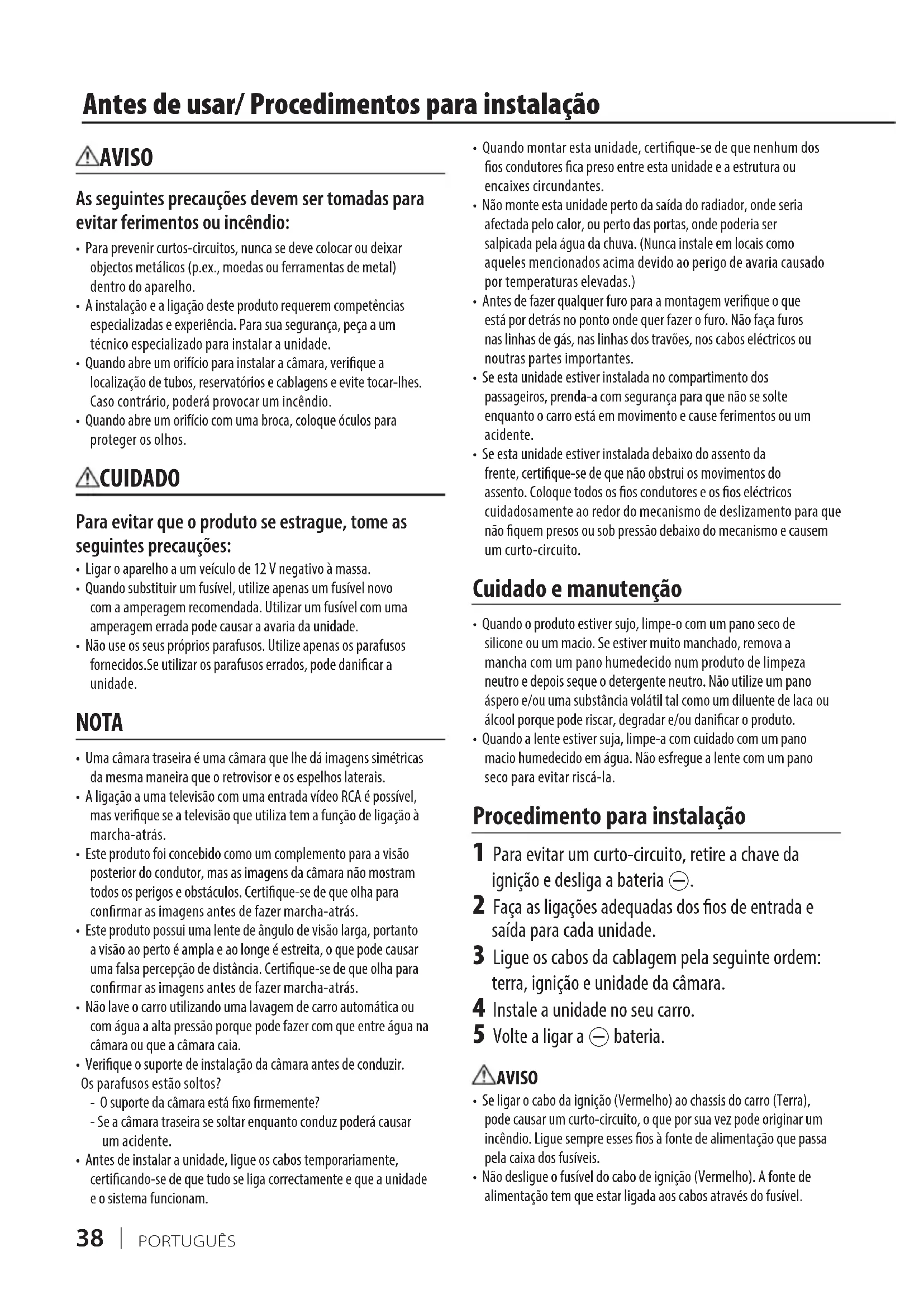 - Quando o produto estiver sujo, limpe-o com um pano seco de silicone ou um macio. Se estiver muito manchado, remova a mancha com um pano humedecido num produto de limpeza neutro e depois seque o detergente neutro. Não utilize um pano áspero e/ou uma substância volátil tal como um diluente de laca ou álcool porque pode riscar, degradar e/ou danicar o produto.• Quando a lente estiver suja, limpe-a com cuidado com um pano macio humedecido em água. Não esfregue a lente com um pano seco para evitar riscá-la. Procedimento para instalação 1 Para evitar um curto-circuito, retire a chave da ignição e desliga a bateria -. 2 Faça as ligações adequadas dos os de entrada e saída para cada unidade. 3 Ligue os cabos da cablagem pela seguinte ordem: terra, ignição e unidade da câmara. 4 Instale a unidade no seu carro. 5 Volte a ligar a - bateria. AVISO• Se ligar o cabo da ignição (Vermelho) ao chassis do carro (Terra), pode causar um curto-circuito, o que por sua vez pode originar um incêndio. Ligue sempre esses os à fonte de alimentação que passa pela caixa dos fusíveis.• Não desligue o fusível do cabo de ignição (Vermelho). A fonte de alimentação tem que estar ligada aos cabos através do fusível. AVISO As seguintes precauções devem ser tomadas para evitar ferimentos ou incêndio: