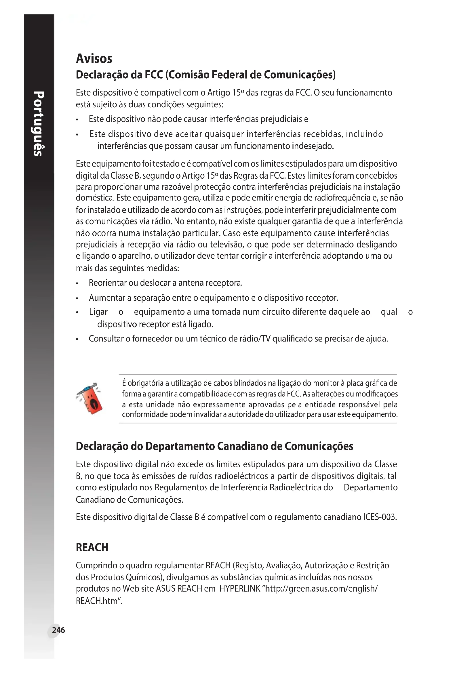 - Consultarofornecedorouumtécnicoderádio/TVqualicadoseprecisardeajuda. Declaração do Departamento Canadiano de Comunicações Este dispositivo digital não excede os limites estipulados para um dispositivo da Classe B, no que toca às emissões de ruídos radioeléctricos a partir de dispositivos digitais, tal comoestipuladonosRegulamentosdeInterferênciaRadioeléctricado Departamento Canadiano de Comunicações. Este dispositivo digital de Classe B é compatível com o regulamento canadiano ICES-003. É obrigatória a utilização de cabos blindados na ligação do monitor à placa gráca de forma a garantir a compatibilidade com as regras da FCC. As alterações ou modicações a esta unidade não expressamente aprovadas pela entidade responsável pela conformidade podem invalidar a autoridade do utilizador para usar este equipamento. REACH Cumprindo o quadro regulamentar REACH (Registo, Avaliação, Autorização e Restrição dos Produtos Químicos), divulgamos as substâncias químicas incluídas nos nossos produtosnoWebsiteASUSREACHemHYPERLINK“http://green.asus.com/english/ REACH.htm”.247 Português Normas de segurança Segurança eléctrica