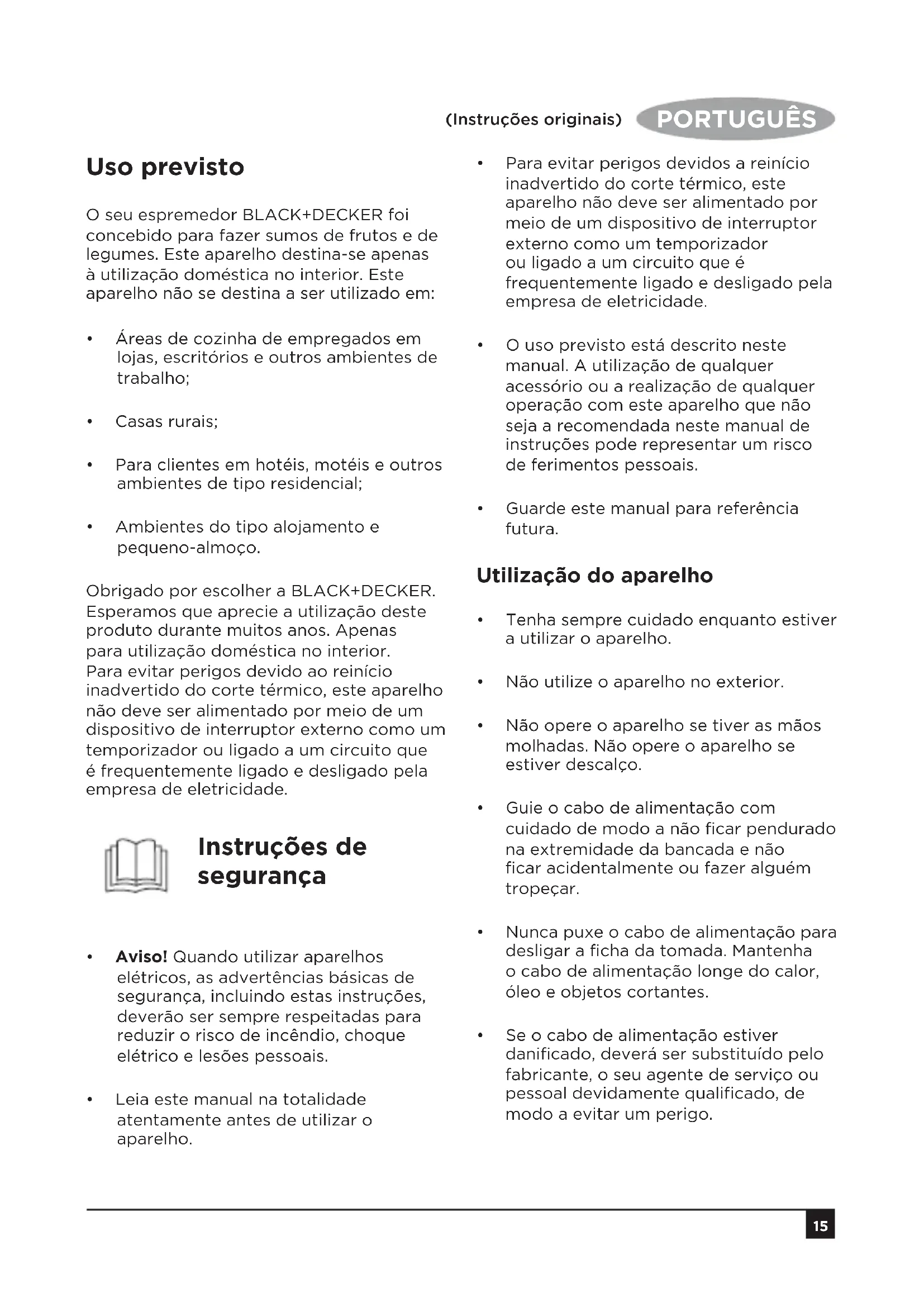 - Ambientes do tipo alojamento e pequeno-almoço. Obrigado por escolher a BLACK+DECKER. Esperamos que aprecie a utilização deste produto durante muitos anos. Apenas para utilização doméstica no interior. Para evitar perigos devido ao reinício inadvertido do corte térmico, este aparelho não deve ser alimentado por meio de um dispositivo de interruptor externo como um temporizador ou ligado a um circuito que é frequentemente ligado e desligado pela empresa de eletricidade. Instruções de segurança