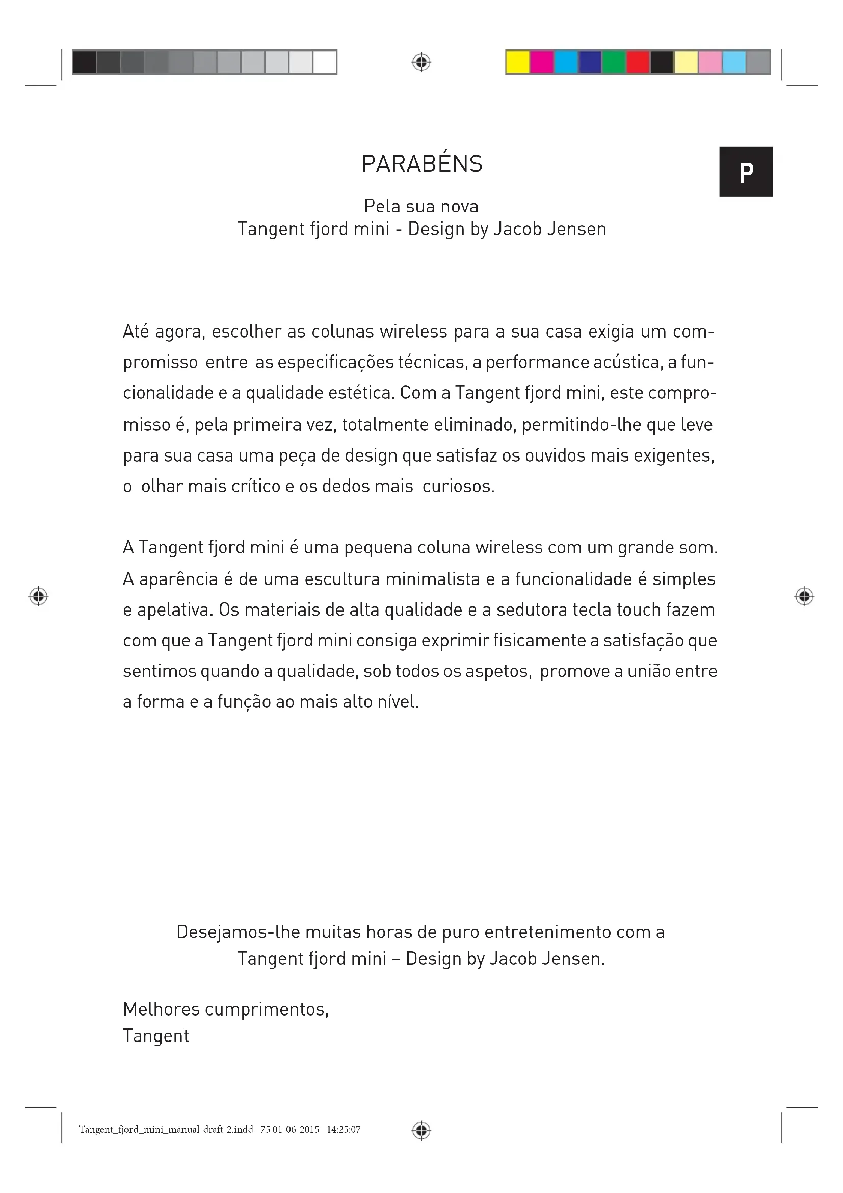 teriet, ta enheten till en reparatör för hjälp. Tangent_fjord_mini_manual-draft-2.indd 74 01-06-2015 14:25:07P Desejamos-lhe muitas horas de puro entretenimento com a Tangent fjord mini – Design by Jacob Jensen. Melhores cumprimentos, Tangent PARABÉNS Pela sua nova Tangent fjord mini - Design by Jacob Jensen Até agora, escolher as colunas wireless para a sua casa exigia um com- promisso entre as especificações técnicas, a performance acústica, a fun- cionalidade e a qualidade estética. Com a Tangent fjord mini, este compro- misso é, pela primeira vez, totalmente eliminado, permitindo-lhe que leve para sua casa uma peça de design que satisfaz os ouvidos mais exigentes, o olhar mais crítico e os dedos mais curiosos. A Tangent fjord mini é uma pequena coluna wireless com um grande som. A aparência é de uma escultura minimalista e a funcionalidade é simples e apelativa. Os materiais de alta qualidade e a sedutora tecla touch fazem com que a Tangent fjord mini consiga exprimir fisicamente a satisfação que sentimos quando a qualidade, sob todos os aspetos, promove a união entre a forma e a função ao mais alto nível. Tangent_fjord_mini_manual-draft-2.indd 75 01-06-2015 14:25:07Guia de Utilização Rápida: Retire a Tangent fjord da embalagem Ponha o botão ON/OFF na posição ON para ativar o sensor touch na parte de cima do dispositivo. LIGUE o dispositivo premindo ligeiramente o sensor touch O dispositivo irá agora entrar em modo de emparelhamento e poderá encontrá-lo no seu smart phone. (“Se o seu smart phone possuir a fun- ção NFC e esta estiver ativa, pode emparelhar por esta via ” A função NFC está localizada na parte de cima do dispositivo.) Está agora ligado ao dispositivo e pode ouvir música. Para DESLIGAR a fjord mini, prima o sensor touch durante alguns segundos. Carregue a Tangent fjord sempre que necessário. Funções da tecla Touch: Ligar Toque ligeiramente no sensor Desligar Toque durante alguns segundos (operação e emparelhamento) Aumentar o volume Toque devagar (1 toque de cada vez), en quanto a música está tocar Baixar o volume Toque depressa (vários toques), enquanto a música está a tocar Cancelar emparelhamento Toque duas vezes em modo de emparel hamento Atender chamada Toque rapidamente no sensor Rejeitar chamada Toque prolongadamente Terminar chamada Toque rapidamente, enquanto a chamada está ativa Aceitar chamada em espera Toque duas vezes para a chamada em espera LED : Branco Ligado à corrente Branco intermitente Emparelhamento BlueTooth Vermelho Indicador de carregamento (DESLIGA quando termina) Vermelho intermitente Bateria sem carga Tangent_fjord_mini_manual-draft-2.indd 76 01-06-2015 14:25:07P