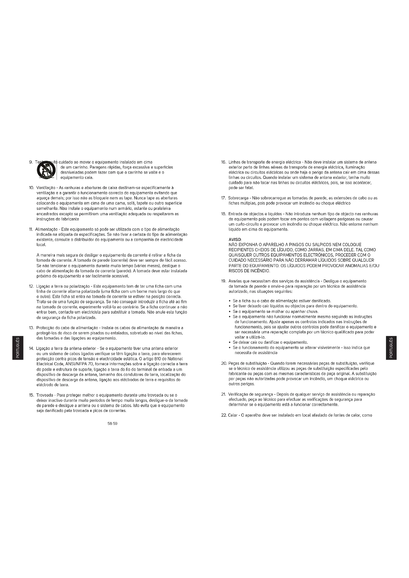 PORTUGUÊS PORTUGUÊS 58 59aquecedores domésticos, grelhas de sistemas de aquecimento, fogões ou outros equipamentos semelhantes (incluindo outros equipamentos) que produzam calor. AVISO PARA REDUZIR O RISCO DE INCÊNDIO OU CHOQUE ELÉCTRICO, NÃO EXPONHA O APARELHO À CHUVA OU HUMIDADE. CUIDADO PARA IMPEDIR A OCORRÊNCIA DE CHOQUES ELÉCTRICOS OU ANOMALIAS NO EQUIPAMENTO INTRODUZIR SEMPRE A FICHA TOTALMENTE NA TOMADA ELÉCTRICA. AVISO As alterações ou modificações que não sejam expressamente aprovadas pela empresa responsável pela conformidade podem anular a autoridade do utilizador para utilizar o equipamento. NOTA Este equipamento foi testado e está em conformidade com os limites para dispositivos digitais Classe B, de acordo com a Parte 15 dos Regulamentos da FCC. Estes limites foram concebidos para garantir a protecção razoável contra interferências prejudiciais numa instalação residencial. Este equipamento gera, utiliza e pode irradiar energia de radiofrequência e, se não for instalado e utilizado de acordo com as instruções, pode causar interferências prejudiciais nas comunicações de rádio. No entanto, não há qualquer garantia de que não possam ocorrer interferências numa instalação em particular. Se este equipamento causar interferências prejudiciais na recepção de rádio ou televisão, o que pode ser determinado ligando e desligando o equipamento, o utilizador deve tentar corrigir a interferência através de uma ou mais das seguintes medidas: