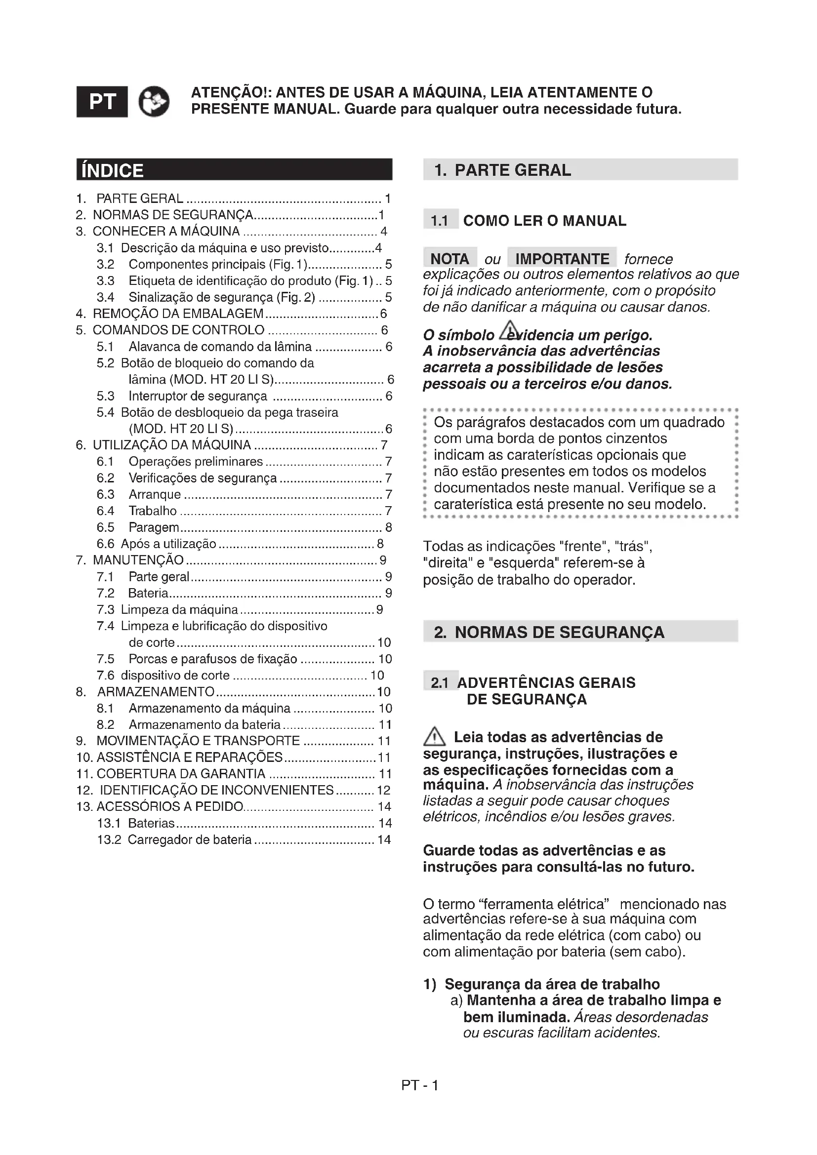 IMPORTANTE As seguintes normas de segurança integram as recomendações de segurança presentes no manual especíco da bateria e do carregador de bateria em anexo à máquina. a) Para carregar a bateria, utilize apenas o carregador de bateria
