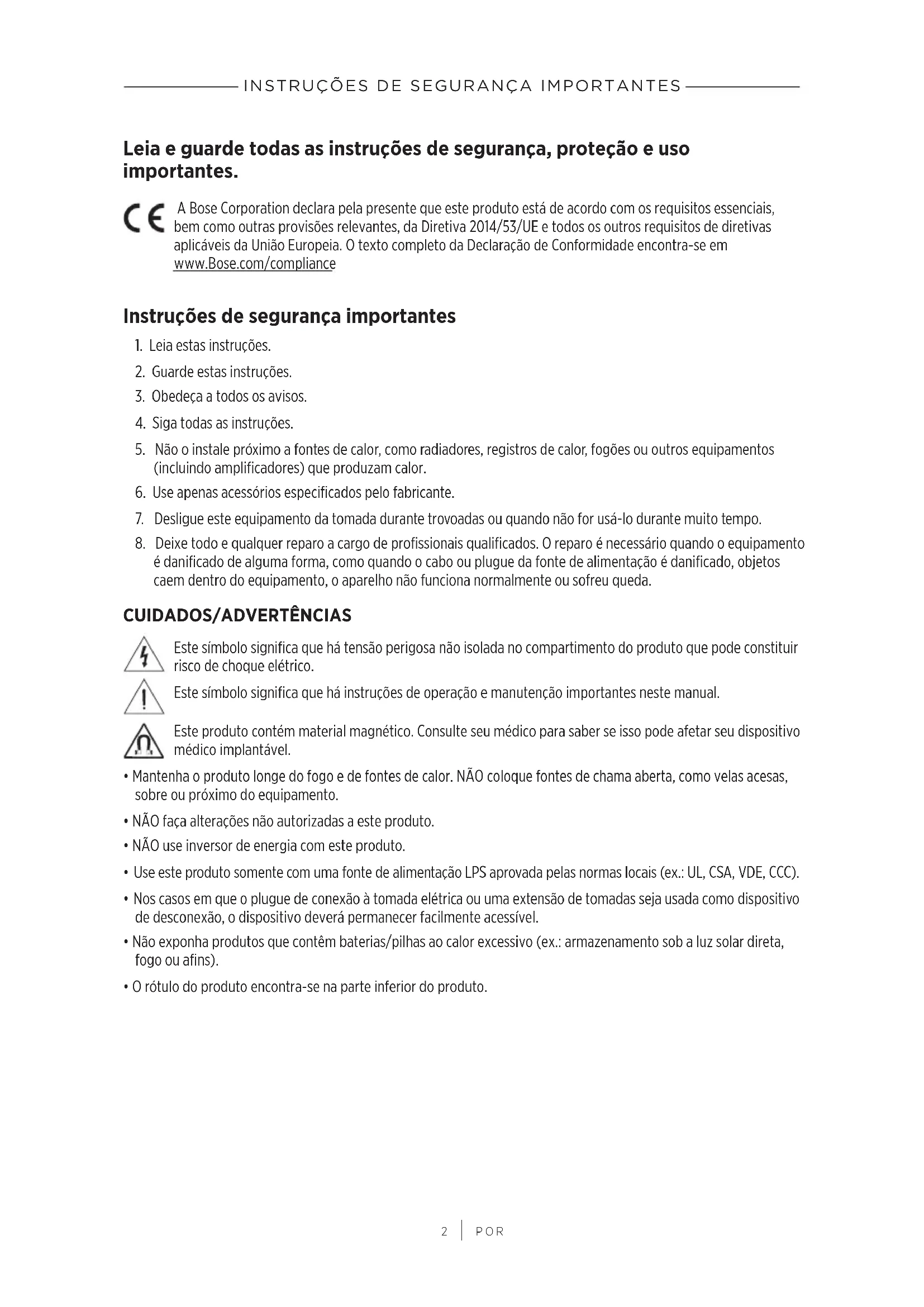 POR Leia e guarde todas as instruções de segurança, proteção e uso importantes. A Bose Corporation declara pela presente que este produto está de acordo com os requisitos essenciais, bemcomo outras provisões relevantes, da Diretiva 2014/53/UE e todos os outros requisitos de diretivas aplicáveis da União Europeia. O texto completo da Declaração de Conformidade encontra-se em www.Bose.com/compliance Instruções de segurança importantes