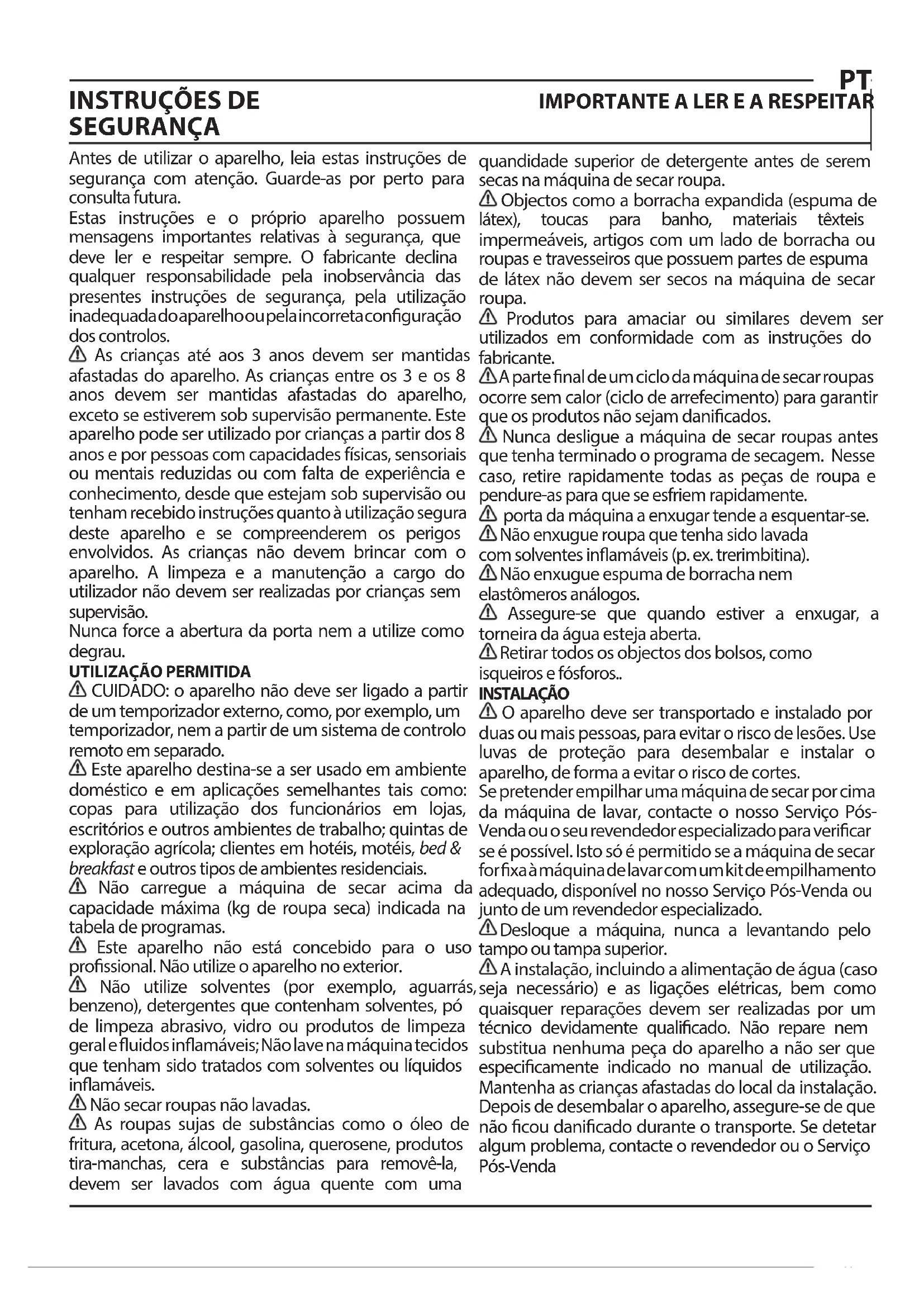 CUIDADO: o aparelho não deve ser ligado a partir de um temporizador externo, como, por exemplo, um temporizador, nem a partir de um sistema de controlo remoto em separado. Este aparelho destina-se a ser usado em ambiente doméstico e em aplicações semelhantes tais como: copas para utilização dos funcionários em lojas, escritórios e outros ambientes de trabalho; quintas de exploração agrícola; clientes em hotéis, motéis, bed & breakfast e outros tipos de ambientes residenciais. Não carregue a máquina de secar acima da capacidade máxima (kg de roupa seca) indicada na tabela de programas. Este aparelho não está concebido para o uso prossional. Não utilize o aparelho no exterior. Não utilize solventes (por exemplo, aguarrás, benzeno), detergentes que contenham solventes, pó de limpeza abrasivo, vidro ou produtos de limpeza geral e uidos inamáveis; Não lave na máquina tecidos que tenham sido tratados com solventes ou líquidos inamáveis. Não secar roupas não lavadas. As roupas sujas de substâncias como o óleo de fritura, acetona, álcool, gasolina, querosene, produtos tira-manchas, cera e substâncias para removê-la, devem ser lavados com água quente com uma quandidade superior de detergente antes de serem secas na máquina de secar roupa. Objectos como a borracha expandida (espuma de látex), toucas para banho, materiais têxteis impermeáveis, artigos com um lado de borracha ou roupas e travesseiros que possuem partes de espuma de látex não devem ser secos na máquina de secar roupa. Produtos para amaciar ou similares devem ser utilizados em conformidade com as instruções do fabricante. A parte nal de um ciclo da máquina de secar roupas ocorre sem calor (ciclo de arrefecimento) para garantir que os produtos não sejam danicados. Nunca desligue a máquina de secar roupas antes que tenha terminado o programa de secagem. Nesse caso, retire rapidamente todas as peças de roupa e pendure-as para que se esfriem rapidamente. porta da máquina a enxugar tende a esquentar-se. Não enxugue roupa que tenha sido lavada com solventes inamáveis (p. ex. trerimbitina). Não enxugue espuma de borracha nem elastômeros análogos. Assegure-se que quando estiver a enxugar, a torneira da água esteja aberta. Retirar todos os objectos dos bolsos, como isqueiros e fósforos.. INSTALAÇÃO O aparelho deve ser transportado e instalado por duas ou mais pessoas, para evitar o risco de lesões. Use luvas de proteção para desembalar e instalar o aparelho, de forma a evitar o risco de cortes. Se pretender empilhar uma máquina de secar por cima da máquina de lavar, contacte o nosso Serviço Pós- Venda ou o seu revendedor especializado para vericar se é possível. Isto só é permitido se a máquina de secar for xa à máquina de lavar com um kit de empilhamento adequado, disponível no nosso Serviço Pós-Venda ou junto de um revendedor especializado. Desloque a máquina, nunca a levantando pelo tampo ou tampa superior. A instalação, incluindo a alimentação de água (caso seja necessário) e as ligações elétricas, bem como quaisquer reparações devem ser realizadas por um técnico devidamente qualicado. Não repare nem substitua nenhuma peça do aparelho a não ser que especicamente indicado no manual de utilização. Mantenha as crianças afastadas do local da instalação. Depois de desembalar o aparelho, assegure-se de que não cou danicado durante o transporte. Se detetar algum problema, contacte o revendedor ou o Serviço Pós-Vendamais próximo. Uma vez instalado o aparelho, os elementos da embalagem (plástico, peças de esferovite, etc.) devem ser armazenados longe do alcance das crianças - risco de asxia. Deve desligar o aparelho da corrente elétrica antes de efetuar qualquer operação de instalação, para evitar o risco de choques elétricos. Durante a instalação, certique-se de que o aparelho não danica o cabo de alimentação, pois existe o risco de incêndio ou de choques elétricos. Ligue o aparelho apenas depois de concluída a instalação do mesmo. Não instale o aparelho em locais onde possa estar exposto a condições extremas, tais como: deciente ventilação, temperatura inferior a 5 °C ou superior a 35 °C. Ao instalar o aparelho, certique-se de que os quatro pés cam estáveis e corretamente assentes no pavimento e de que ca bem nivelado (utilize um nível de bolha de ar). Caso o aparelho seja instalado sobre madeira ou pavimento utuante (certos tipos de parquet e materiais lamináveis), xe uma folha de contraplacado 60 x 60 x 3 cm (no mínimo) ao pavimento e, em seguida, coloque o aparelho sobre a mesma. Ligue a(s) mangueira(s) de entrada de água à fonte de água, de acordo com as normas da empresa local de abastecimento de água. Para modelos concebidos apenas para enchimento frio: Não ligue a alimentação de água quente. Para modelos com ligação à torneira de água quente: a temperatura de entrada de água quente não deve exceder os 60 °C. A máquina de lavar está equipada com parafusos de transporte para evitar eventuais danos no interior durante o transporte. Antes de pôr a máquina a funcionar, é obrigatório retirar os parafusos de transporte. Após a sua remoção, tape as aberturas com as 4 tampas de plástico incluídas. Após a instalação da máquina de lavar aguarde algumas horas antes de a ativar, para se aclimatar às condições ambientais da sala. Certique-se de que as aberturas de ventilação na base da máquina de lavar (se disponíveis no seu modelo) não estão obstruídas por um tapete ou outro material. Utilize apenas mangueiras novas para ligar o aparelho ao abastecimento de água. Não reutilize conjuntos de tubos antigos. A pressão da alimentação de água tem estar na gama 0,1-1 MPa. Não repare nem substitua qualquer peça do aparelho, exceto se especicamente indicado no manual do utilizador. Utilize apenas o Serviço Pós- Venda autorizado. A reparação por conta própria ou não prossional pod