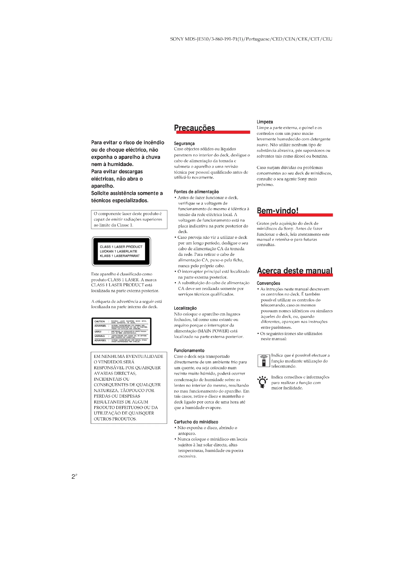 SONY MDS-JE510/3-860-191-71(1)/Portuguese/CED/CEN/CEK/CET/CEU ADVERTÊNCIA Para evitar o risco de incêndio ou de choque eléctrico, não exponha o aparelho à chuva nem à humidade. Para evitar descargas eléctricas, não abra o aparelho. Solicite assistência somente a técnicos especializados. O componente laser deste produto écapaz de emitir radiações superioresao limite da Classe 1.Este aparelho é classificado comoproduto CLASS 1 LASER. A marcaCLASS 1 LASER PRODUCT estálocalizada na parte externa posterior.A etiqueta de advertência a seguir estálocalizada na parte interna do deck. Precauções SegurançaCaso objectos sólidos ou líquidospenetrem no interior do deck, desligue ocabo de alimentação da tomada esubmeta o aparelho a uma revisãotécnica por pessoal qualificado antes deutilizá-lo novamente.Fontes de alimentação• Antes de fazer funcionar o deck,verifique se a voltagem defuncionamento do mesmo é idêntica àtensão da rede eléctrica local. Avoltagem de funcionamento está naplaca indicativa na parte posterior dodeck.• Caso preveja não vir a utilizar o deckpor um longo período, desligue o seucabo de alimentação CA da tomadada rede. Para retirar o cabo dealimentação CA, puxe-o pela ficha,nunca pelo próprio cabo.• O interruptor principal está localizadona parte externa posterior.• A substituição do cabo de alimentaçãoCA deve ser realizada somente porserviços técnicos qualificados.LocalizaçãoNão coloque o aparelho em lugaresfechados, tal como uma estante ouarquivo porque o interruptor daalimentação (MAIN POWER) estálocalizado na parte externa posterior.FuncionamentoCaso o deck seja transportadodirectamente de um ambiente frio paraum quente, ou seja colocado numrecinto muito húmido, poderá ocorrercondensação de humidade sobre aslentes no interior do mesmo, resultandono mau funcionamento do aparelho. Emtais casos, retire o disco e mantenha odeck ligado por cerca de uma hora atéque a humidade evapore.Cartucho do minidisco• Não exponha o disco, abrindo oanteparo.• Nunca coloque o minidisco em locaissujeitos à luz solar directa, altastemperaturas, humidade ou poeiraexcessiva.LimpezaLimpe a parte externa, o painel e oscontrolos com um pano maciolevemente humedecido com detergentesuave. Não utilize nenhum tipo desubstância abrasiva, pós saponáceos ousolventes tais como álcool ou benzina.Caso surjam dúvidas ou problemasconcernentes ao seu deck de minidiscos,consulte o seu agente Sony maispróximo. Bem-vindo! Gratos pela aquisição do deck deminidiscos da Sony. Antes de fazerfuncionar o deck, leia atentamente estemanual e retenha-o para futurasconsultas. Acerca deste manual Convenções• As intruções neste manual descrevemos controlos no deck. É tambémpossível utilizar os controlos dotelecomando, caso os mesmospossuam nomes idênticos ou similaresàqueles do deck, ou, quandodiferentes, apareçam nas instruçõesentre parênteses.• Os seguintes ícones são utilizadosneste manual: Indica que é possível efectuar afunção mediante utilização dotelecomando. Indica conselhos e informaçõespara realizar a função commaior facilidade.EM NENHUMA EVENTUALIDADEO VENDEDOR SERÁRESPONSÁVEL POR QUAISQUERAVARIAS DIRECTAS,INCIDENTAIS OUCONSEQUENTES DE QUALQUERNATUREZA, TÃOPOUCO PORPERDAS OU DESPESASRESULTANTES DE ALGUMPRODUTO DEFEITUOSO OU DAUTILIZAÇÃO DE QUAISQUEROUTROS PRODUTOS.3