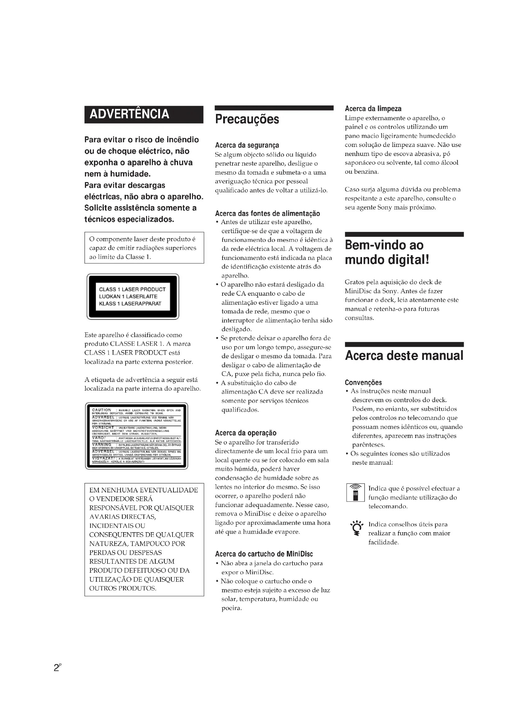ADVERTÊNCIA Para evitar o risco de incêndio ou de choque eléctrico, não exponha o aparelho à chuva nem à humidade. Para evitar descargas eléctricas, não abra o aparelho. Solicite assistência somente a técnicos especializados. O componente laser deste produto écapaz de emitir radiações superioresao limite da Classe 1.Este aparelho é classificado comoproduto CLASSE LASER 1. A marcaCLASS 1 LASER PRODUCT estálocalizada na parte externa posterior.A etiqueta de advertência a seguir estálocalizada na parte interna do aparelho.EM NENHUMA EVENTUALIDADEO VENDEDOR SERÁRESPONSÁVEL POR QUAISQUERAVARIAS DIRECTAS,INCIDENTAIS OUCONSEQUENTES DE QUALQUERNATUREZA, TAMPOUCO PORPERDAS OU DESPESASRESULTANTES DE ALGUMPRODUTO DEFEITUOSO OU DAUTILIZAÇÃO DE QUAISQUEROUTROS PRODUTOS. Precauções Acerca da segurança Se algum objecto sólido ou líquidopenetrar neste aparelho, desligue omesmo da tomada e submeta-o a umaaveriguação técnica por pessoalqualificado antes de voltar a utilizá-lo. Acerca das fontes de alimentação