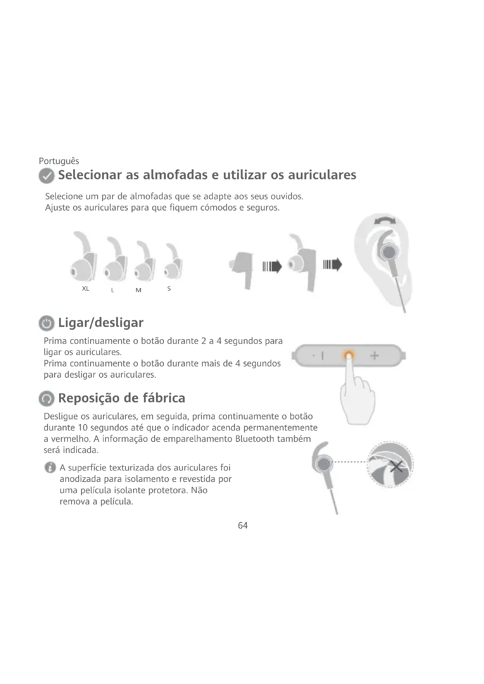 Depois de entrarem no modo Emparelhamento, os auriculares desligam automaticamente se não for estabelecida qualquer ligação dentro de 3 minutos.As operações podem variar ligeiramente, dependendo da marca e das especificações do telemóvel. Em caso de dúvidas, contacte o serviço pós-venda da Huawei para obter assistência. Certifique-se de que os auriculares e o seu telemóvel se encontram no alcance e não existem obstáculos entre eles. Caso contrário, a qualidade da chamada ou da música pode ser comprometida e o Bluetooth pode mesmo desligar. Prima o botão para pausar a música e atender a chamada. Prima o botão novamente para terminar a chamada e retomar a reprodução de música. Receber uma chamada durante a reprodução de música Prima duas vezes o botão para voltar a realizar a última chamada efetuada. Prima o botão novamente para cancelar a chamada. Efetuar novamente uma chamada Prima o botão para terminar a chamada em curso e atender a nova chamada. Prima duas vezes o botão para colocar a chamada em curso em espera e atender a nova chamada. Prima continuamente o botão durante 2-4 segundos até ouvir um som de comando para continuar a chamada em curso e rejeitar a nova chamada. Receber uma chamada durante uma chamada em curso Prima o botão para atender ou prima continuamente o botão durante 2 a 4 segundos para a rejeitar. Receber chamadas no modo de espera