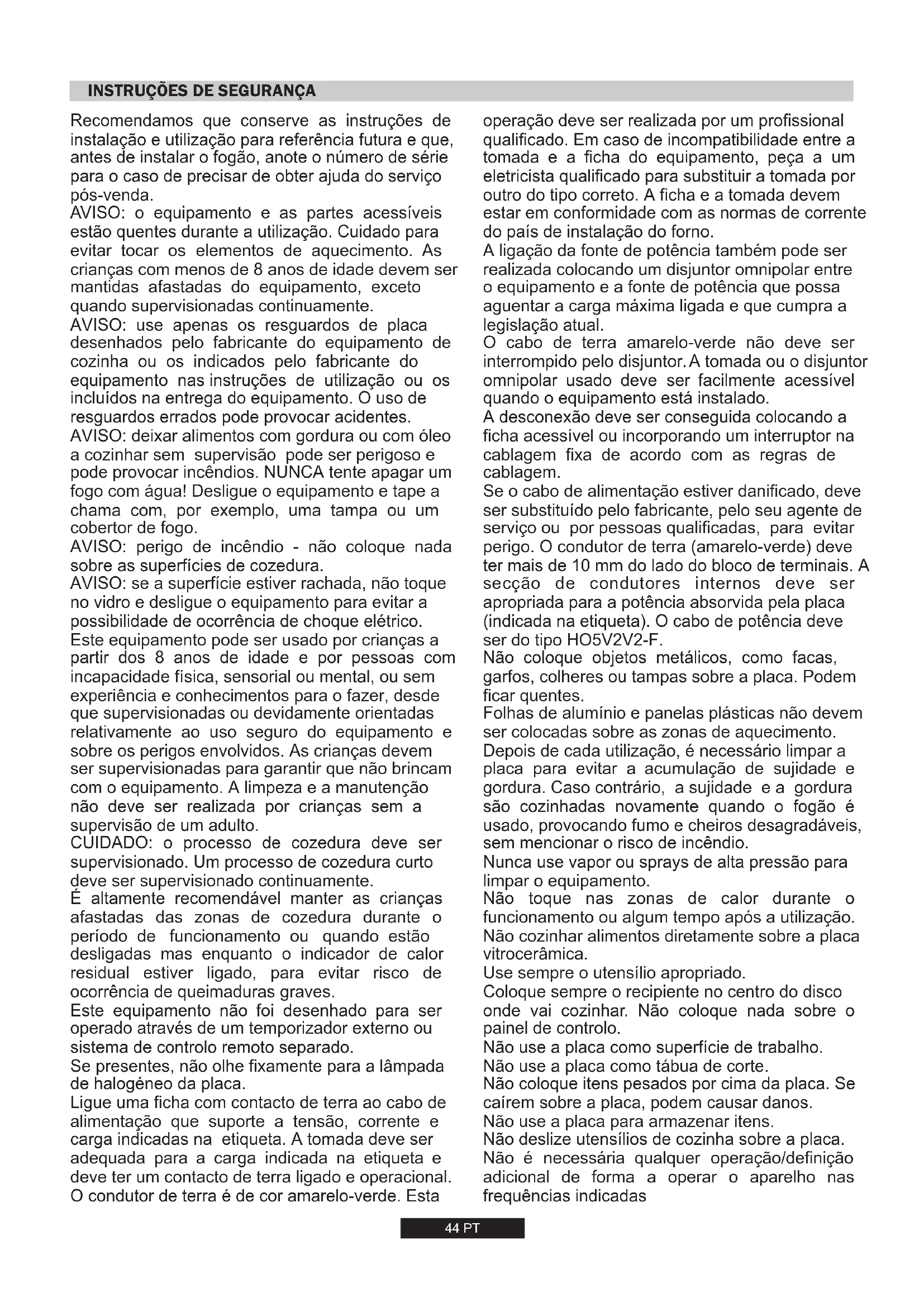 8,7 kW(NG) 8,3 kW(LPG) 829 l/h 604 g/h 220-240 V/ 50-60 Hz44 PT Recomendamos que conserve as instruções de instalação e utilização para referência futura e que, antes de instalar o fogão, anote o número de série para o caso de precisar de obter ajuda do serviço pós-venda. AVISO: o equipamento e as partes acessíveis estão quentes durante a utilização. Cuidado para evitar tocar os elementos de aquecimento. As crianças com menos de 8 anos de idade devem ser mantidas afastadas do equipamento, exceto quando supervisionadas continuamente. AVISO: use apenas os resguardos de placa desenhados pelo fabricante do equipamento de cozinha ou os indicados pelo fabricante do equipamento nas instruções de utilização ou os incluídos na entrega do equipamento. O uso de resguardos errados pode provocar acidentes. AVISO: deixar alimentos com gordura ou com óleo a cozinhar sem supervisão pode ser perigoso e pode provocar incêndios. NUNCA tente apagar um fogo com água! Desligue o equipamento e tape a chama com, por exemplo, uma tampa ou um cobertor de fogo. AVISO: perigo de incêndio - não coloque nada sobre as superfícies de cozedura. AVISO: se a superfície estiver rachada, não toque no vidro e desligue o equipamento para evitar a possibilidade de ocorrência de choque elétrico. Este equipamento pode ser usado por crianças a partir dos 8 anos de idade e por pessoas com incapacidade física, sensorial ou mental, ou sem experiência e conhecimentos para o fazer, desde que supervisionadas ou devidamente orientadas relativamente ao uso seguro do equipamento e sobre os perigos envolvidos. As crianças devem ser supervisionadas para garantir que não brincam com o equipamento. A limpeza e a manutenção não deve ser realizada por crianças sem a supervisão de um adulto. CUIDADO: o processo de cozedura deve ser supervisionado. Um processo de cozedura curto deve ser supervisionado continuamente. É altamente recomendável manter as crianças afastadas das zonas de cozedura durante o período de funcionamento ou quando estão desligadas mas enquanto o indicador de calor residual estiver ligado, para evitar risco de ocorrência de queimaduras graves. Este equipamento não foi desenhado para ser operado através de um temporizador externo ou sistema de controlo remoto separado. Se presentes, não olhe fixamente para a lâmpada de halogéneo da placa. Ligue uma ficha com contacto de terra ao cabo de alimentação que suporte a tensão, corrente e carga indicadas na etiqueta. A tomada deve ser adequada para a carga indicada na etiqueta e deve ter um contacto de terra ligado e operacional. O condutor de terra é de cor amarelo-verde. Esta