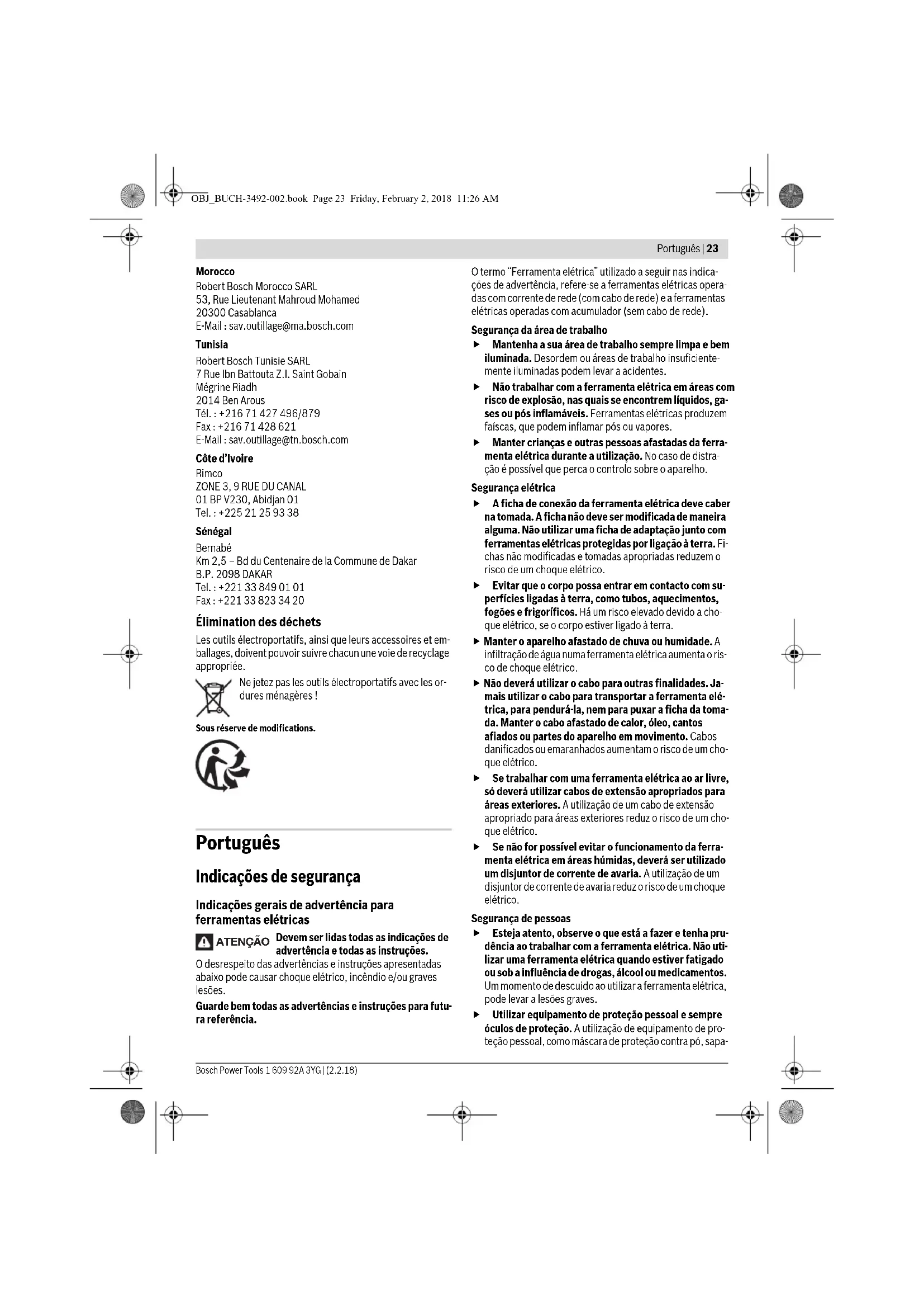 Tel. : +221 33 849 01 01 Fax : +221 33 823 34 20 Élimination des déchets Les outils électroportatifs, ainsi que leurs accessoires et em- ballages, doivent pouvoir suivre chacun une voie de recyclage appropriée. Ne jetez pas les outils électroportatifs avec les or- dures ménagères ! Sous réserve de modifications. Português Indicações de segurança Indicações gerais de advertência para ferramentas elétricas Devem ser lidas todas as indicações de advertência e todas as instruções. O desrespeito das advertências e instruções apresentadas abaixo pode causar choque elétrico, incêndio e/ou graves lesões. Guarde bem todas as advertências e instruções para futu- ra referência. O termo “Ferramenta elétrica” utilizado a seguir nas indica- ções de advertência, refere-se a ferramentas elétricas opera- das com corrente de rede (com cabo de rede) e a ferramentas elétricas operadas com acumulador (sem cabo de rede). Segurança da área de trabalho Mantenha a sua área de trabalho sempre limpa e bem iluminada. Desordem ou áreas de trabalho insuficiente- mente iluminadas podem levar a acidentes. Não trabalhar com a ferramenta elétrica em áreas com risco de explosão, nas quais se encontrem líquidos, ga- ses ou pós inflamáveis. Ferramentas elétricas produzem faíscas, que podem inflamar pós ou vapores. Manter crianças e outras pessoas afastadas da ferra- menta elétrica durante a utilização. No caso de distra- ção é possível que perca o controlo sobre o aparelho. Segurança elétrica A ficha de conexão da ferramenta elétrica deve caber na tomada. A ficha não deve ser modificada de maneira alguma. Não utilizar uma ficha de adaptação junto com ferramentas elétricas protegidas por ligação à terra. Fi- chas não modificadas e tomadas apropriadas reduzem o risco de um choque elétrico. Evitar que o corpo possa entrar em contacto com su- perfícies ligadas à terra, como tubos, aquecimentos, fogões e frigoríficos. Há um risco elevado devido a cho- que elétrico, se o corpo estiver ligado à terra. Manter o aparelho afastado de chuva ou humidade. A infiltração de água numa ferramenta elétrica aumenta o ris- co de choque elétrico. Não deverá utilizar o cabo para outras finalidades. Ja- mais utilizar o cabo para transportar a ferramenta elé- trica, para pendurá-la, nem para puxar a ficha da toma- da. Manter o cabo afastado de calor, óleo, cantos afiados ou partes do aparelho em movimento. Cabos danificados ou emaranhados aumentam o risco de um cho- que elétrico. Se trabalhar com uma ferramenta elétrica ao ar livre, só deverá utilizar cabos de extensão apropriados para áreas exteriores. A utilização de um cabo de extensão apropriado para áreas exteriores reduz o risco de um cho- que elétrico. Se não for possível evitar o funcionamento da ferra- menta elétrica em áreas húmidas, deverá ser utilizado um disjuntor de corrente de avaria. A utilização de um disjuntor de corrente de avaria reduz o risco de um choque elétrico. Segurança de pessoas Esteja atento, observe o que está a fazer e tenha pru- dência ao trabalhar com a ferramenta elétrica. Não uti- lizar uma ferramenta elétrica quando estiver fatigado ou sob a influência de drogas, álcool ou medicamentos. Um momento de descuido ao utilizar a ferramenta elétrica, pode levar a lesões graves. Utilizar equipamento de proteção pessoal e sempre óculos de proteção. A utilização de equipamento de pro- teção pessoal, como máscara de proteção contra pó, sapa- ATENÇÃO OBJ_BUCH-3492-002.book Page 23 Friday, February 2, 2018 11:26 AM24 | Português 1 609 92A 3YG | (2.2.18) Bosch Power Tools tos de segurança antiderrapantes, capacete de segurança ou proteção auricular, de acordo com o tipo e aplicação da ferramenta elétrica, reduz o risco de lesões. Evitar uma colocação em funcionamento involuntária. Assegure-se de que a ferramenta elétrica esteja desli- gada, antes de conectá-la à alimentação de rede e/ou ao acumulador, antes de levantá-la ou de transportá-la. Se tiver o dedo no interruptor ao transportar a ferramenta elétrica ou se o aparelho for conectado à alimentação de rede enquanto estiver ligado, poderão ocorrer acidentes. Remover ferramentas de ajuste ou chaves de boca an- tes de ligar a ferramenta elétrica. Uma ferramenta ou chave que se encontre numa parte do aparelho em movi- mento pode levar a lesões. Evite uma posição anormal. Mantenha uma posição fir- me e mantenha sempre o equilíbrio. Desta forma é mais fácil controlar a ferramenta elétrica em situações inespera- das. Usar roupa apropriada. Não usar roupa larga nem joias. Mantenha os cabelos, roupas e luvas afastadas de par- tes em movimento. Roupas frouxas, cabelos longos ou joias podem ser agarrados por peças em movimento. Se for possível montar dispositivos de aspiração ou de recolha, assegure-se de que estejam conectados e uti- lizados corretamente. A utilização de uma aspiração de pó pode reduzir o perigo devido ao pó. Utilização e manuseio cuidadoso de ferramentas elétricas Não sobrecarregue o aparelho. Utilize a ferramenta elétrica apropriada para o seu trabalho. É melhor e mais seguro trabalhar com a ferramenta elétrica apropriada na área de potência indicada. Não utilizar uma ferramenta elétrica com um interrup- tor defeituoso. Uma ferramenta elétrica que não pode mais ser ligada nem desligada, é perigosa e deve ser repa- rada. Puxar a ficha da tomada e/ou remover o acumulador antes de executar ajustes no aparelho, de substituir acessórios ou de guardar o aparelho. Esta medida de se- gurança evita o arranque involuntário da ferramenta elétri- ca. Guardar ferramentas elétricas não utilizadas fora do al- cance de crianças. Não permita que pessoas que não estejam familiarizadas com o aparelho ou que não te- nham lido estas instruções, utilizem o aparelho. Ferra- mentas elétricas são perigosas se forem utilizadas p