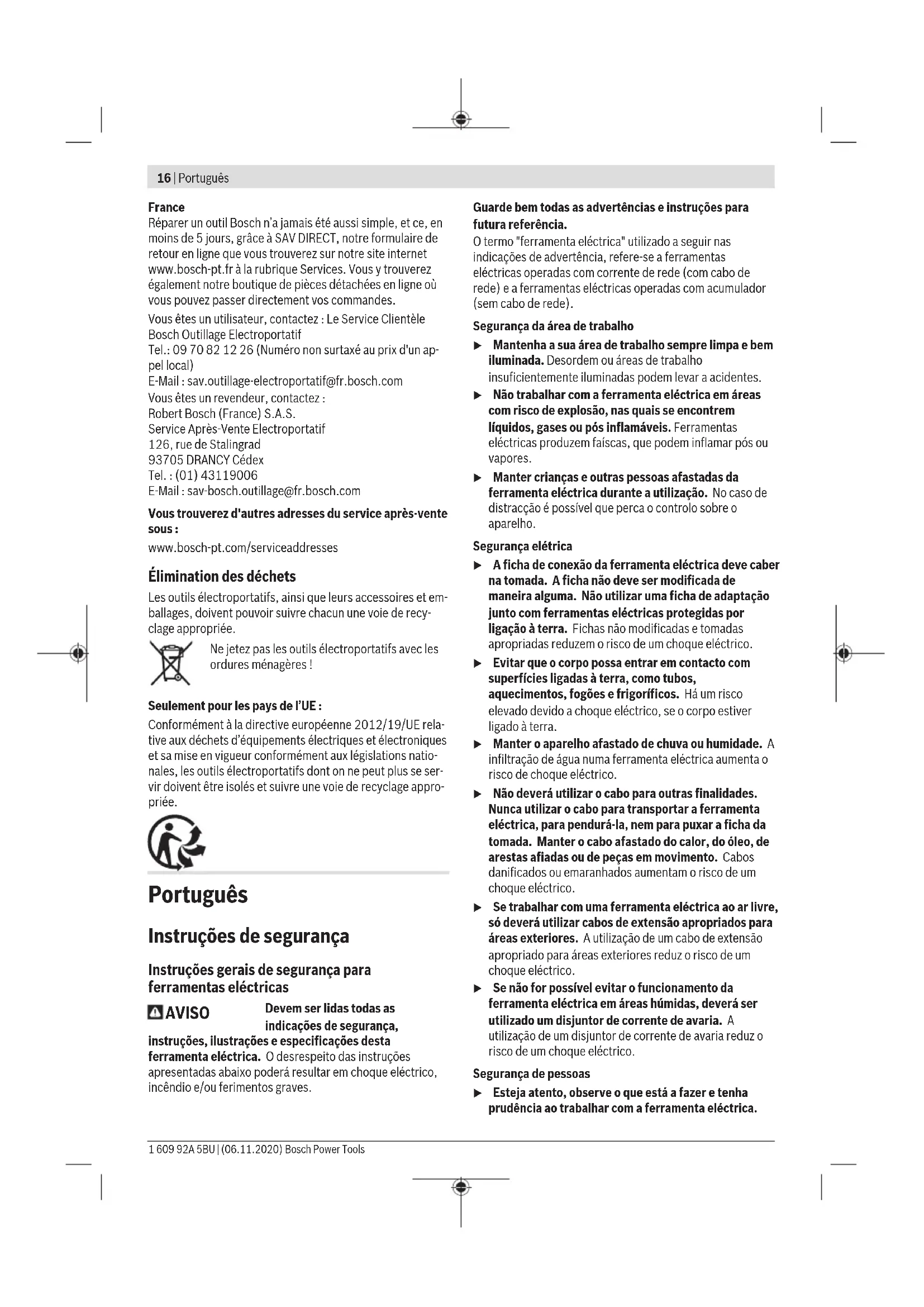 Coloque a ferramenta elétrica numa base estável, p.ex. na bancada de trabalho. Segure a chave de boca (19) e solte o mandril de aperto rápido (1) rodando a chave sextavada interior no interior (18) no sentido ➊. O mandril de aperto rápido preso se solta com uma leve pancada no cabo da chave sextavada interior no interior (18). Retire a chave sextavada interior do interior do mandril de aperto rápido e aperte por completo o mandril de aperto rápido. A desmontagem do mandril de coroa dentada (15) ocorre da mesma forma do mandril de aperto rápido. Montar o mandril de brocas (ver figura F) A montagem do mandril de aperto rápido ocorre pela ordem inversa. O mandril tem de ser apertado com um torque de aperto de aprox. 30–35Nm. Aspiração de pó/de aparas Pós de materiais, como por exemplo, tintas que contêm chumbo, alguns tipos de madeira, minerais e metais, podem ser nocivos à saúde. O contato com os pós ou a inalação dos mesmos pode provocar reações alérgicas e/ou doenças nas vias respiratórias do utilizador ou das pessoas que se encontrem por perto. Certos pós, como por exemplo pó de carvalho e faia são considerados como sendo cancerígenos, especialmente quando juntos com substâncias para o tratamento de madeiras (cromato, preservadores de madeira). Material que contem amianto só deve ser processado por pessoal especializado. – Assegurar uma boa ventilação do local de trabalho. – É recomendável usar uma máscara de proteção respiratória com filtro da classeP2. Observe as diretrizes, vigentes no seu país, relativas aos materiais a serem trabalhados. u Evitar acúmulos de pó no local de trabalho. Pós podem se inflamar levemente. Funcionamento Colocação em funcionamento u Observar a tensão de rede! A tensão da fonte de corrente elétrica deve coincidir com a indicada na chapa de identificação da ferramenta elétrica. As ferramentas elétricas assinaladas com 230V também podem ser operadas com 220V. Ajustar sentido (ver figura G–H) (GSB10RE/GSB13RE/ GSB16RE) Com o comutador do sentido de rotação (8) pode alterar o sentido de rotação da ferramenta elétrica. No entanto, tal não é possível com o interruptor de ligar/desligar (6) pressionado. Rotação à direita: Para furar e apertar parafusos, pressione o comutador do sentido de rotação (8) para a esquerda até ao limitador. Rotação à esquerda: Para soltar ou desparafusar parafusos e porcas, pressione o comutador do sentido de rotação (8) para a direita até ao limitador. 1 609 92A 5BU | (06.11.2020) Bosch Power ToolsPortuguês do Brasil | 33 Ajustar o modo de operação Furar e parafusar Coloque o comutador (4) no símbolo "Furar". Furar com impacto Coloque o comutador (4) no símbolo "Furar com impacto". O comutador (4) encaixa de forma perceptível e pode ser também acionado com o motor em funcionamento. Ligar e desligar Para ligar a ferramenta elétrica pressione e mantenha pressionado o interruptor de ligar/desligar (6). Para bloquear o interruptor de ligar/desligar pressionado(6) aperte a tecla de bloqueio (5). Para desligar a ferramenta elétrica, solte o interruptor de ligar/desligar (6) ou, se estiver bloqueado com o botão de segurança (5), aperte brevemente o interruptor de ligar/ desligar (6) e solte-o. Ajustar número de rotações/impactos (GSB10RE/ GSB13RE/GSB16RE) É possível regular o número de rotações da ferramenta elétrica ligada, dependendo do quanto o interruptor de ligar/ desligar (6) é pressionado. Uma leve pressão no interruptor de ligar/desligar (6) origina uma rotação baixa. Aumentando a pressão aumenta a rotação. Pré-seleção do número de rotações/impactos (GSB 16 RE) Com o botão de ajuste para pré-seleção do nº de rotações (7) é possível pré-selecionar nº de rotações/impactos também durante o funcionamento. O nº de rotações/impactos necessário depende do material e das condições de trabalho e pode ser verificado através de ensaios práticos. Indicações de trabalho u Antes de todos trabalhos na ferramenta elétrica, retirar o plugue da tomada. u Coloque somente a ferramenta elétrica desligada sobre a porca/parafuso. Ferramentas elétricas rodando podem deslizar. Após trabalhos em longos períodos em baixas rotações, deixar a ferramenta elétrica rodar em vazio em rotação máxima, para arrefecer, durante aprox. 3minutos. Para furar ladrilhos, coloque o comutador (4) no símbolo "Furar". Depois de perfurar o ladrilho, coloque o comutador no símbolo "Furar com impacto" e trabalhe com impacto. Para trabalhar em concreto, pedra e alvenaria use uma broca de metal duro. Para furar metal utilize somente brocas HSS afiadas e em boas condições (HSS = High Speed Steel (Aço rápido)). O programa de acessórios Bosch garante a qualidade adequada. Com o aparelho de afiar brocas (acessórios) pode afiar sem esforço brocas em espiral com um diâmetro de 2,5–10 mm. Manutenção e serviço Manutenção e limpeza u Antes de todos trabalhos na ferramenta elétrica, retirar o plugue da tomada. u Manter a ferramenta elétrica e as aberturas de ventilação sempre limpas, para trabalhar bem e de forma segura. Se for necessário substituir o cabo de força, isto deverá ser realizado pela Bosch ou por uma assistência técnica autorizada para todas as ferramentas elétricas Bosch para evitar riscos de segurança. Serviço pós-venda e assistência ao cliente O serviço pós-venda responde às suas perguntas a respeito de serviços de reparação e de manutenção do seu produto, assim como das peças sobressalentes. Desenhos explodidos e informações sobre peças sobressalentes também em: www.bosch-pt.com A nossa equipe de consultores Bosch esclarece com prazer todas as suas dúvidas a respeito dos nossos produtos e acessórios. Indique em todas as questões ou encomendas de peças sobressalentes impreterivelmente a referência de 10 dígitos de acordo com a placa de características do produto. Encontre outros endere