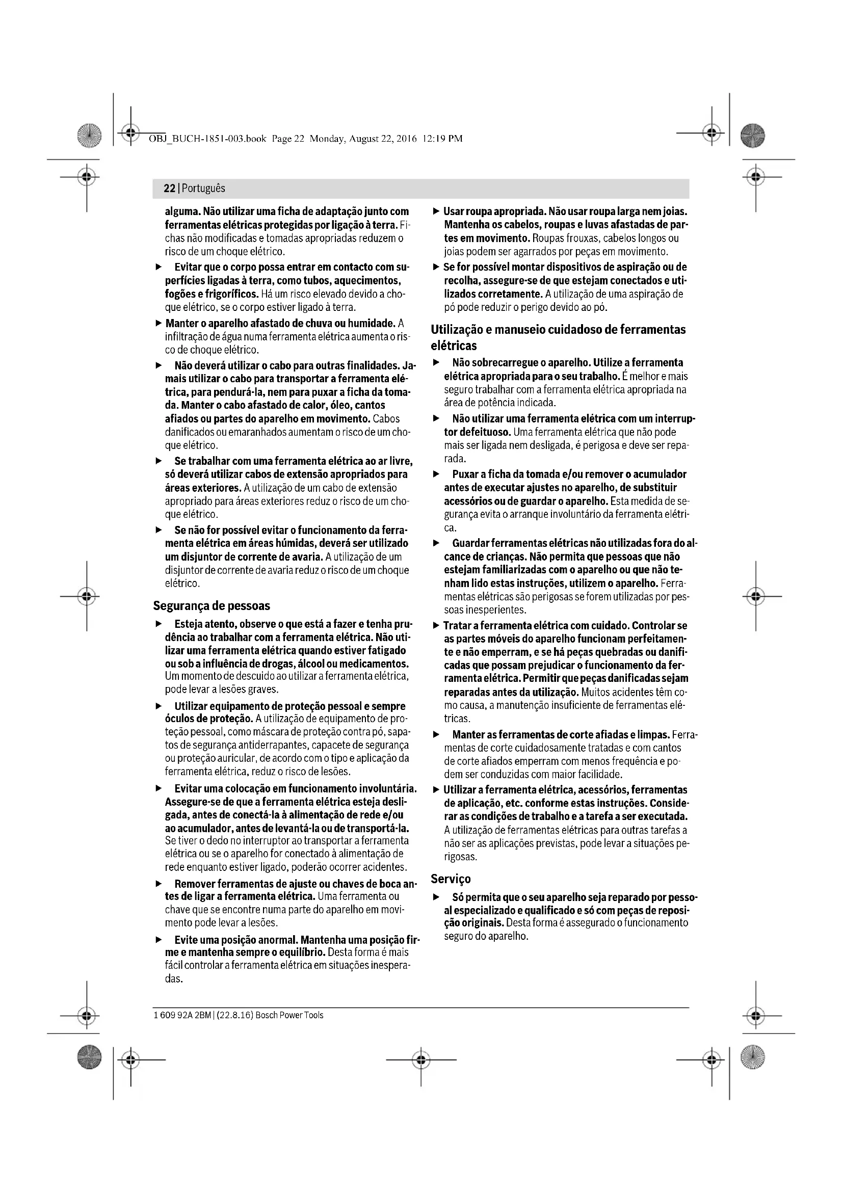 OBJ_BUCH-1851-003.book Page 20 Monday, August 22, 2016 12:19 PMPortuguês | 21 Bosch Power Tools 1 609 92A 2BM | (22.8.16) ce e informaciones sobre las piezas de recambio los podrá ob- tener también en internet bajo: www.bosch-pt.com Nuestro equipo de asesores técnicos le orientará gustosa- mente en cuanto a la adquisición, aplicación y ajuste de los productos y accesorios. Para cualquier consulta o pedido de piezas de repuesto es im- prescindible indicar el nº de artículo de 10 dígitos que figura en la placa de características del producto. España Robert Bosch España S.L.U. Departamento de ventas Herramientas Eléctricas C/Hermanos García Noblejas, 19 28037 Madrid Para efectuar su pedido online de recambios o pedir la recogi- da para la reparación de su máquina, entre en la página www.herramientasbosch.net. Tel. Asesoramiento al cliente: 902 531 553 Fax: 902 531554 Venezuela Robert Bosch S.A. Final Calle Vargas. Edf. Centro Berimer P.B. Boleita Norte Caracas 107 Tel.: (0212) 2074511 México Robert Bosch S. de R.L. de C.V. Calle Robert Bosch No. 405 C.P. 50071 Zona Industrial, Toluca - Estado de México Tel. Interior: (01) 800 6271286 Tel. D.F.: 52843062 E-Mail: arturo.fernandez@mx.bosch.com Argentina Robert Bosch Argentina S.A. Av. Córdoba 5160 C1414BAW Ciudad Autónoma de Buenos Aires Atención al Cliente Tel.: (0810) 5552020 E-Mail: herramientas.bosch@ar.bosch.com Perú Robert Bosch S.A.C. Av. Primavera 781, Urb. Chacarilla, San Borja (Edificio Aldo) Buzón Postal Lima 41 - Lima Tel.: (01) 2190332 Chile Robert Bosch S.A. Calle El Cacique 0258 Providencia – Santiago Tel.: (02) 2405 5500 Ecuador Robert Bosch Sociedad Anonima Ecuabosch Av. Las Monjas nº 10 y Carlos J. Arosamena Guayaquil – Ecuador Tel. (04) 220 4000 Email: atencion.cliente@ec.bosch.com Eliminación Recomendamos que las herramientas eléctricas, accesorios y embalajes sean sometidos a un proceso de recuperación que respete el medio ambiente. ¡No arroje las herramientas eléctricas a la basura! Sólo para los países de la UE: Conforme a la Directiva Europea 2012/19/UE sobre aparatos eléctricos y electrónicos inservibles, tras su transposi- ción en ley nacional, deberán acumularse por separado las herramientas eléctricas pa- ra ser sometidas a un reciclaje ecológico. Reservado el derecho de modificación.El símbolo es solamente vá-lido, si también se encuentra sobre la placa de características del producto/fabricado. Português Indicações gerais de advertência para ferramentas elétricas Devem ser lidas todas as indicações de advertência e todas as instruções. O desrespeito das advertências e instruções apresentadas abaixo pode causar choque elétrico, incêndio e/ou graves lesões. Guarde bem todas as advertências e instruções para futu- ra referência. O termo “Ferramenta elétrica” utilizado a seguir nas indica- ções de advertência, refere-se a ferramentas elétricas opera- das com corrente de rede (com cabo de rede) e a ferramentas elétricas operadas com acumulador (sem cabo de rede). Segurança da área de trabalho Mantenha a sua área de trabalho sempre limpa e bem iluminada. Desordem ou áreas de trabalho insuficiente- mente iluminadas podem levar a acidentes. Não trabalhar com a ferramenta elétrica em áreas com risco de explosão, nas quais se encontrem líquidos, ga- ses ou pós inflamáveis. Ferramentas elétricas produzem faíscas, que podem inflamar pós ou vapores. Manter crianças e outras pessoas afastadas da ferra- menta elétrica durante a utilização. No caso de distra- ção é possível que perca o controlo sobre o aparelho. Segurança elétrica A ficha de conexão da ferramenta elétrica deve caber na tomada. A ficha não deve ser modificada de maneira ATENÇÃO OBJ_BUCH-1851-003.book Page 21 Monday, August 22, 2016 12:19 PM22 | Português 1 609 92A 2BM | (22.8.16) Bosch Power Tools alguma. Não utilizar uma ficha de adaptação junto com ferramentas elétricas protegidas por ligação à terra. Fi- chas não modificadas e tomadas apropriadas reduzem o risco de um choque elétrico. Evitar que o corpo possa entrar em contacto com su- perfícies ligadas à terra, como tubos, aquecimentos, fogões e frigoríficos. Há um risco elevado devido a cho- que elétrico, se o corpo estiver ligado à terra. Manter o aparelho afastado de chuva ou humidade. A infiltração de água numa ferramenta elétrica aumenta o ris- co de choque elétrico. Não deverá utilizar o cabo para outras finalidades. Ja- mais utilizar o cabo para transportar a ferramenta elé- trica, para pendurá-la, nem para puxar a ficha da toma- da. Manter o cabo afastado de calor, óleo, cantos afiados ou partes do aparelho em movimento. Cabos danificados ou emaranhados aumentam o risco de um cho- que elétrico. Se trabalhar com uma ferramenta elétrica ao ar livre, só deverá utilizar cabos de extensão apropriados para áreas exteriores. A utilização de um cabo de extensão apropriado para áreas exteriores reduz o risco de um cho- que elétrico. Se não for possível evitar o funcionamento da ferra- menta elétrica em áreas húmidas, deverá ser utilizado um disjuntor de corrente de avaria. A utilização de um disjuntor de corrente de avaria reduz o risco de um choque elétrico. Segurança de pessoas Esteja atento, observe o que está a fazer e tenha pru- dência ao trabalhar com a ferramenta elétrica. Não uti- lizar uma ferramenta elétrica quando estiver fatigado ou sob a influência de drogas, álcool ou medicamentos. Um momento de descuido ao utilizar a ferramenta elétrica, pode levar a lesões graves. Utilizar equipamento de proteção pessoal e sempre óculos de proteção. A utilização de equipamento de pro- teção pessoal, como máscara de proteção contra pó, sapa- tos de segurança antiderrapantes, capacete de segurança ou proteção auricular, de acordo com o tipo e aplicação da ferramenta elétrica, reduz o risco de lesões. Evitar uma colocação em funcio